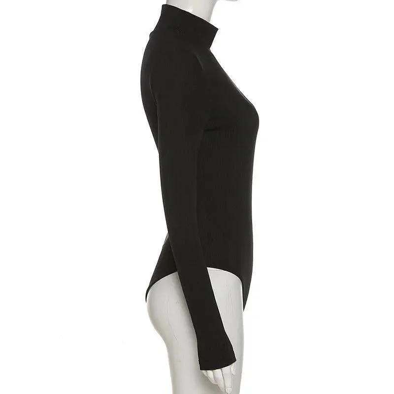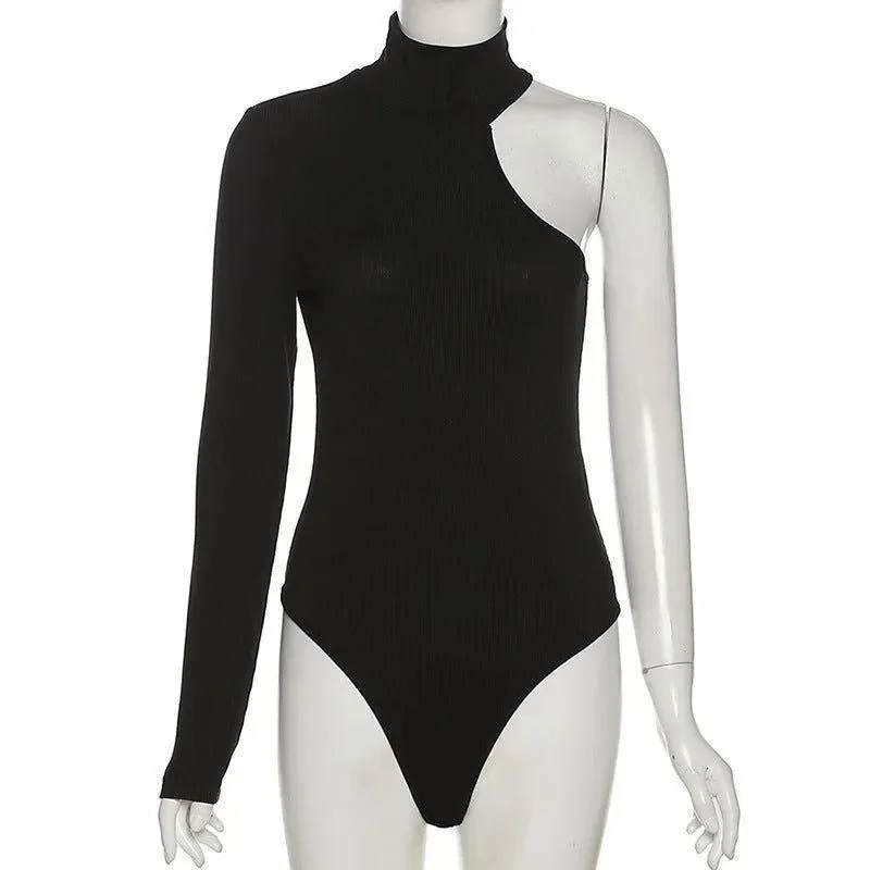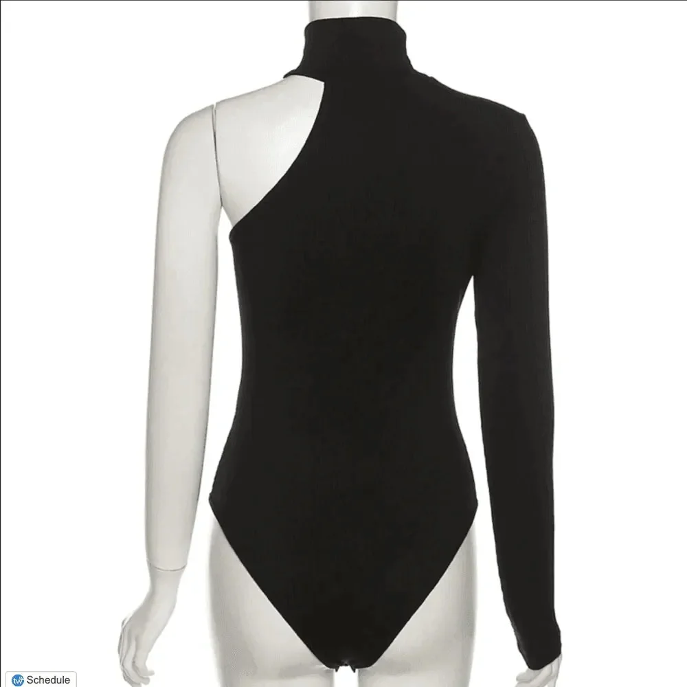 Elevate your wardrobe with our chic One-Shoulder Bodysuit in black. This modern design features a stylish one-shoulder cut and a knitted turtleneck for a sleek and flattering fit. Made from a blend of cotton, polyester, and spandex, this high-quality bodysuit is perfect for any occasion, providing both comfort and sophistication. Pair it with high-waisted jeans or tailored pants for a polished and elegant look that transitions seamlessly from day to night. Explore versatile outfit ideas and enhance your style effortlessly.