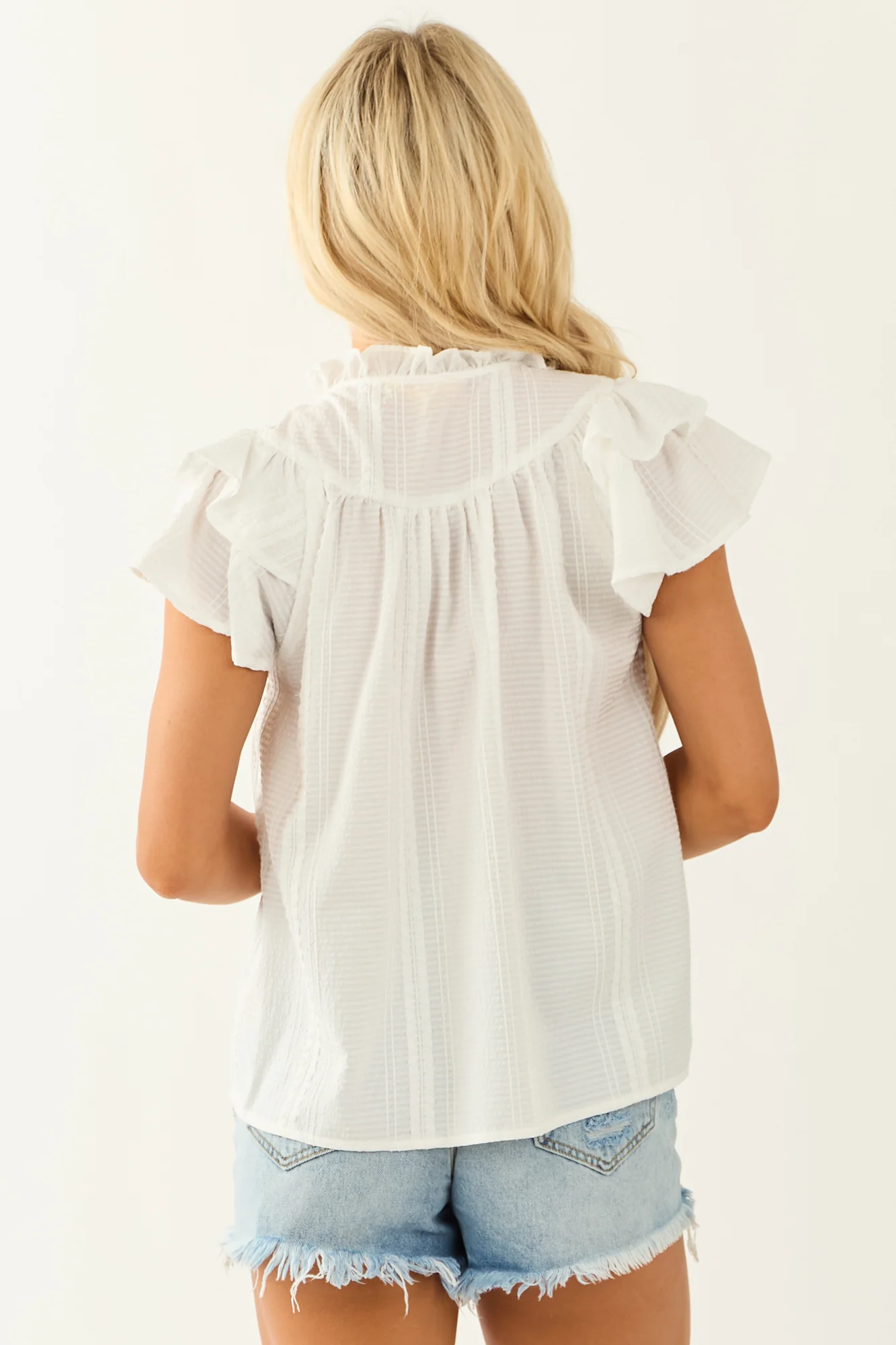 Elevate your style with this chic off-white blouse featuring a high notched V neckline, ruffle trim, and textured cotton fabric. The double ruffle sleeve adds a couture touch to this must-have piece. Effortlessly fashionable and versatile, this blouse is perfect for any occasion. Hand wash cold. Imported.
