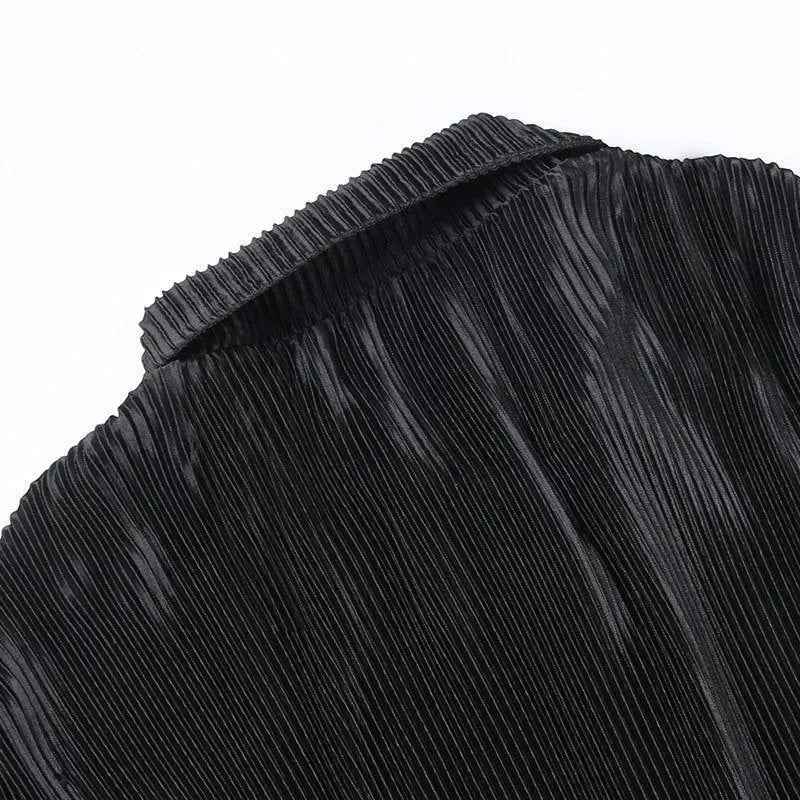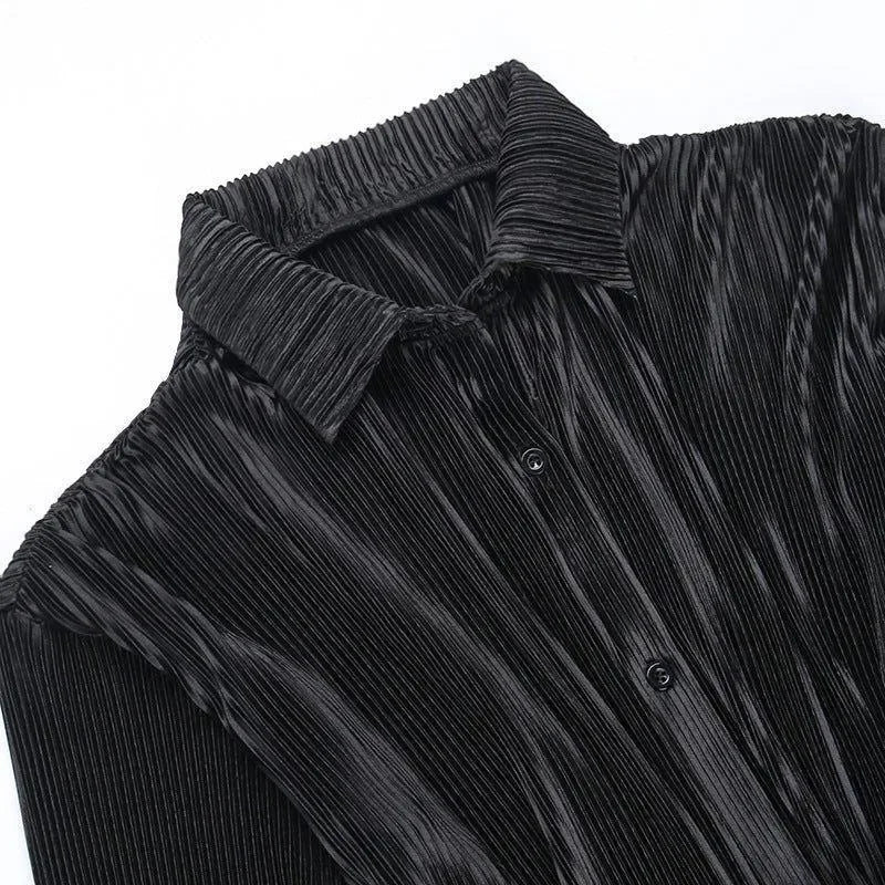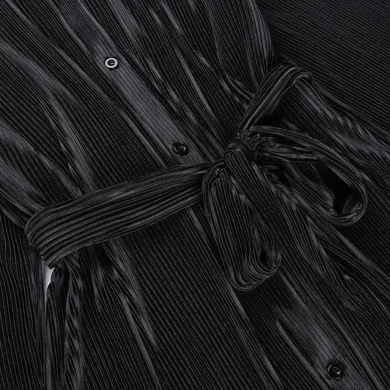 Elevate your wardrobe with our chic Pleated Shirt Dress, combining the classic button-up style with a playful mini dress design. This sophisticated dress is perfect for any occasion, offering both style and comfort. Crafted from high-quality velvet and spandex materials, it enhances your silhouette while maintaining a polished look. Explore outfit ideas and style inspiration on our Instagram @mermaid_way. Instantly elevate your fashion game with this versatile dress. Enjoy the perfect blend of sophistication and comfort with each wear. Long sleeves, wrap style with fixed wrap, pleated fabric, and matching waist tie included.