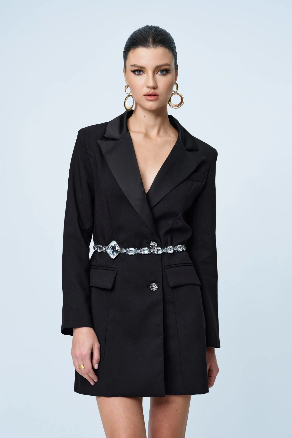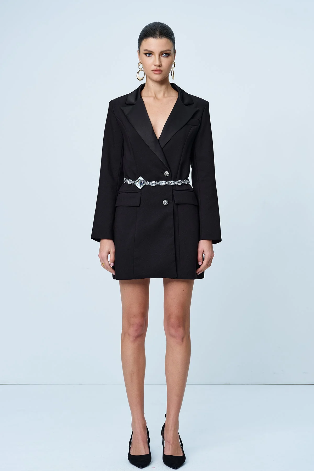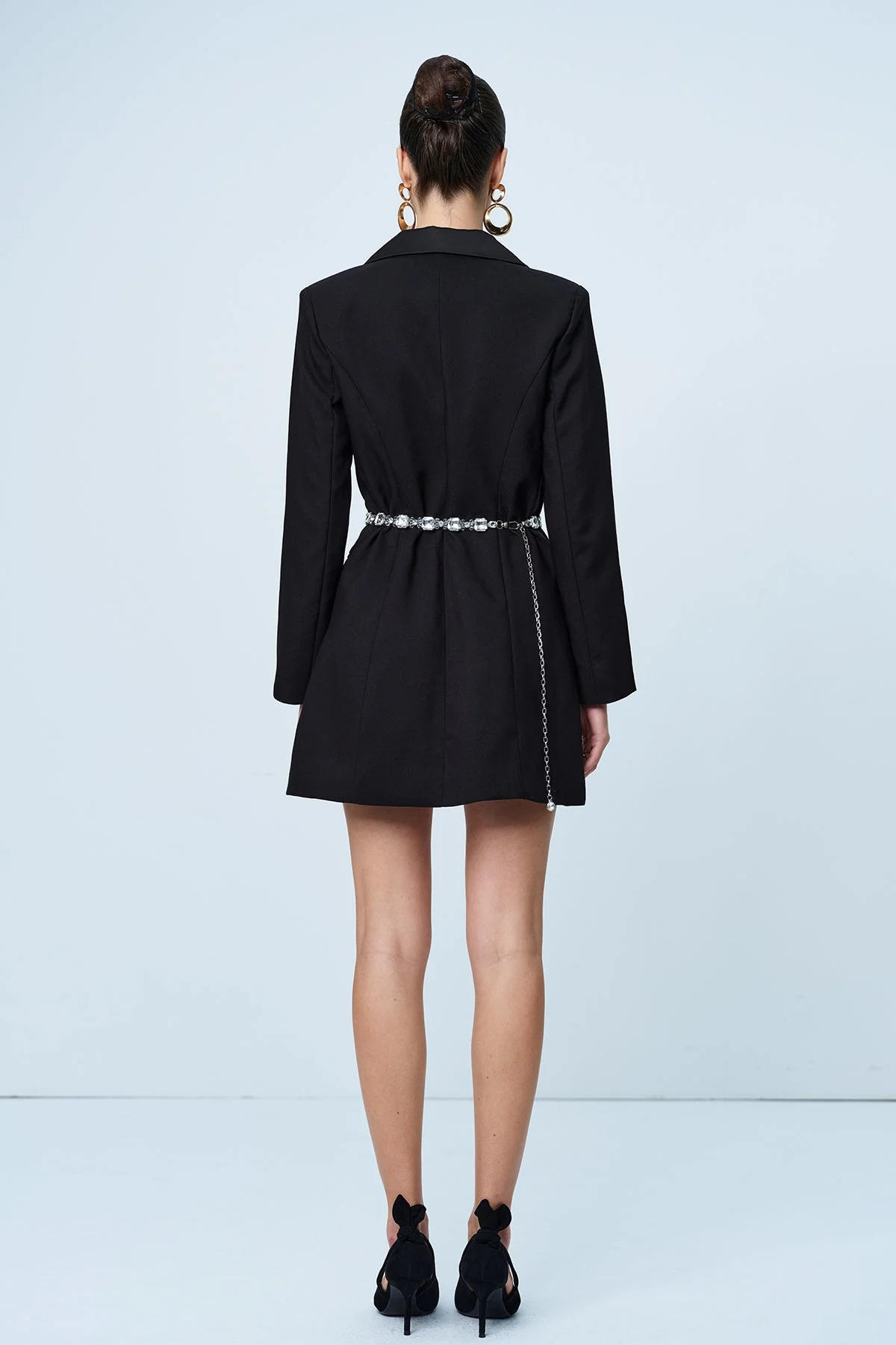 Elevate your style with the Chic Rhinestone Chain Lapel Blazer in glamorous black. This blazer features a stunning rhinestone chain lapel, adding a touch of sophistication to any outfit. Crafted from high-quality materials, this comfortable blazer is perfect for professional or formal occasions. Make a fashion-forward statement with this must-have wardrobe essential. Material: 50% Polyester, 50% Cotton. Stretch Factor: Non-Stretch. Care Instructions: Gentle machine wash. Please note that color may vary due to lighting in images.