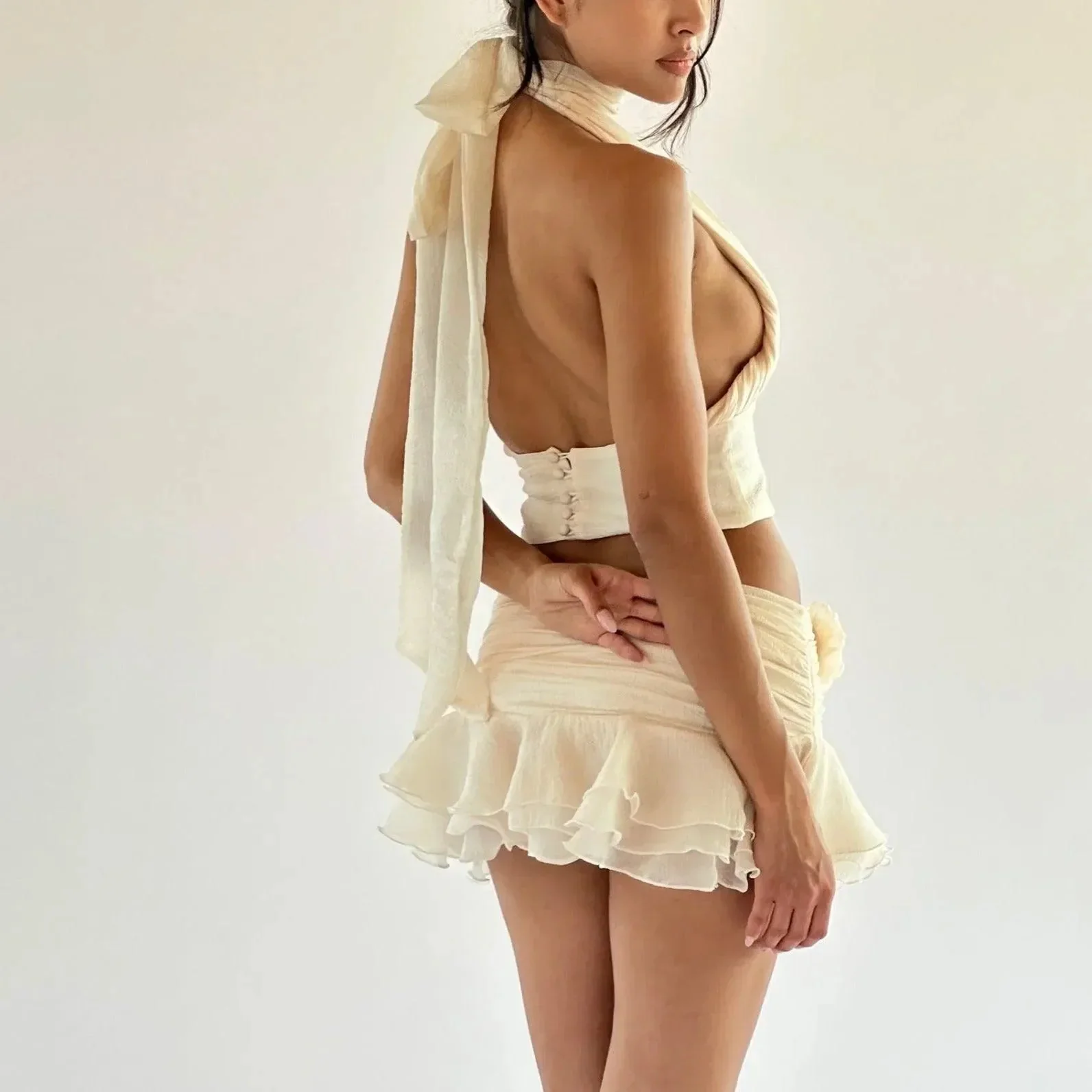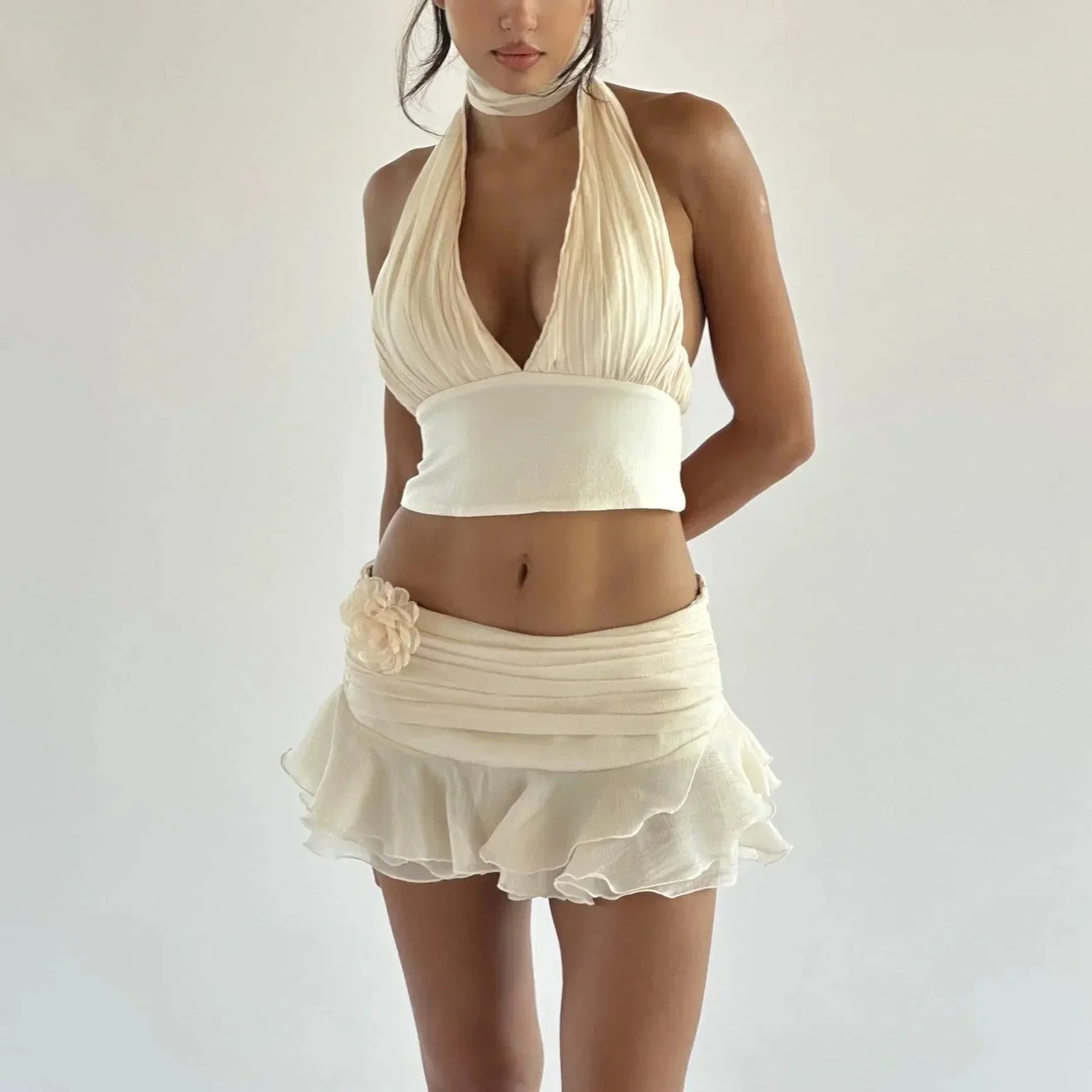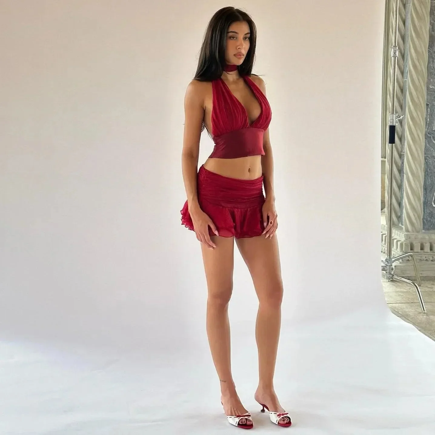 Experience the elegance of our chic satin two-piece set featuring stylish ruffles for a glamorous touch. This set includes a crop top with adjustable straps and high-waisted shorts for unmatched comfort and style. Transition seamlessly from day to night in this versatile outfit crafted with satin for all-day luxury. Pleated banded mini skirt, ruffled V neckline, and tie halter straps enhance the trendy look. Free size exchange available. Get inspired by following us on Instagram @mermaid_way.