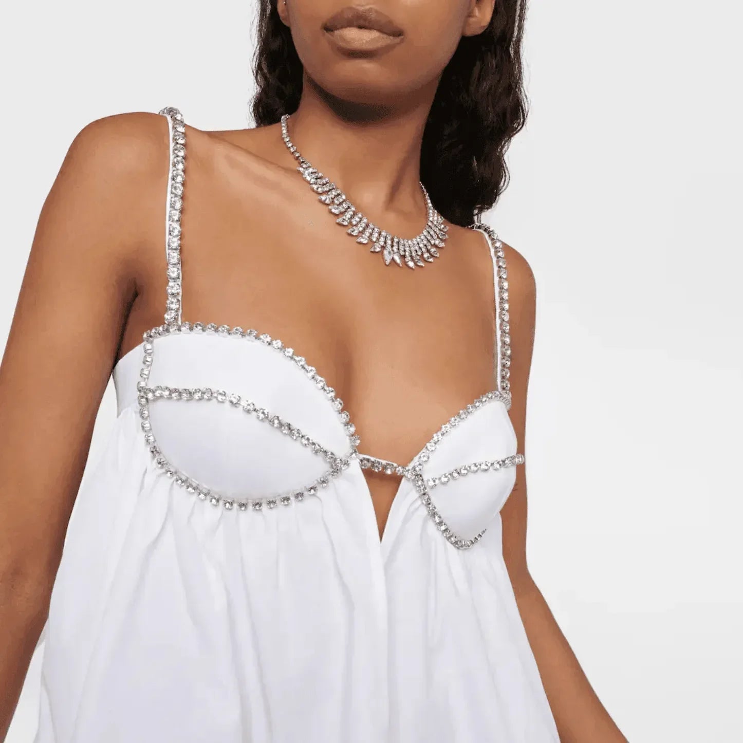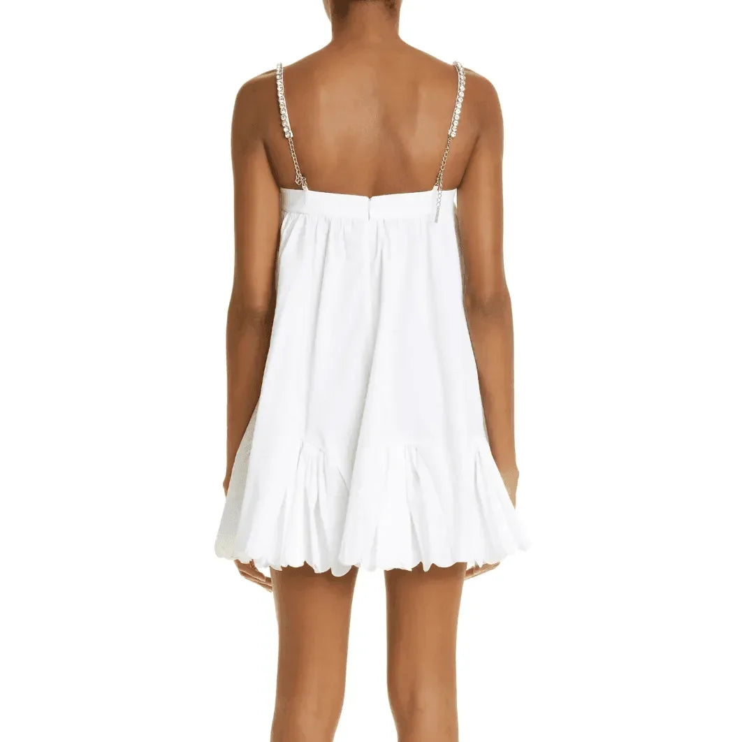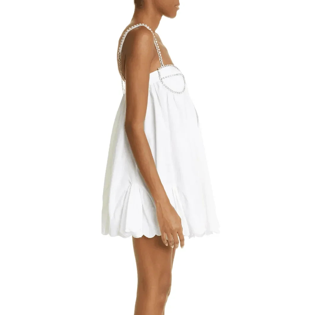 Elevate your wardrobe with this chic Scalloped-Hem Mini Dress in a comfortable cotton-nylon blend. Enjoy the playful scalloped hem detail that adds a flirty touch to any occasion. Stay cool and stylish all day with the lightweight poplin fabric. The fitted bodice enhances your figure, while the open back, crystal detailing, and cut out front design create a standout look. Transition effortlessly from day to night with this versatile must-have piece . Explore fashion inspirations on Instagram @mermaid_way. Take your style to the next level today!