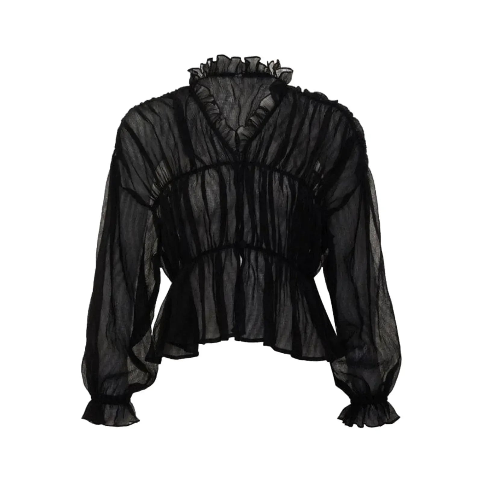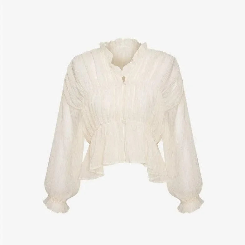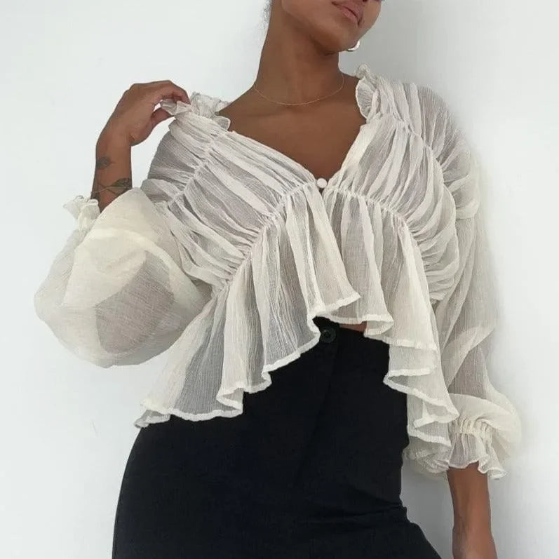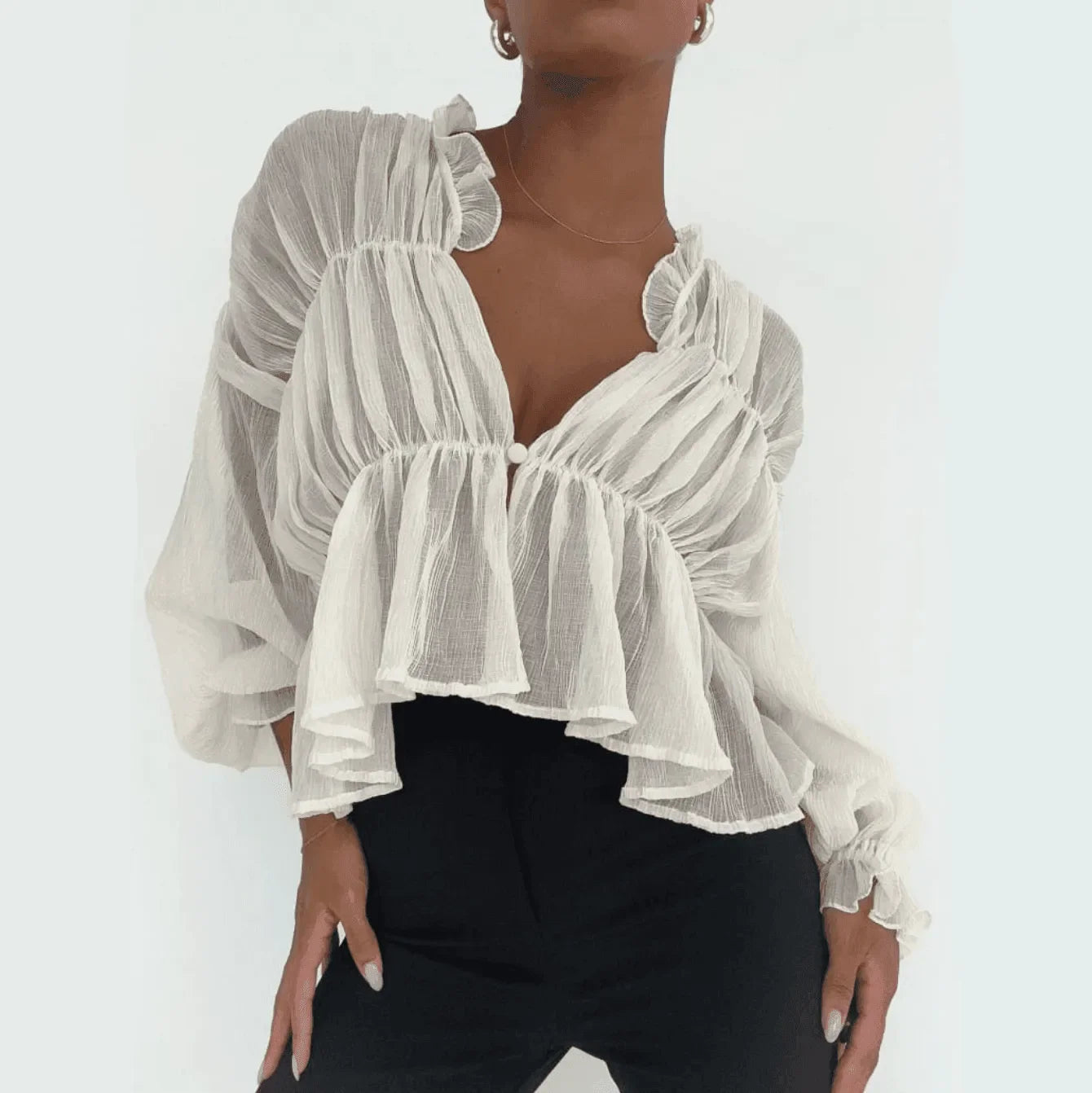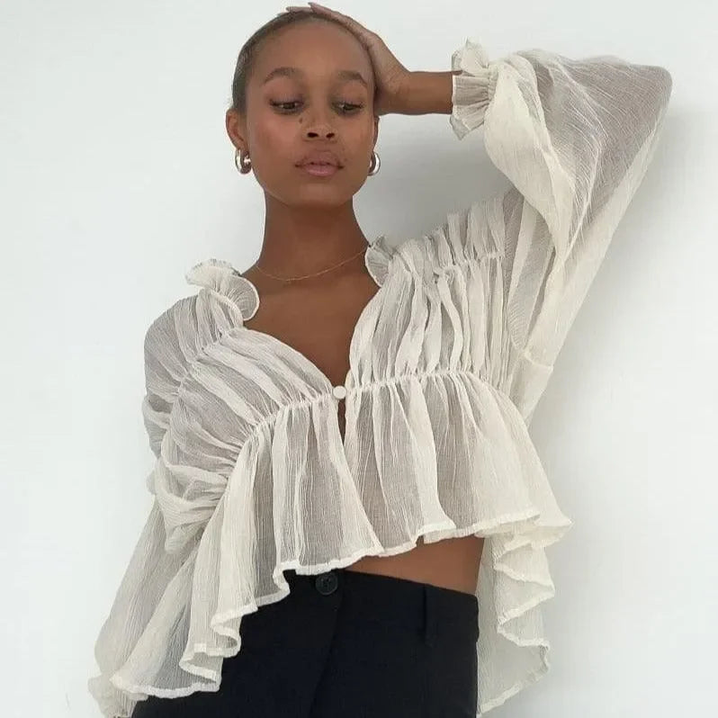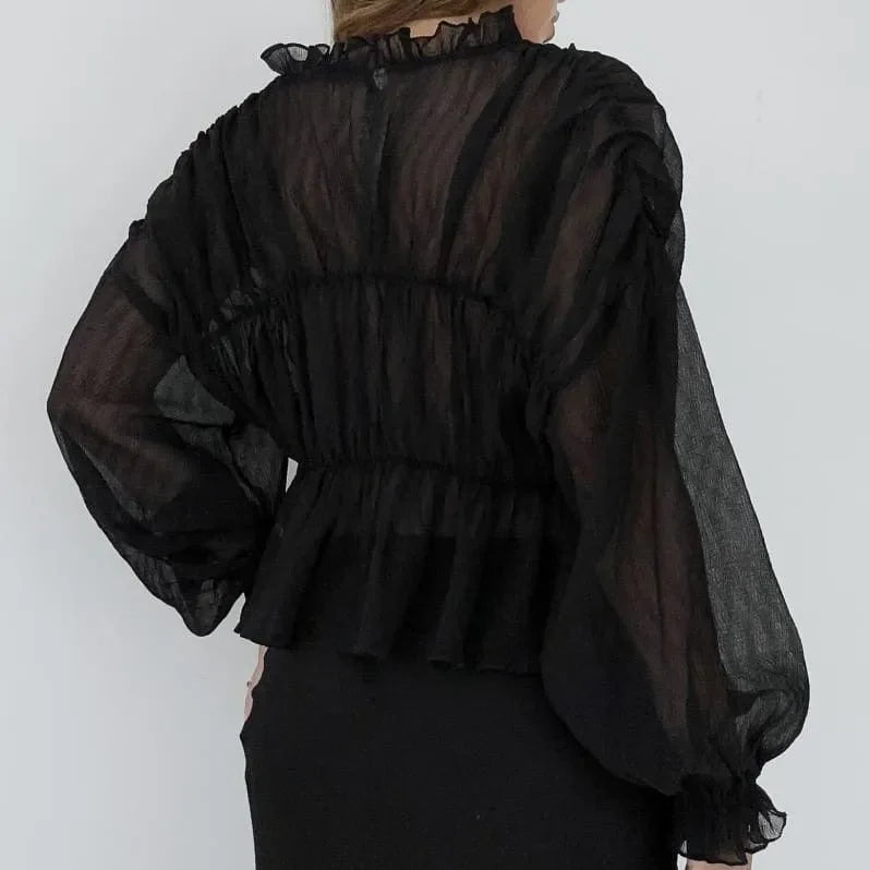 Elevate your style with our Long Sleeve Semi-Sheer Top. Add a touch of elegance with the sheer fabric and sophisticated look of long sleeves. Transition seamlessly from day to night with this versatile, chic design. Lightweight and unlined, this top ensures all-day comfort. Discover effortless style ideas on Instagram @mermaid_way. Featuring semi-sheer fabric, central button closure, ruffle neck trim, and elasticized sleeve cuffs. Enjoy complimentary size exchanges if needed.