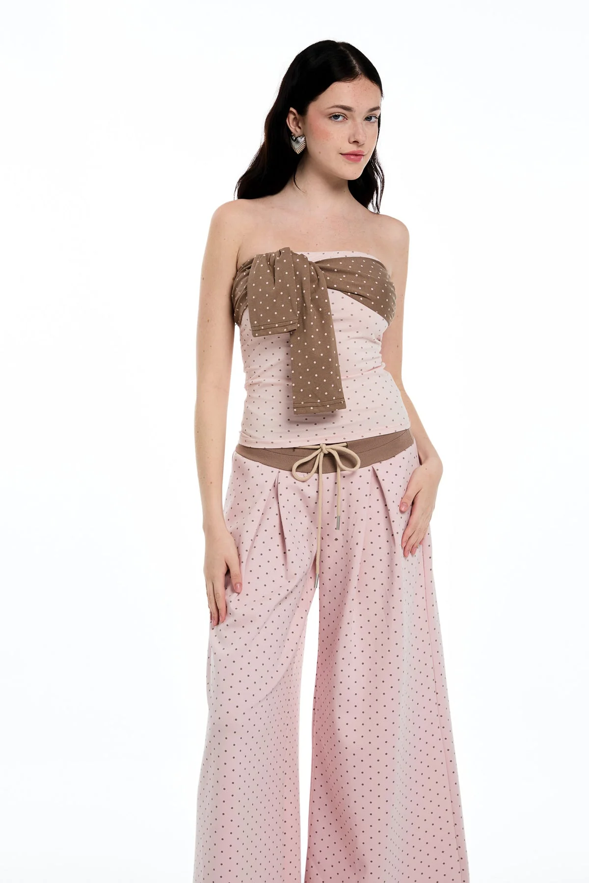 Elevate your wardrobe with the Chic Strapless Polka Dot Pants Set in Pink, a modern and elegant combination. The strapless top accentuates your neckline with a delicate dot pattern adding subtle texture. Paired with tailored pants, this set delivers a streamlined silhouette suitable for formal events and stylish everyday wear. Designed for a refined fit, it ensures comfort while exuding sophistication. This set offers no-stretch fabric, easy to wash, maintaining its vibrant pink color. The color of the product may vary due to lighting in images.