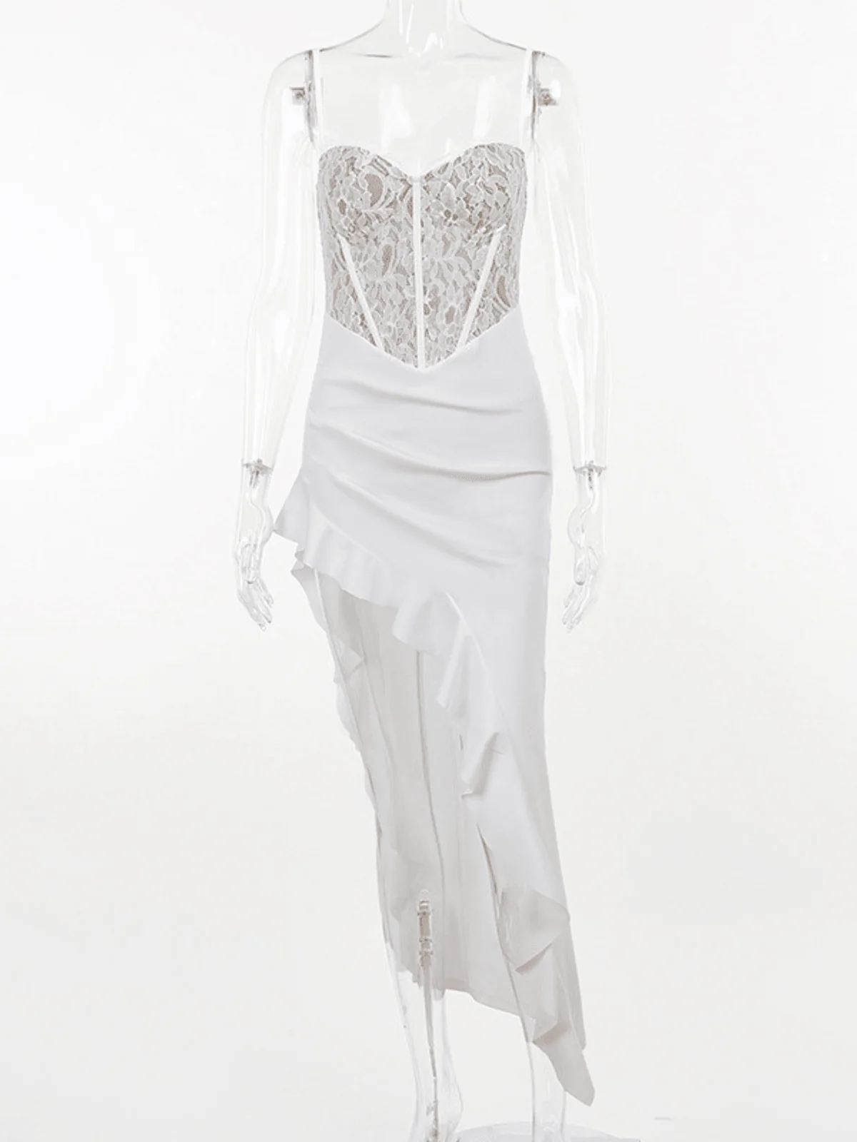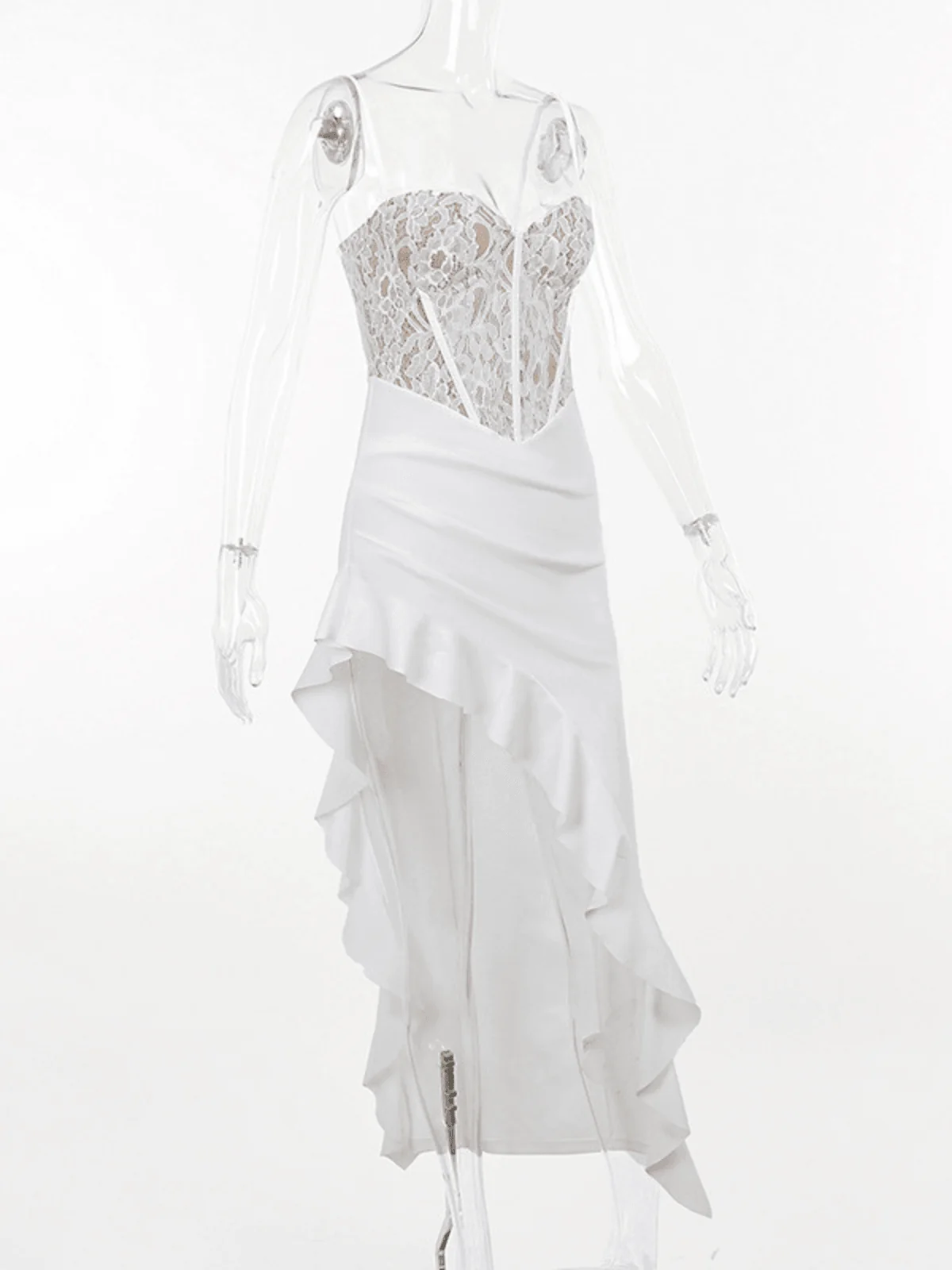 Elevate your style with the Chic White Asymmetric Ruffle Midi Dress expertly crafted from 100% Polyester. This dress features intricate lace detailing, an elegant silhouette, and an asymmetric ruffle design that adds a unique touch. Suitable for special occasions, this dress offers low stretch and easy care. Make a fashion statement with this wardrobe essential. Color may vary due to lighting. Includes: 1x Midi Dress. Size: S, M, L.