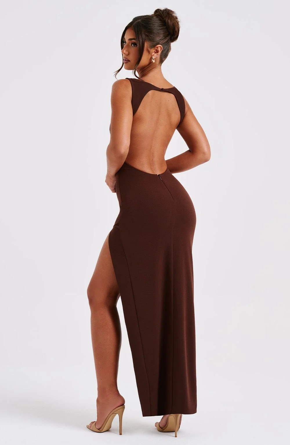 Indulge in elegance with our Chocolate Boat Neck Maxi Dress crafted from exquisite luxury stretch crepe. This stunning maxi features a high boat neckline, low scoop back, and a thigh-high shaped split for a touch of allure. Perfect for formal evenings, proms, parties, and weddings. Fully lined for comfort. Available in sizes XS to XXL.
