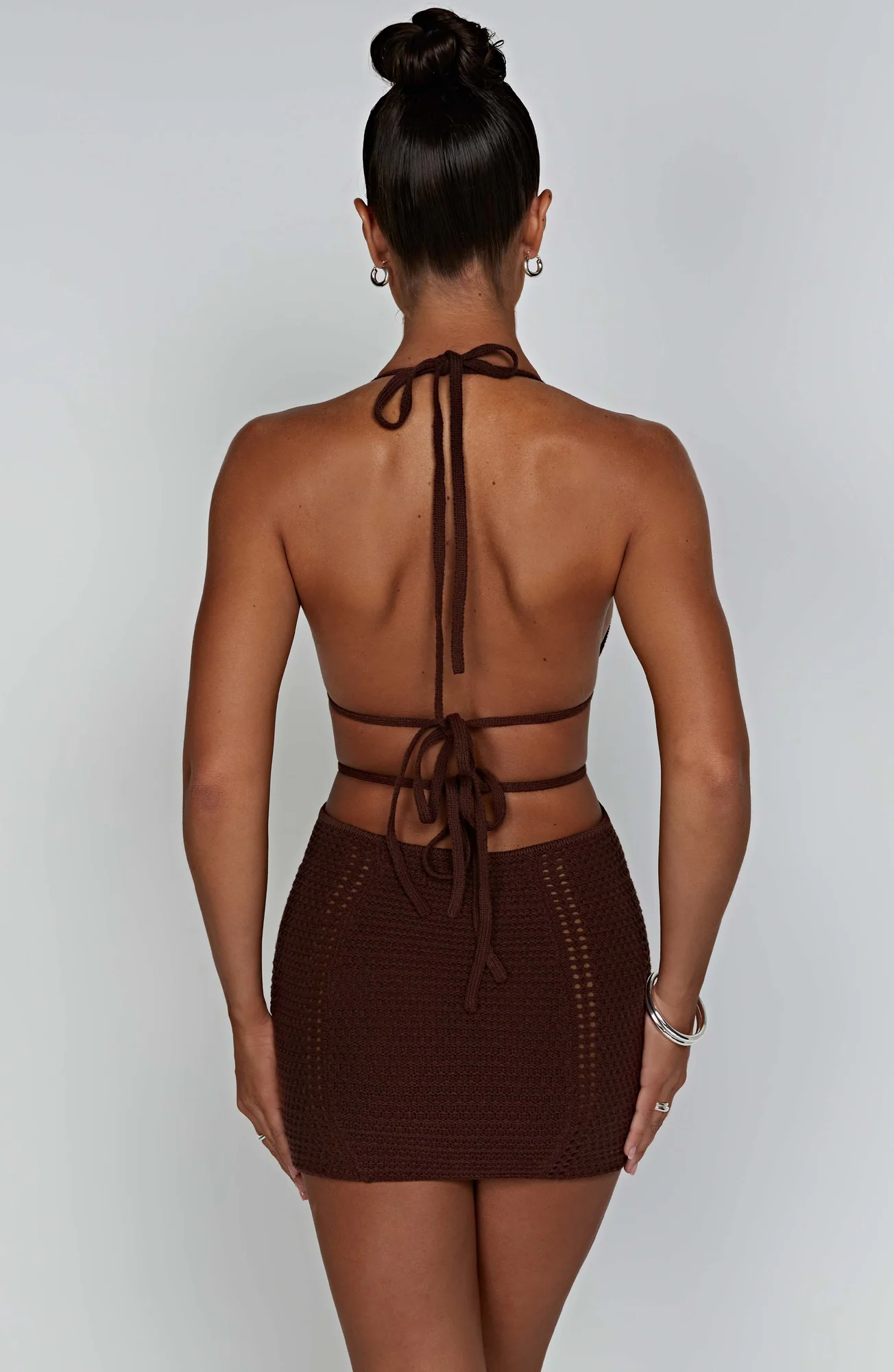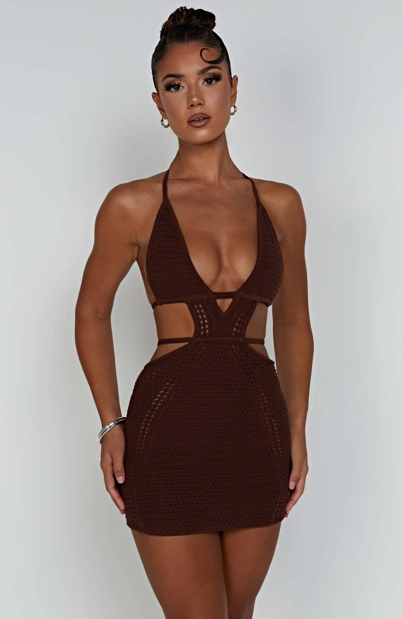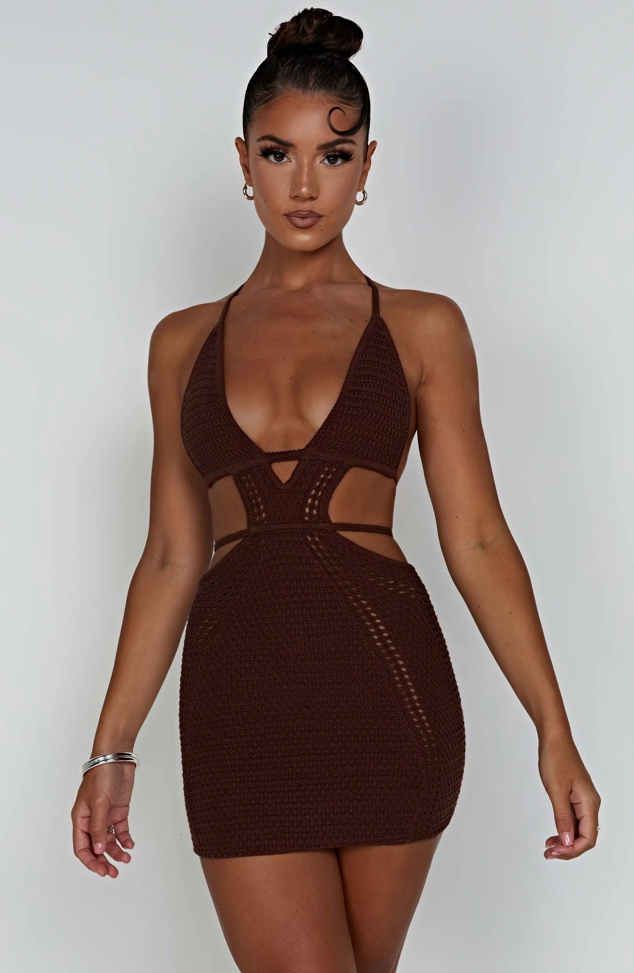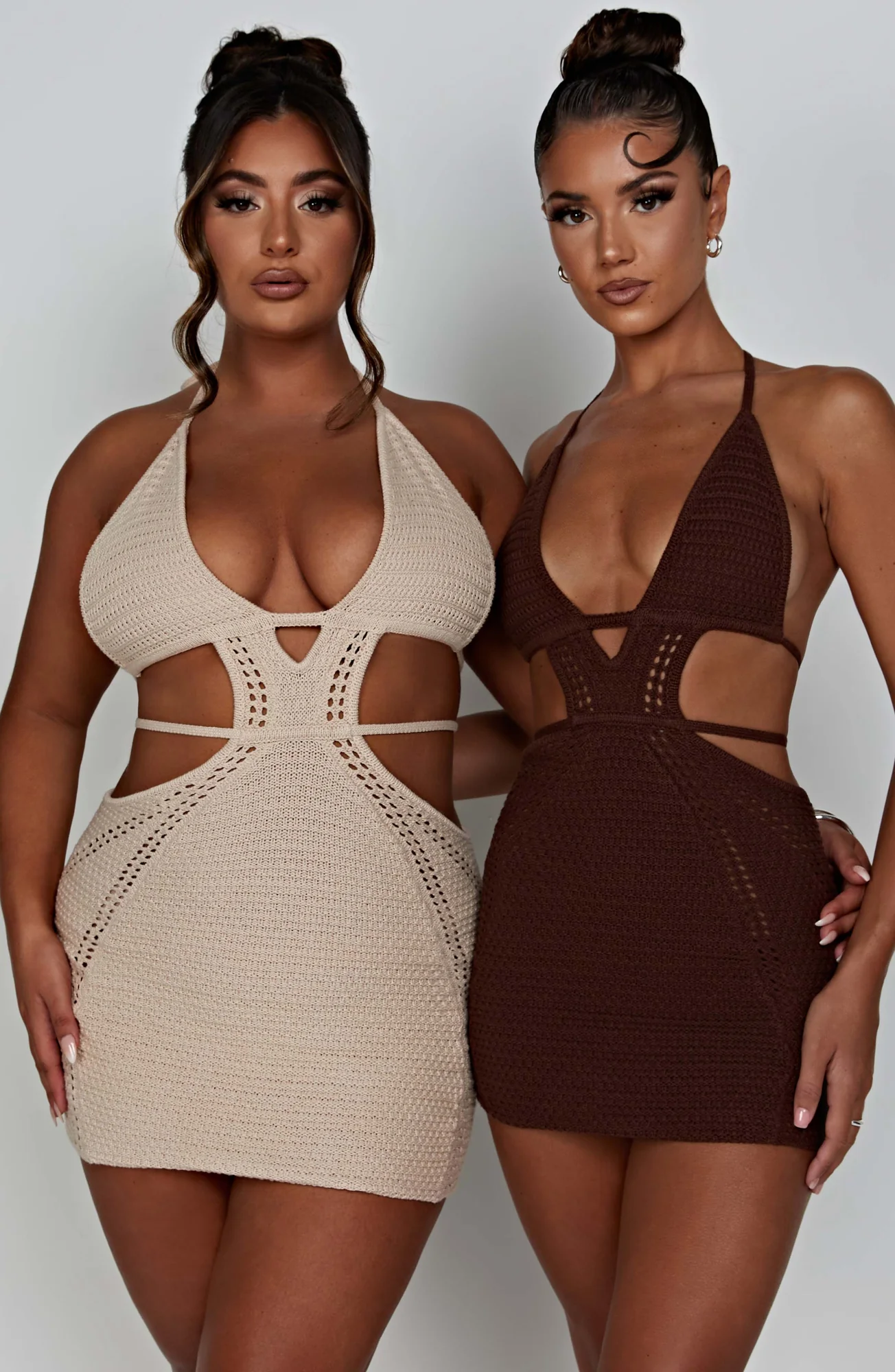 Indulge in the allure of our premium Chocolate Crochet Knit Backless Mini Dress Selena. This effortlessly cool dress, with a fresh cream color, molds to your figure with a slight stretch, offering a sensational fit. The daring plunge neckline and backless detail with ties accentuate your silhouette, while the mini length adds a touch of sophistication. No matter your height, Selena is designed to fit perfectly and can be adjusted to your liking. Made for chic versatility, this dress is a wardrobe essential. Elevate your style with Selena. Color: Chocolate. Material: Premium crochet knit. Features: Plunge halter neckline, cut-out waist, backless ties. Length: Mini. Suitable for all heights. Models showcase XS and XL sizes.