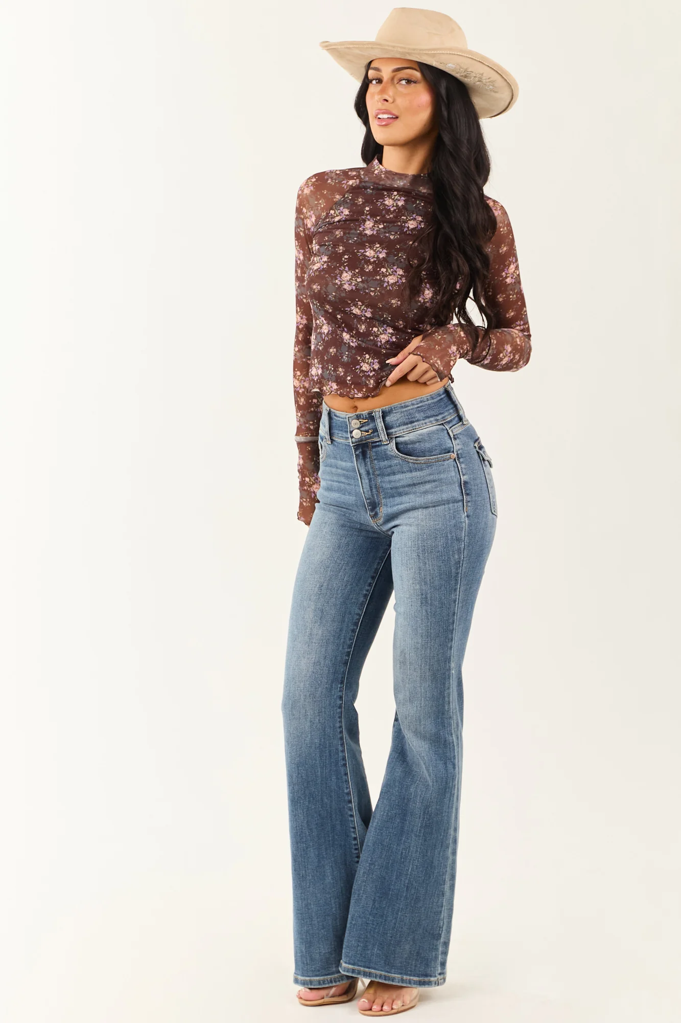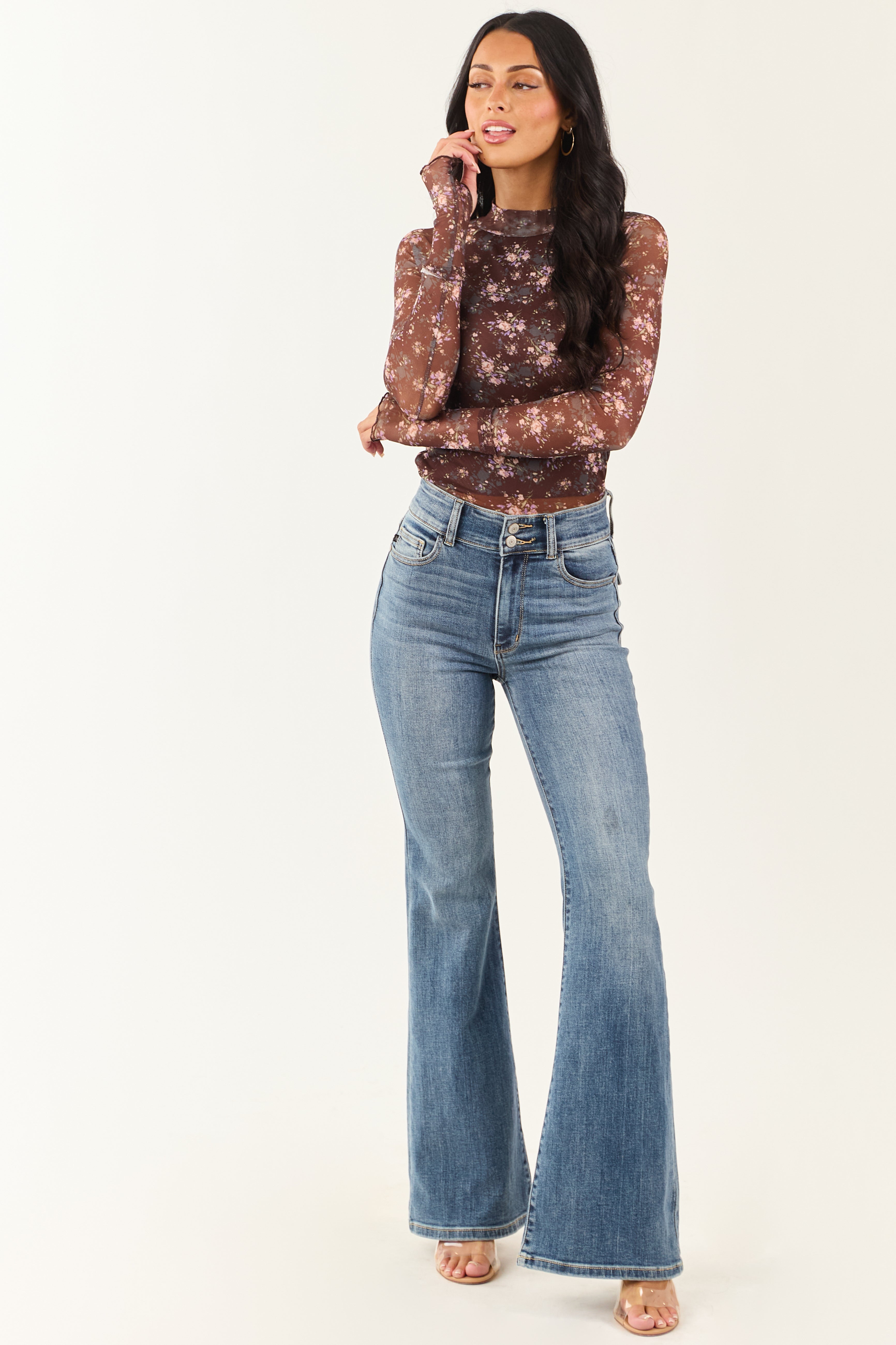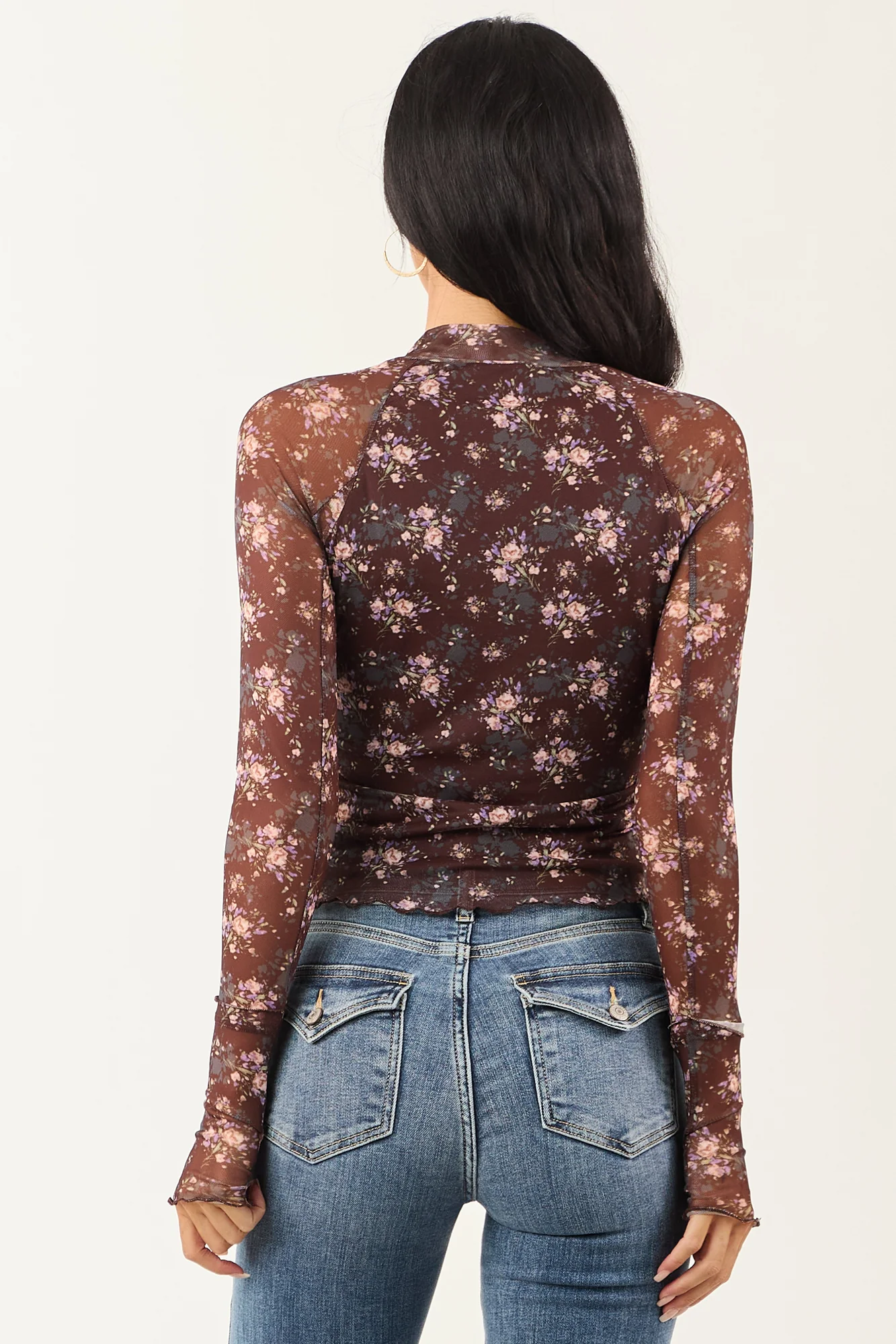 Indulge in floral elegance with our Chocolate Floral Mesh Top. Crafted with soft stretchy mesh in shades of Chocolate, Juniper, Sage, and more. This fitted top features a mock neck, thumb holes, and sheer sleeves for a stunning ensemble. Made of 95% Polyester and 5% Spandex. Perfect for adding a touch of sophistication to your wardrobe. Please note that each piece may vary due to the unique cutting and sewing process. Pair with your favorite bottoms for a chic look.