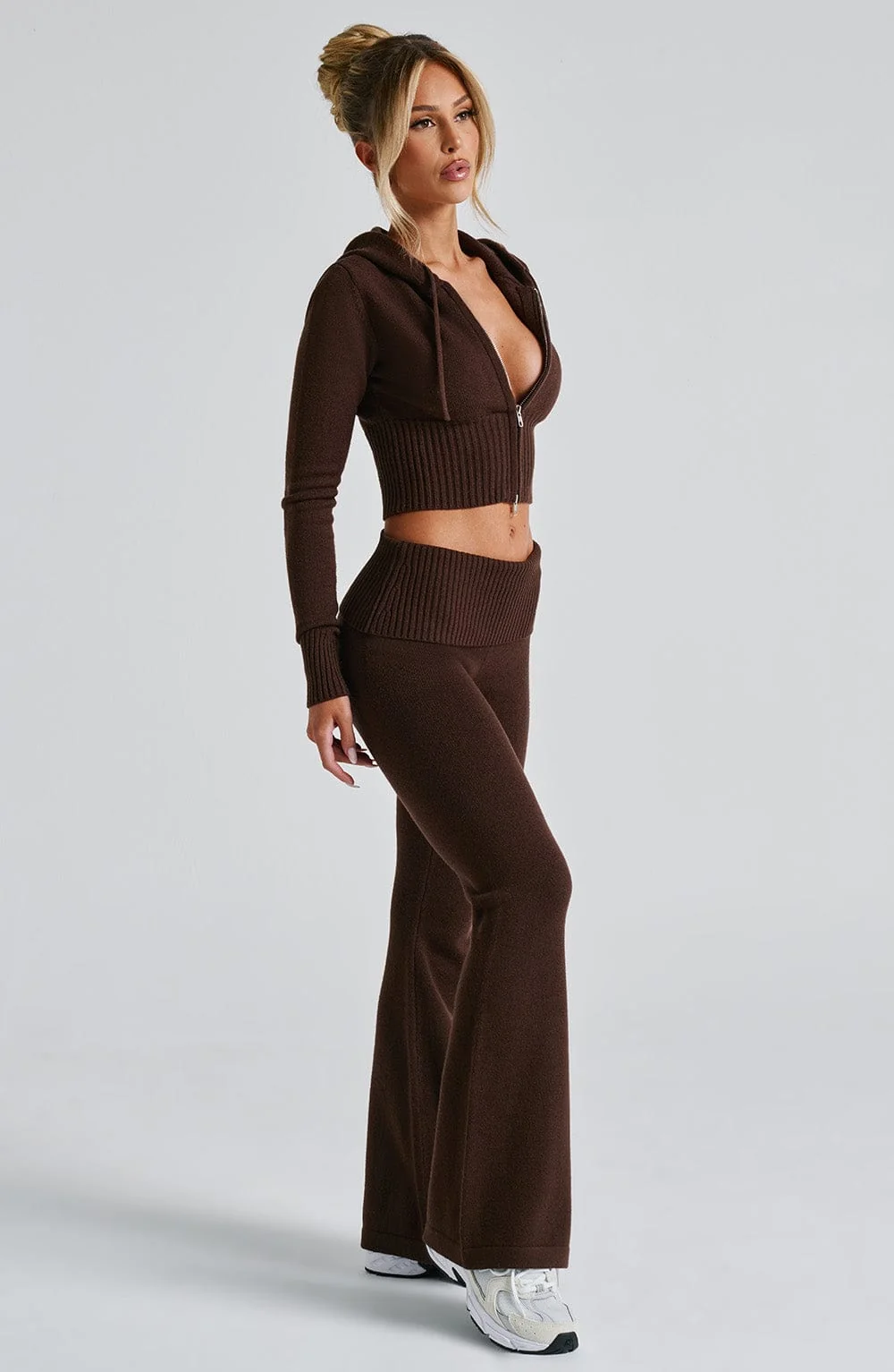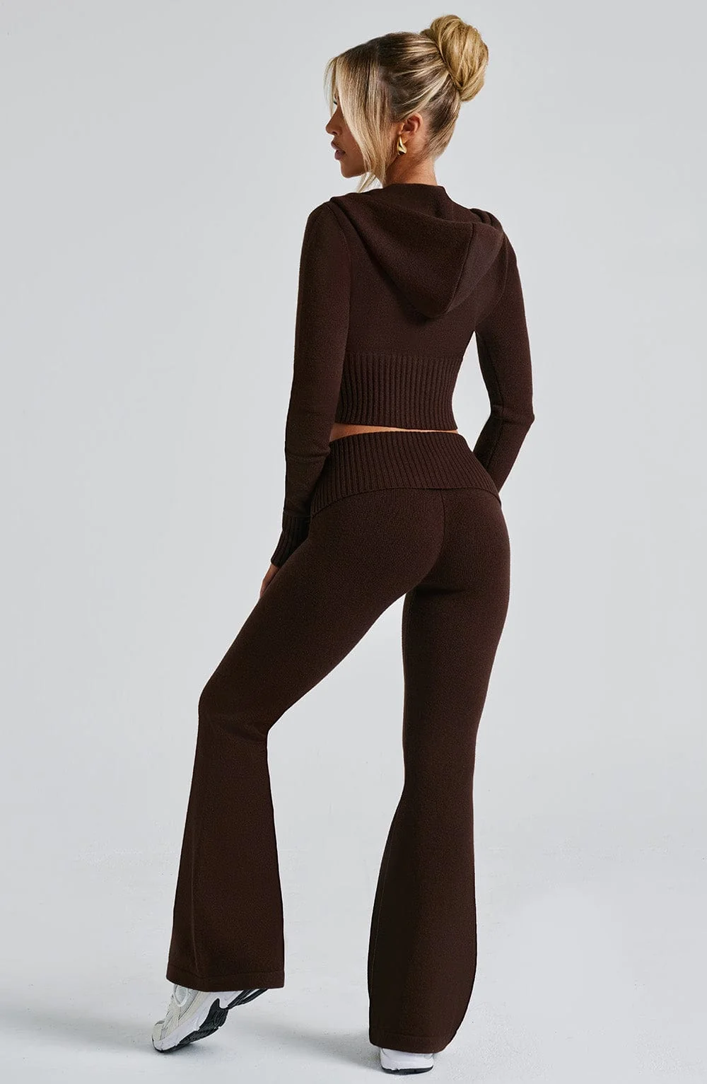 Indulge in chic simplicity with the Chocolate Knit Hoodie for women. Elevate your off-duty wardrobe with this cropped hoodie featuring a fitted silhouette, 2-way zipper, and drawstring for a perfect fit. Pair with matching pants for a stunning ensemble. This unlined design boasts fitted sleeves with ribbed cuffs, a front drawstring, and a ribbed hem. Enjoy the sophisticated yet cozy style. Add this staple piece to your winter basics lounge collection.