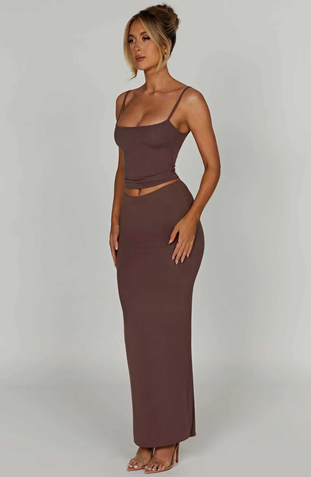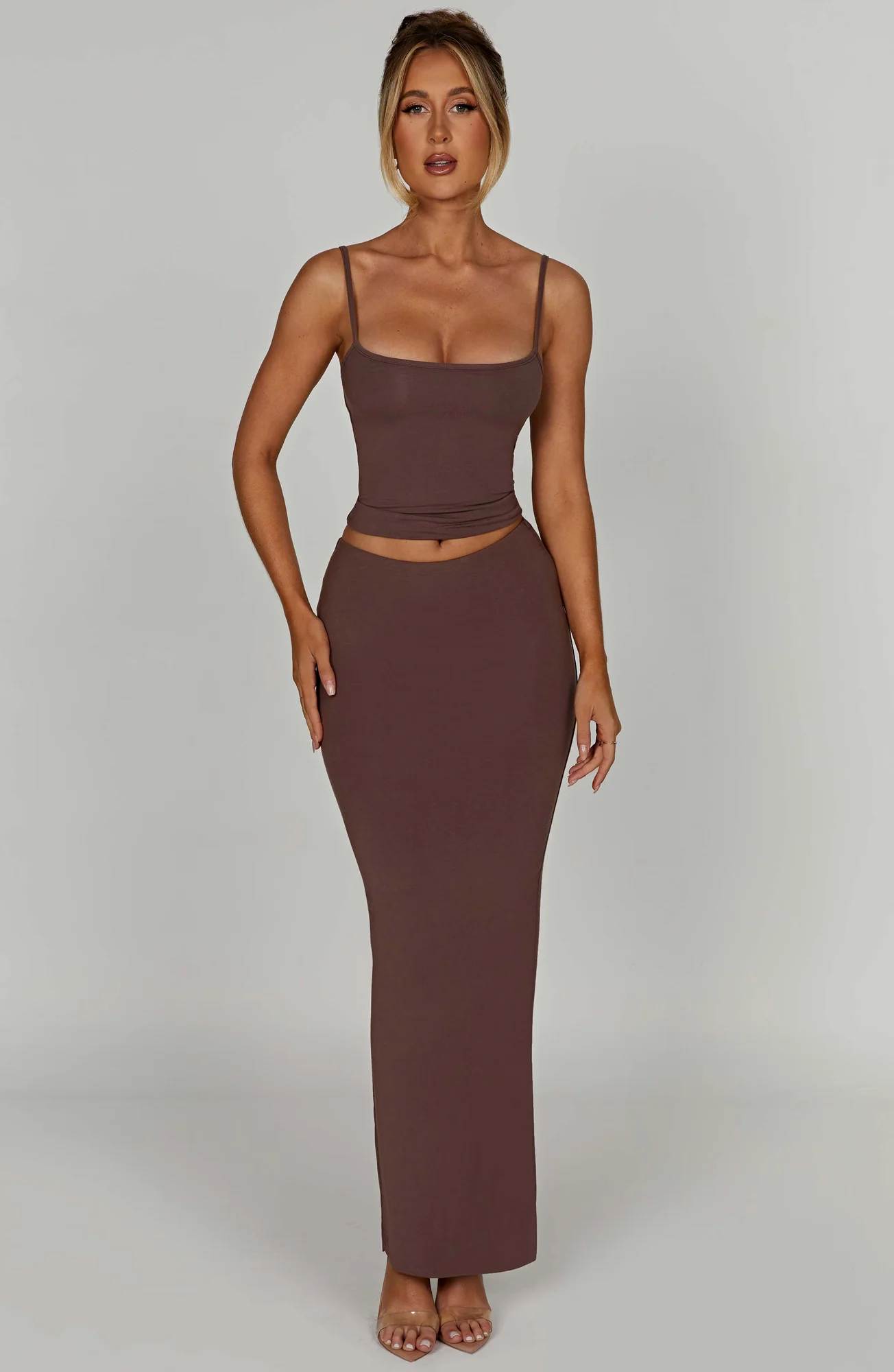 Indulge in luxury with our Chocolate Modal Maxi Skirt. Crafted from premium modal fabric, this double-layered skirt offers a buttery soft feel and second skin comfort. Designed to mold to your shape and move with your body, it features a flattering mid-rise design that falls just below the waist. Elevate your style effortlessly.