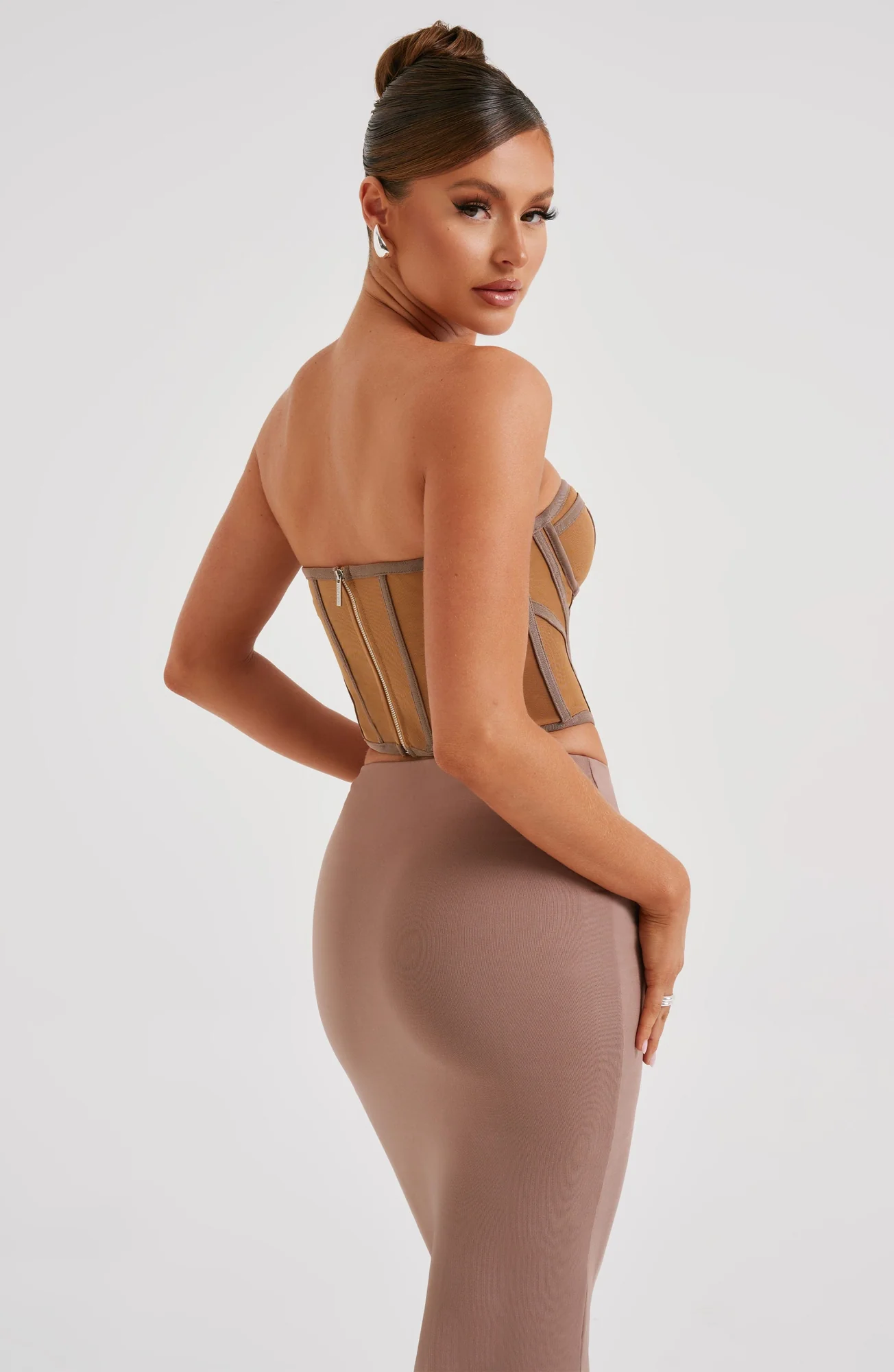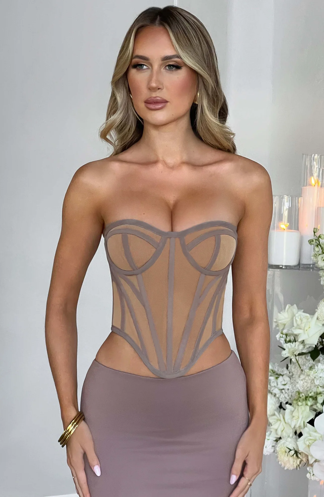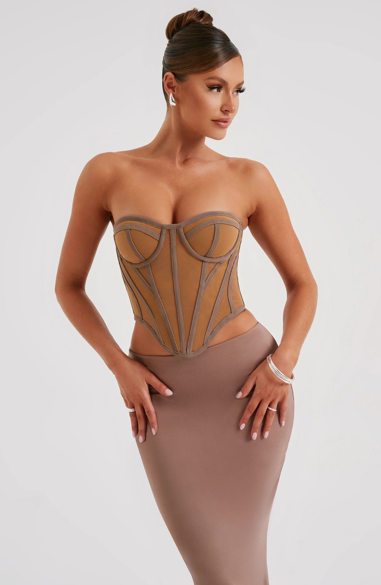 Indulge in the sleek and sexy Chocolate/Nude Santanna mesh corset by C.F. Sculpt your torso and waist with signature boning, while the cupped bust and dipped hem flatter your figure. Perfect for pairing with maxi skirts and muled heels. This lingerie mesh corset is a wardrobe essential for a chic and structured look. Available in XS, S, M, L, XL, and XXL sizes.