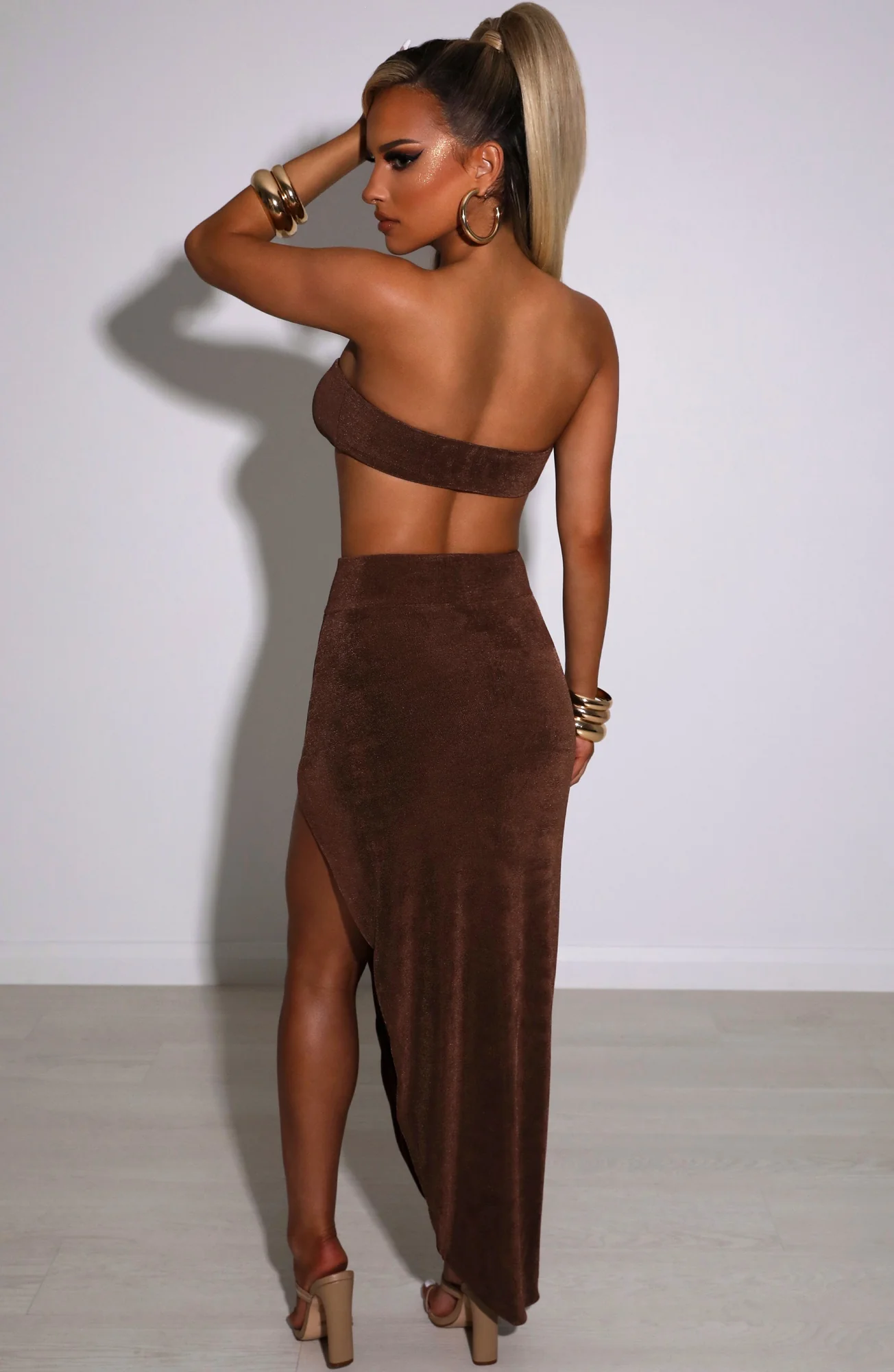 Tags: chocolate skirt, front leg split, gold metal accent, High-Waisted Skirt, Matching Set, ribbed maxi skirt