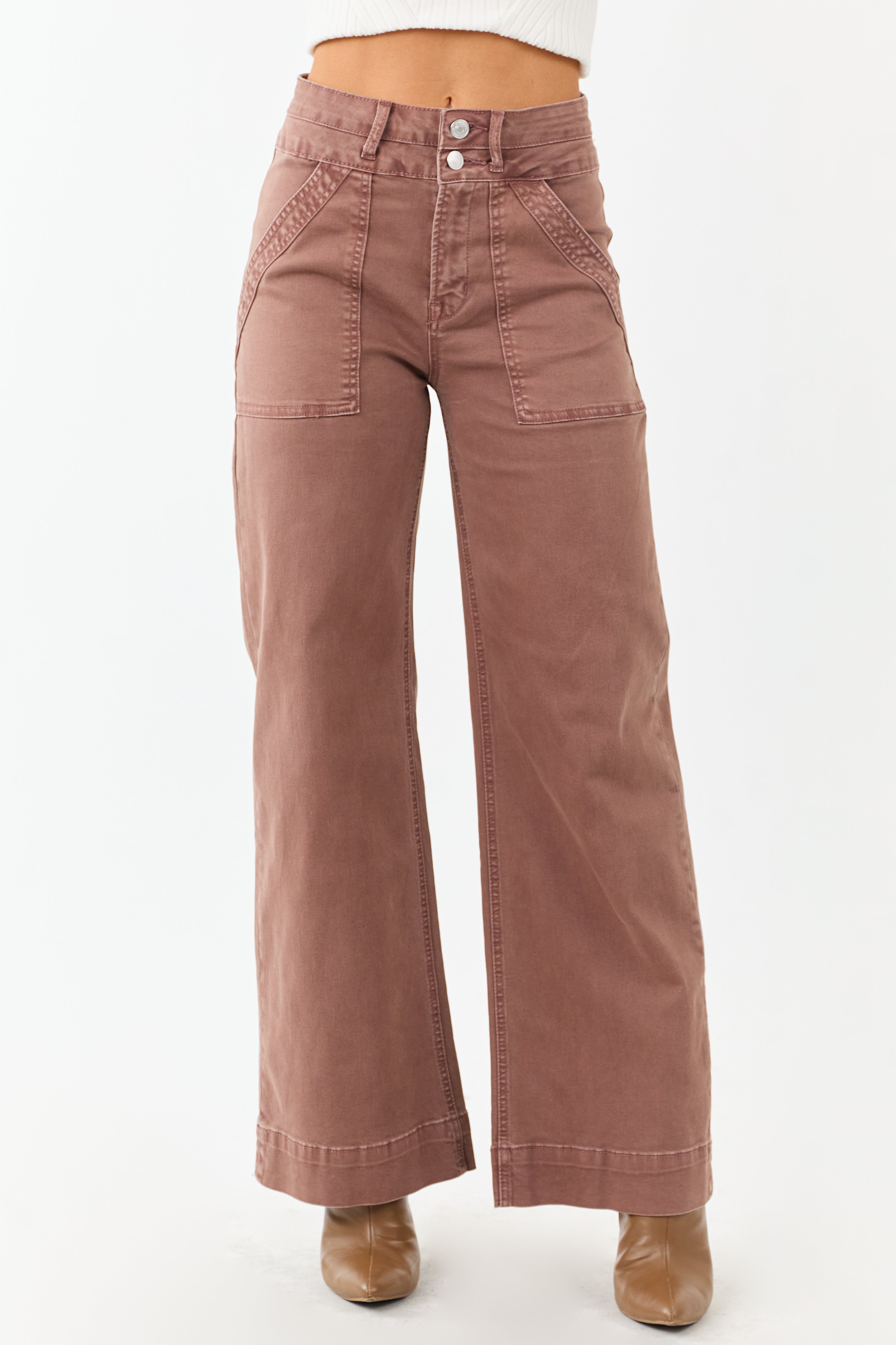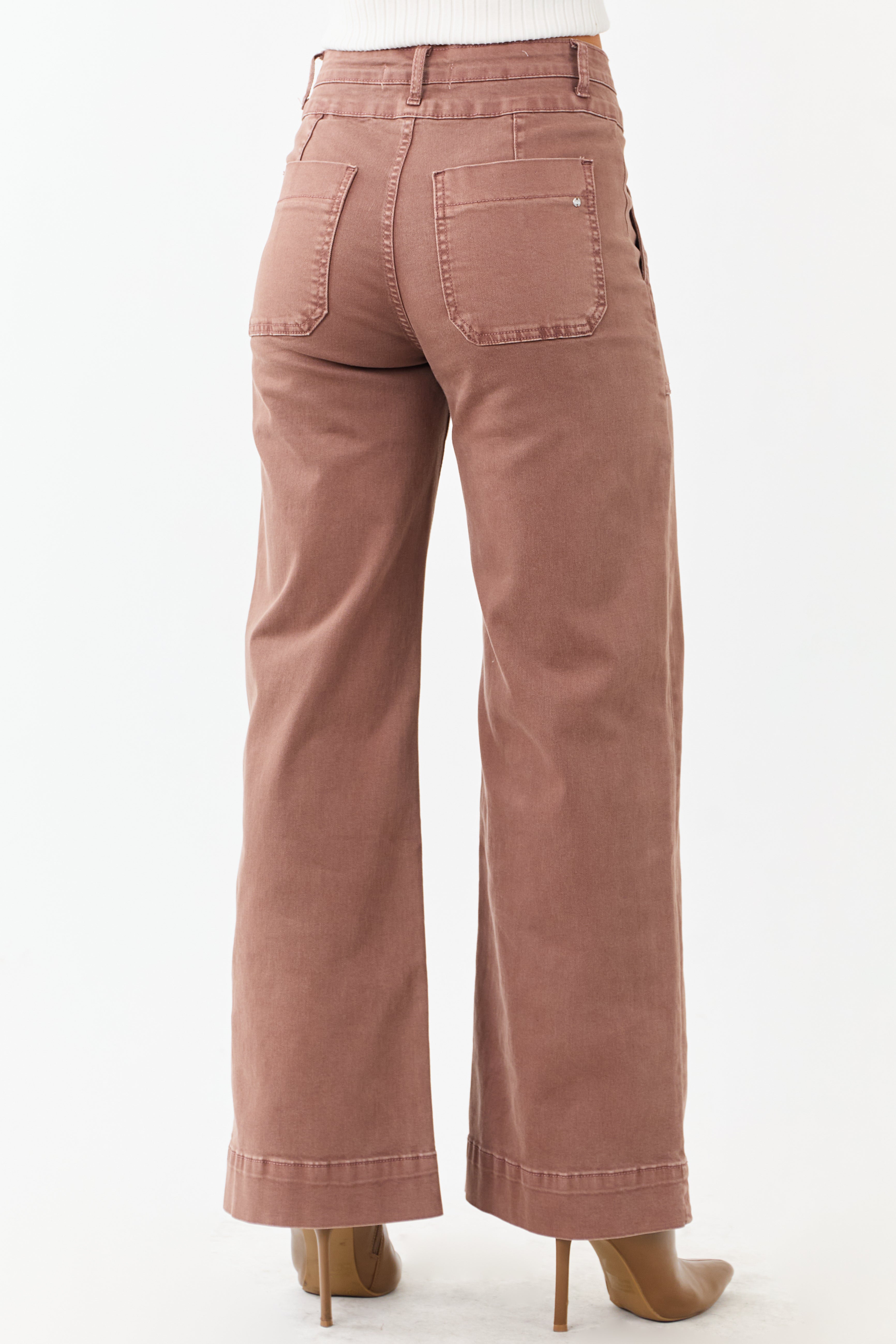 Experience unparalleled comfort in these chocolate wide leg jeans. With a forgiving waistband, high rise, zip fly, and 4 pockets, these stretchy denim jeans offer a cool fit. The inseam is 30 inches, made of 98% cotton and 2% spandex for a perfect blend of style and comfort. Look effortlessly stylish and stay comfortable all day long. Note: Actual waistband measurements provided. Model wearing size 26.