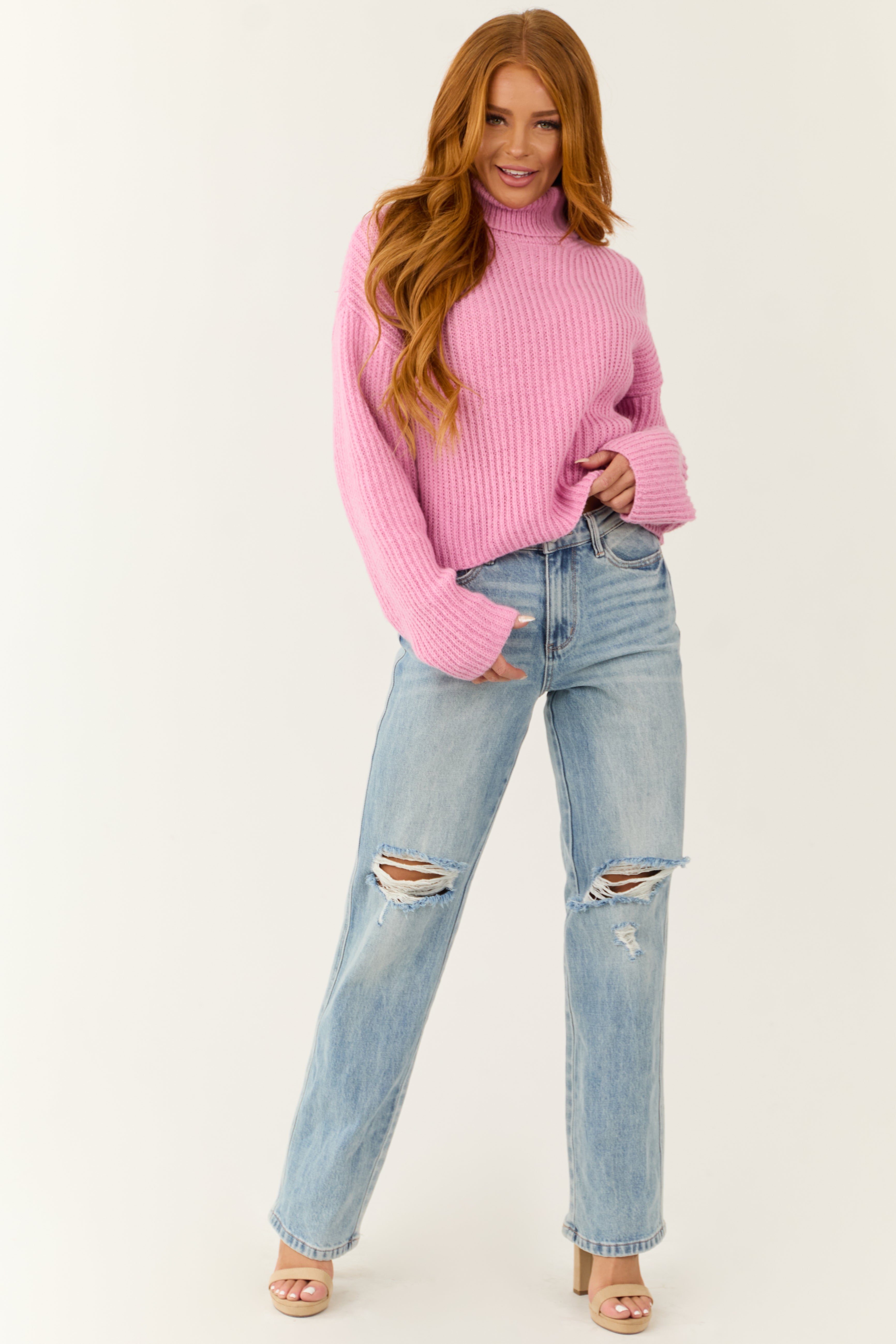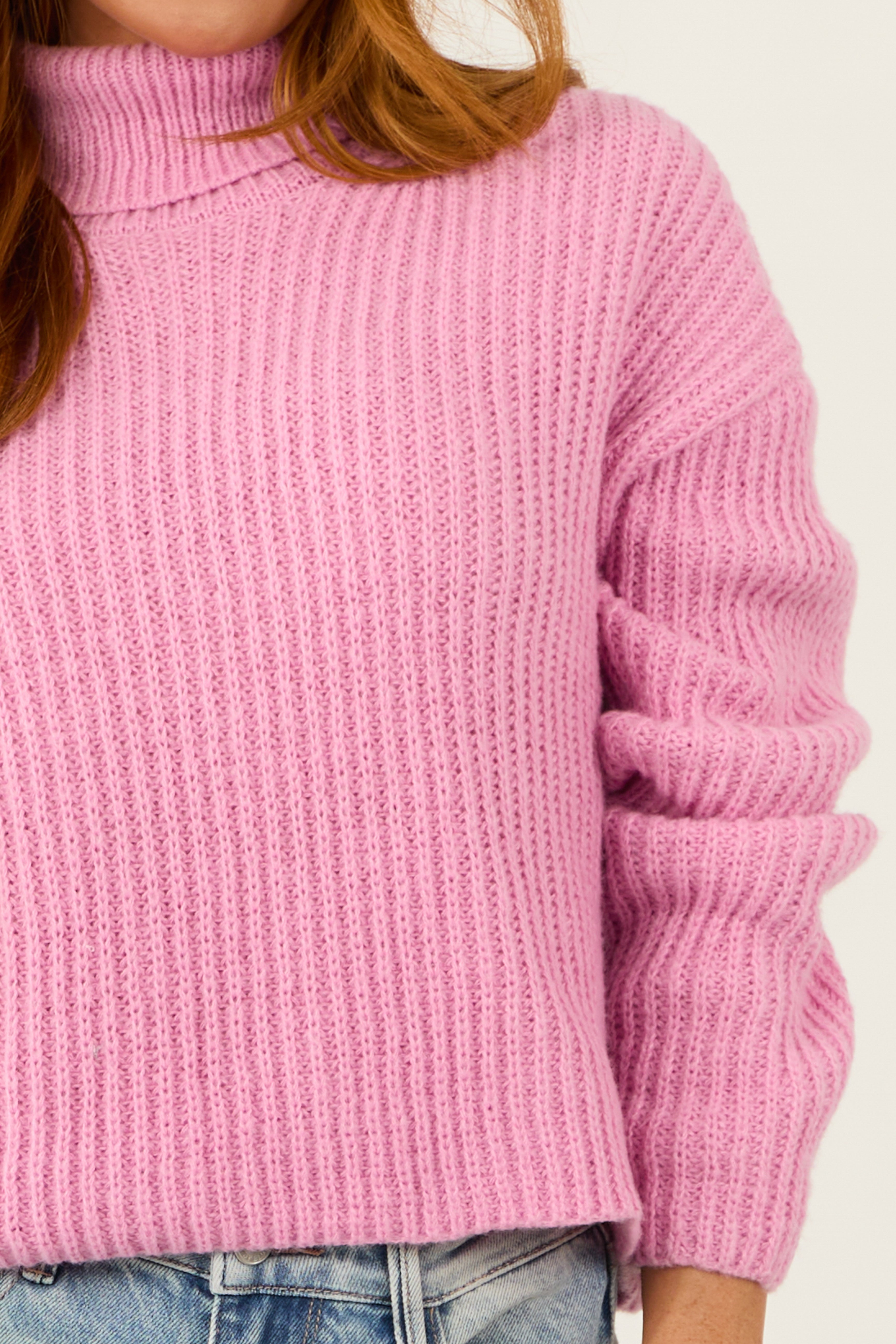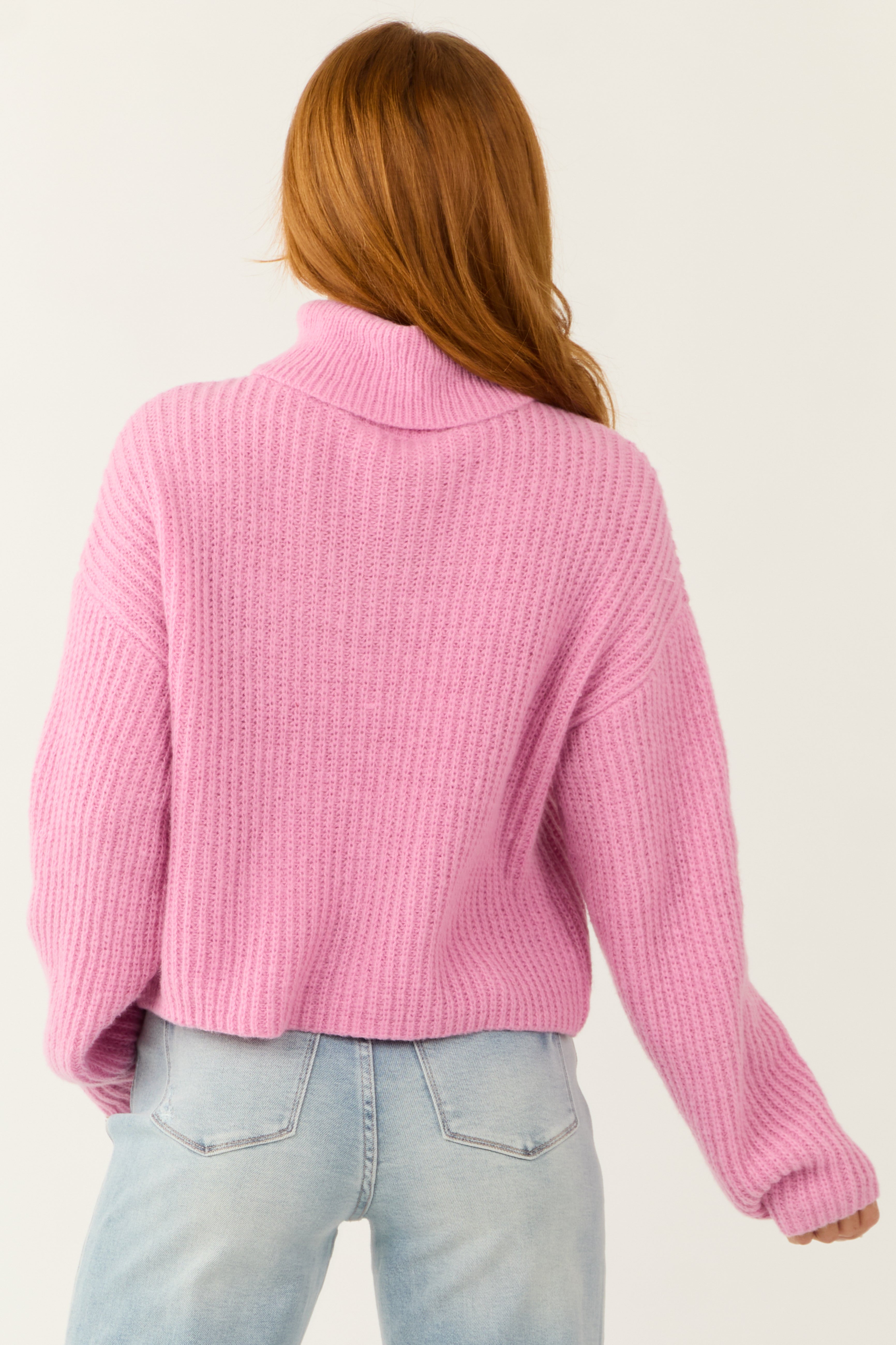 Stay warm and stylish with our Chunky Baby Pink Turtleneck Sweater. This oversized sweater features a stretchy ribbed knit, semi-cropped length, drop shoulder, and an unlined design. Made of 79% Polyester and 21% Acrylic for a cozy feel. Easy to care for – Hand wash cold, dry flat. Available in sizes S (2-4), M (6-8), and L (10-12). Perfect for winter days or casual outings. Model is 55″ and wearing a size Small.