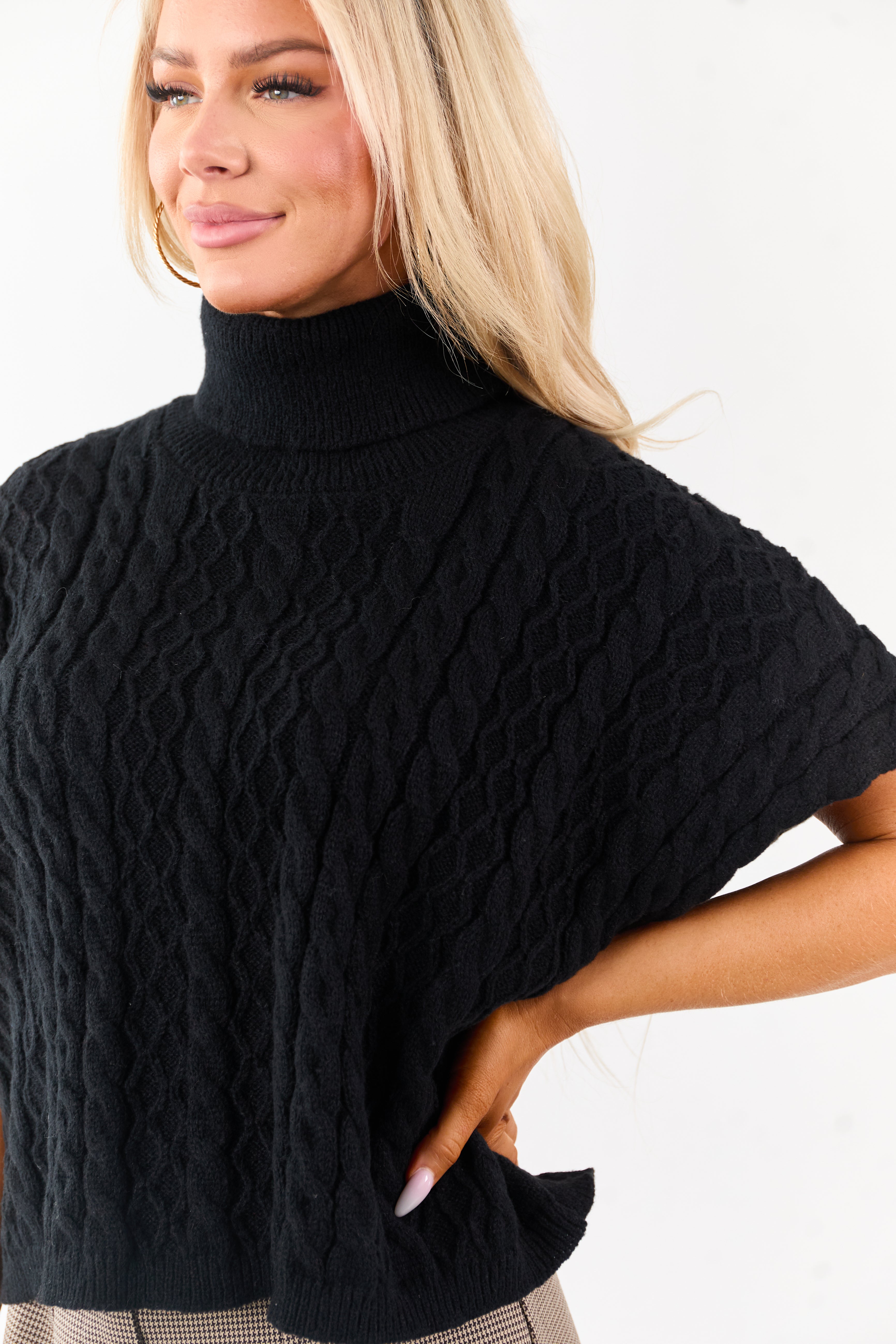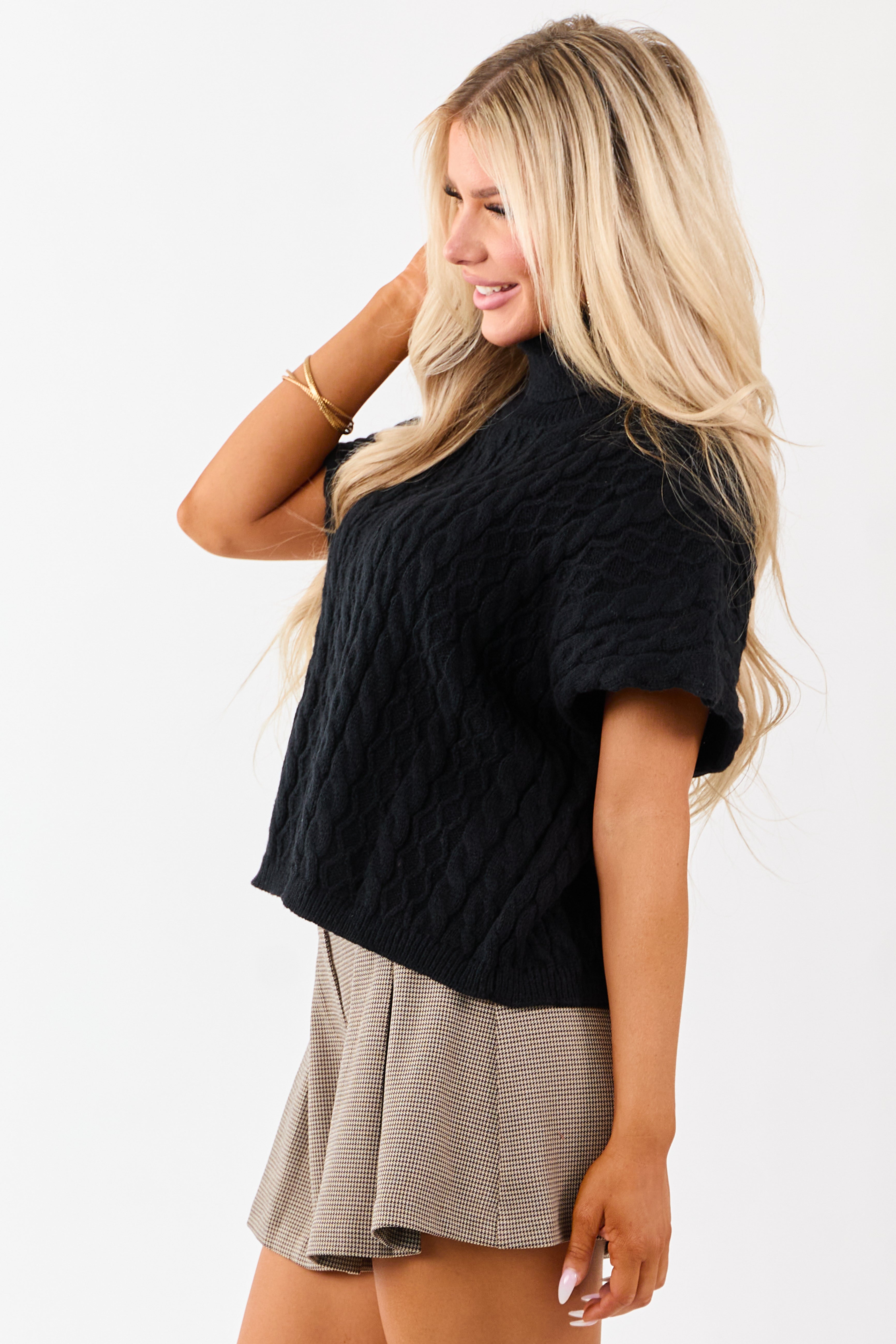Indulge in stylish comfort with our chunky black cable knit short sleeve sweater. This pullover boasts an oversized fit and stretchy texture, crafted from 100% Polyester for a cozy feel. The turtleneck design adds a touch of sophistication, making it a versatile and chic addition to your wardrobe. Available in sizes S, M, and L, with a bust range of 48-52 inches and lengths from 21-22 inches. Elevate your look effortlessly with this trendy, imported piece. Model is wearing size Small. Enhance your seasonal style with this must-have sweater!
