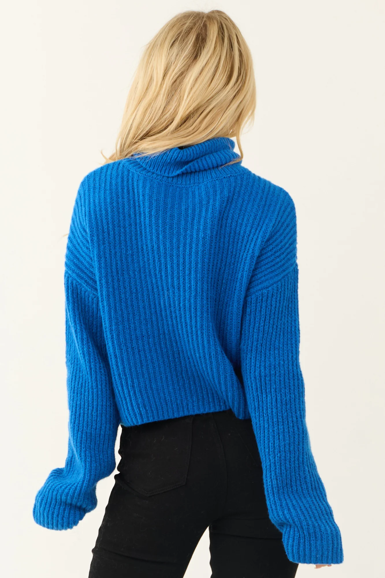 Stay cozy and stylish in this oversized chunky blue turtleneck sweater. Crafted from a stretchy ribbed knit for a comfortable fit. Features a semi-cropped length, drop shoulder, and unlined design. Perfect for winter, pair with your favorite bottoms for a trendy look. Care instructions: Hand wash cold, dry flat. Model is 57″ and wearing a size Small.