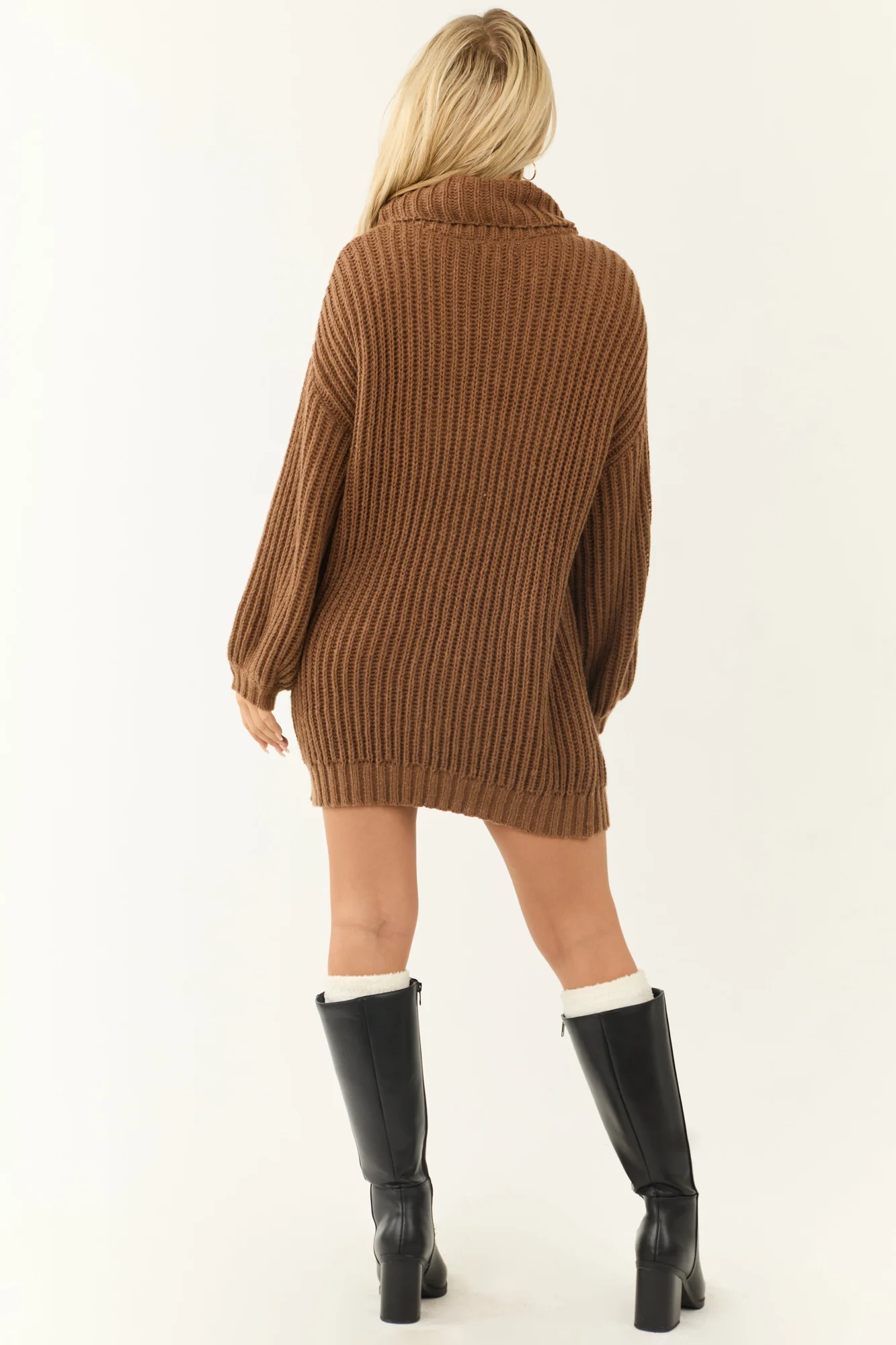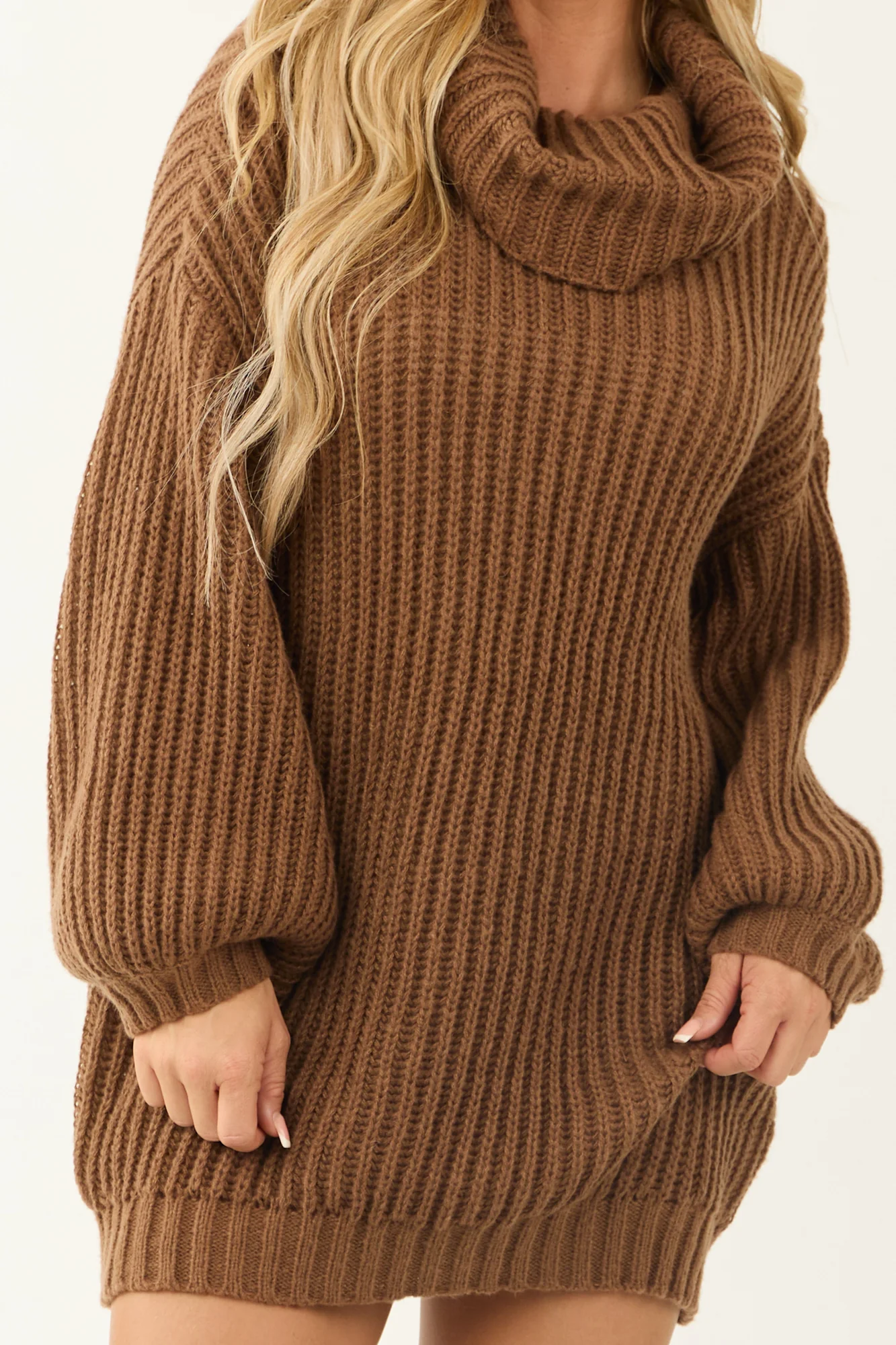 Elevate your style with our Chunky Brown Knit Turtleneck Sweater! This oversized tunic sweater features long balloon sleeves, a stretchy ribbed knit, and a cozy ribbed turtleneck. Made of 98% Polyester and 2% Spandex for a comfortable fit. Perfect for casual or daytime wear. Pair with your favorite belt for a chic look. Available in sizes S, M, and L.