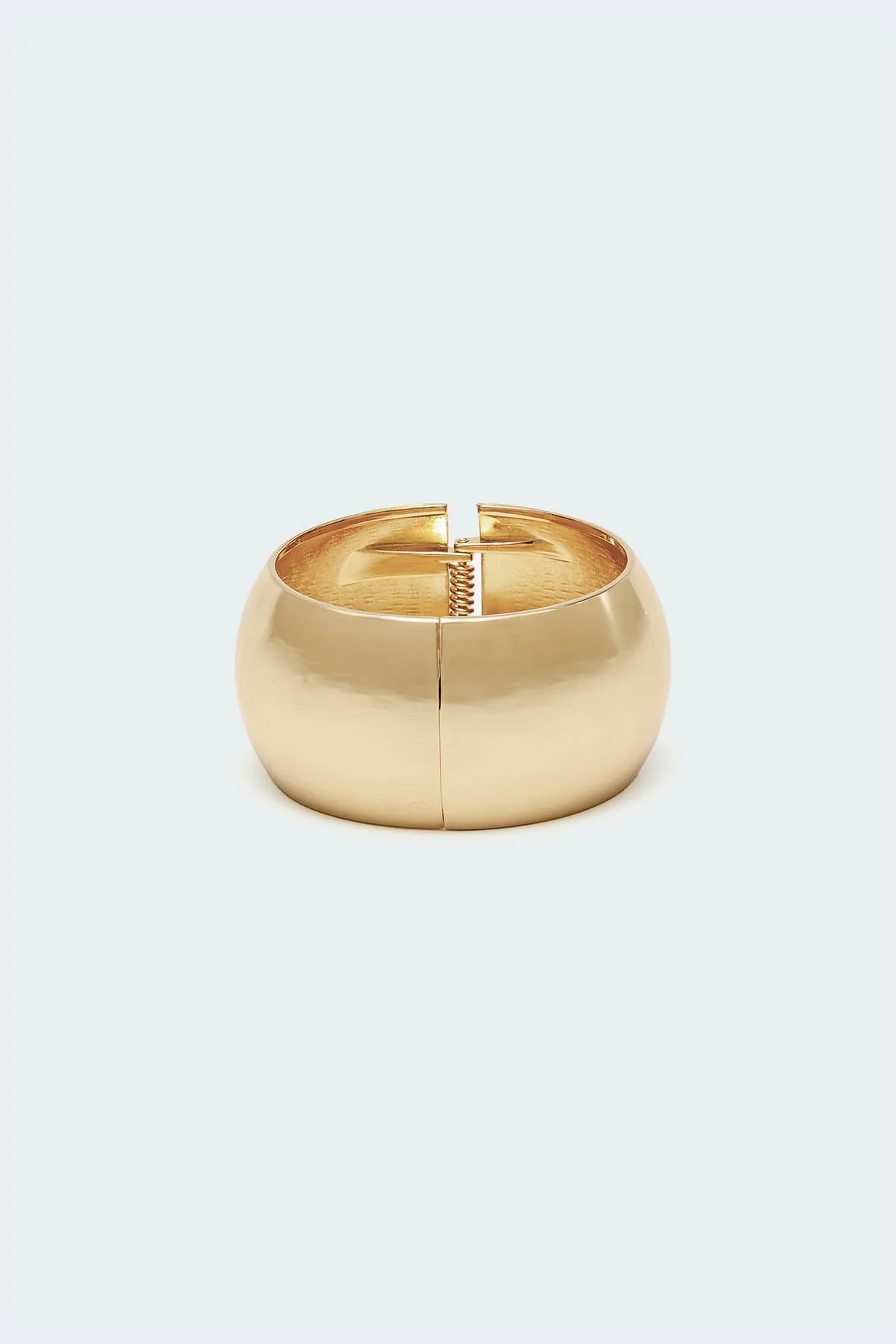 Experience elegance with our stunning chunky Gold Tone Cuff Bracelet. Designed with a beautiful curved shape, this accessory adds a touch of luxury to your attire. Crafted from high-quality metal, this bracelet measures 2.6 inches in length. Elevate your look with this exquisite piece that exudes sophistication and style. To maintain its brilliance, avoid direct contact with perfume, soap, or creams.