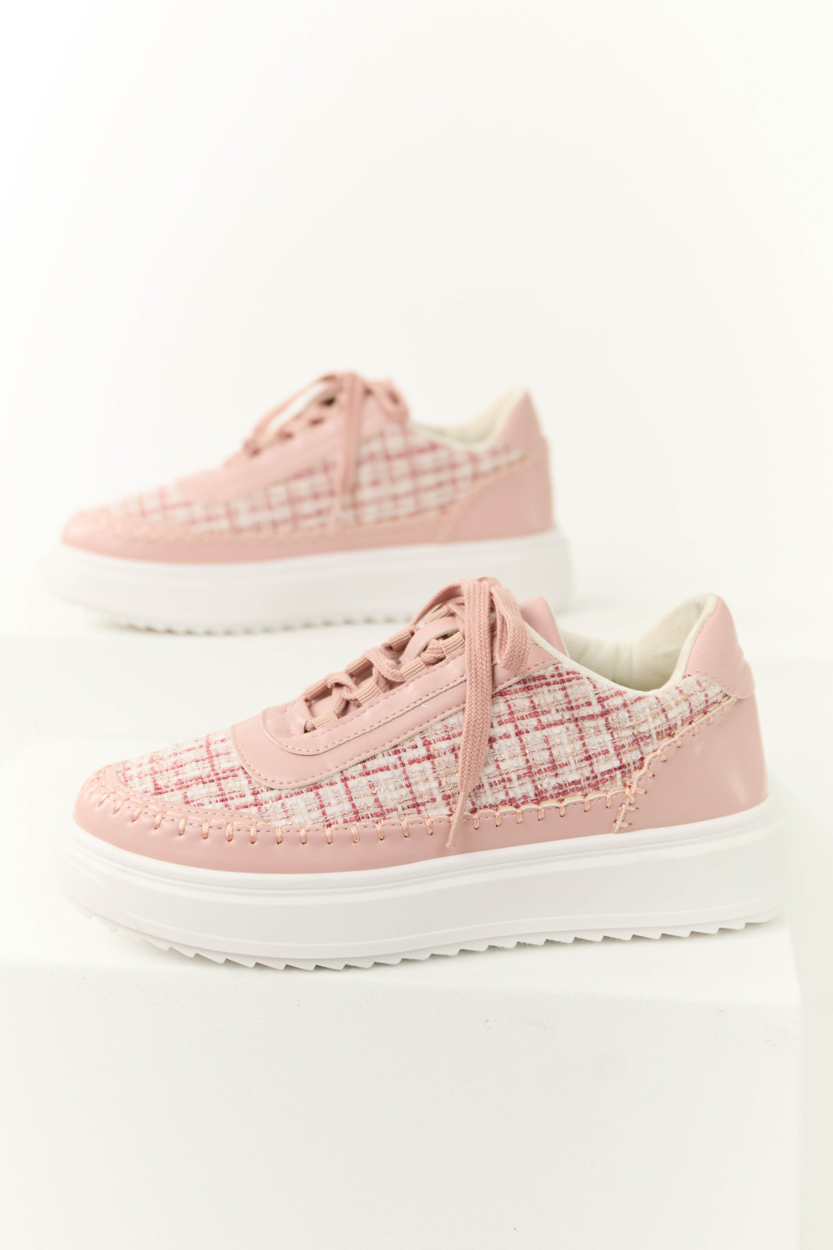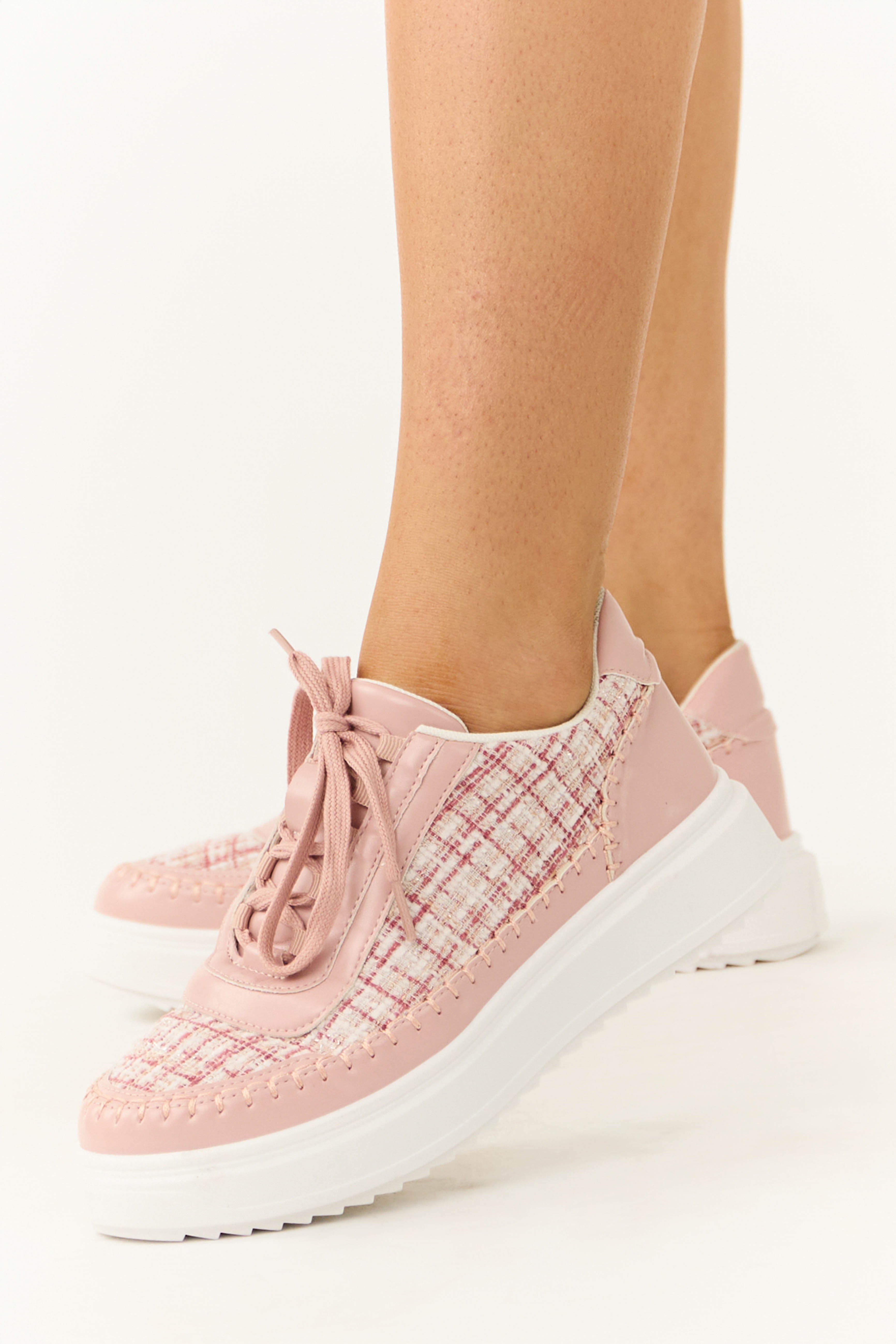 Step up your footwear game with these stylish Chunky Lace Up Sneakers crafted from faux leather and tweed materials. Adorned with Dusty Blush shades and featuring cushioned insoles for all-day comfort. Perfect for casual and daytime wear during all seasons. Elevate your look with these trendy platform sneakers boasting a 1.5-inch heel height and a 9-inch circumference. Imported and available in various sizes.