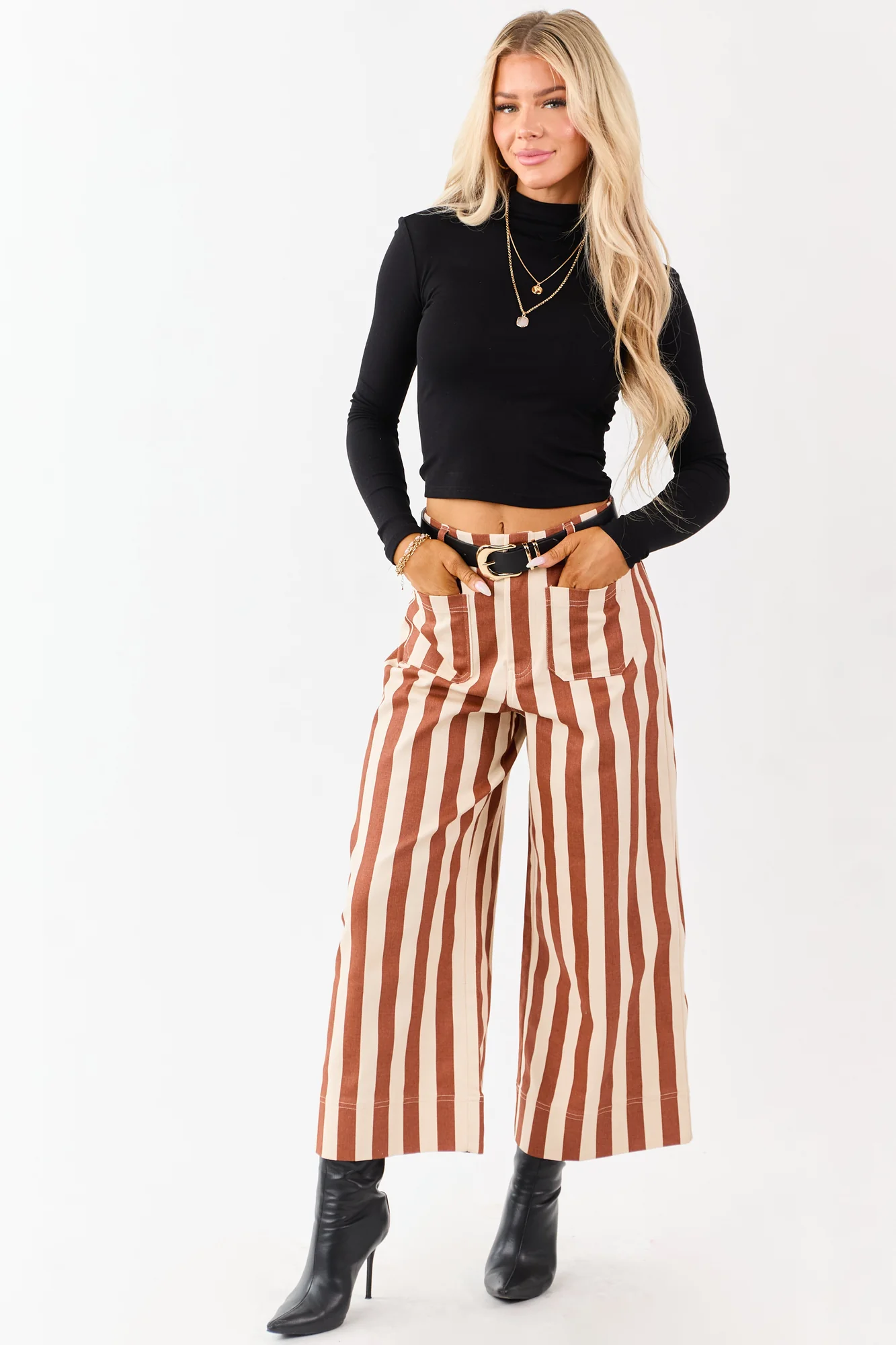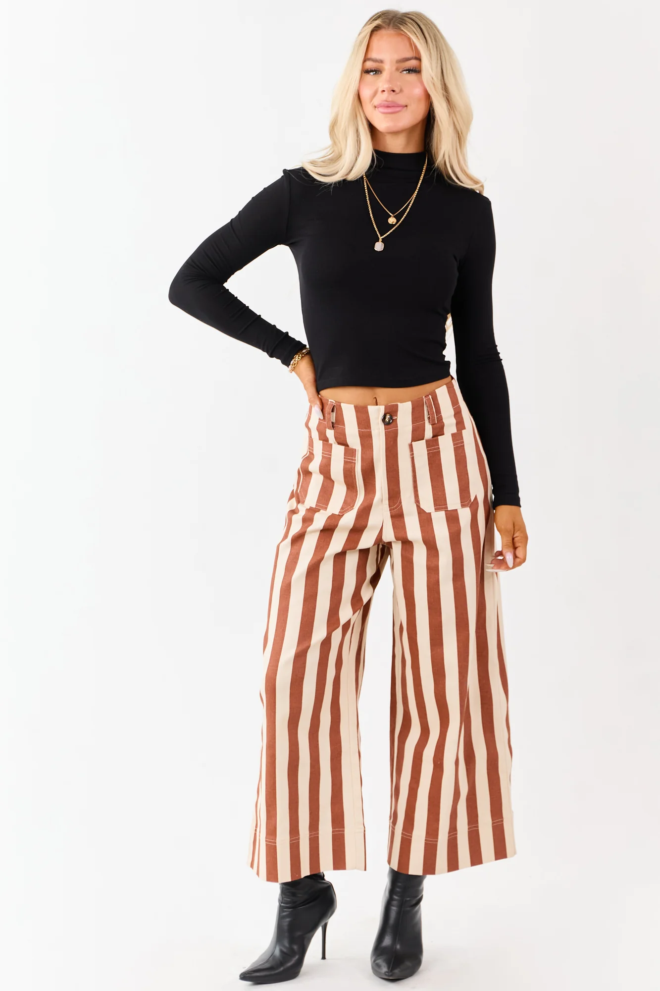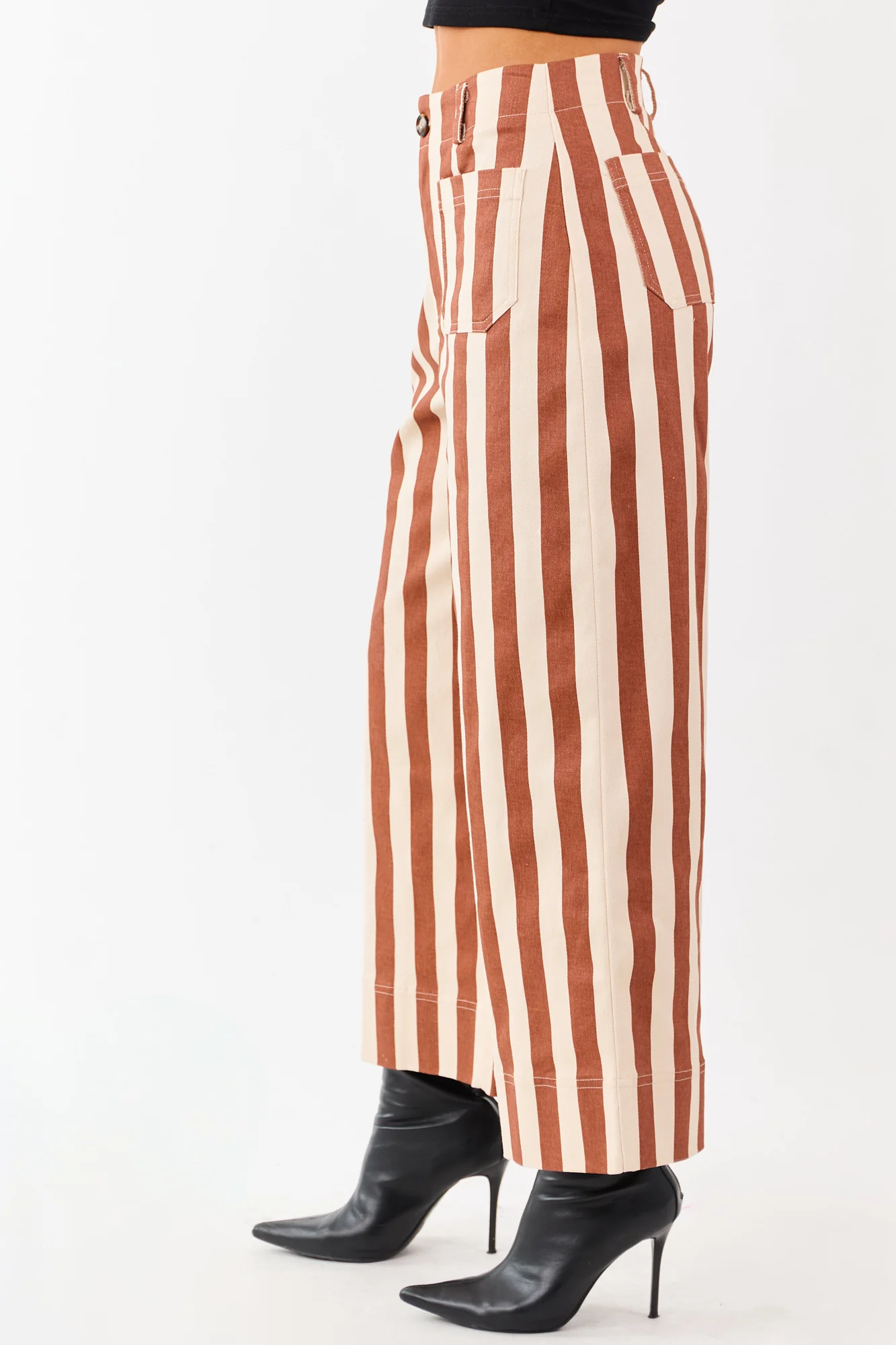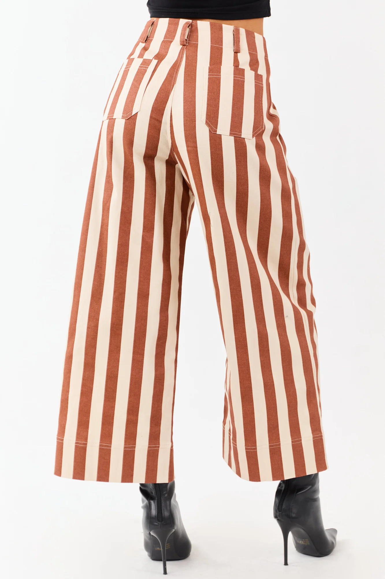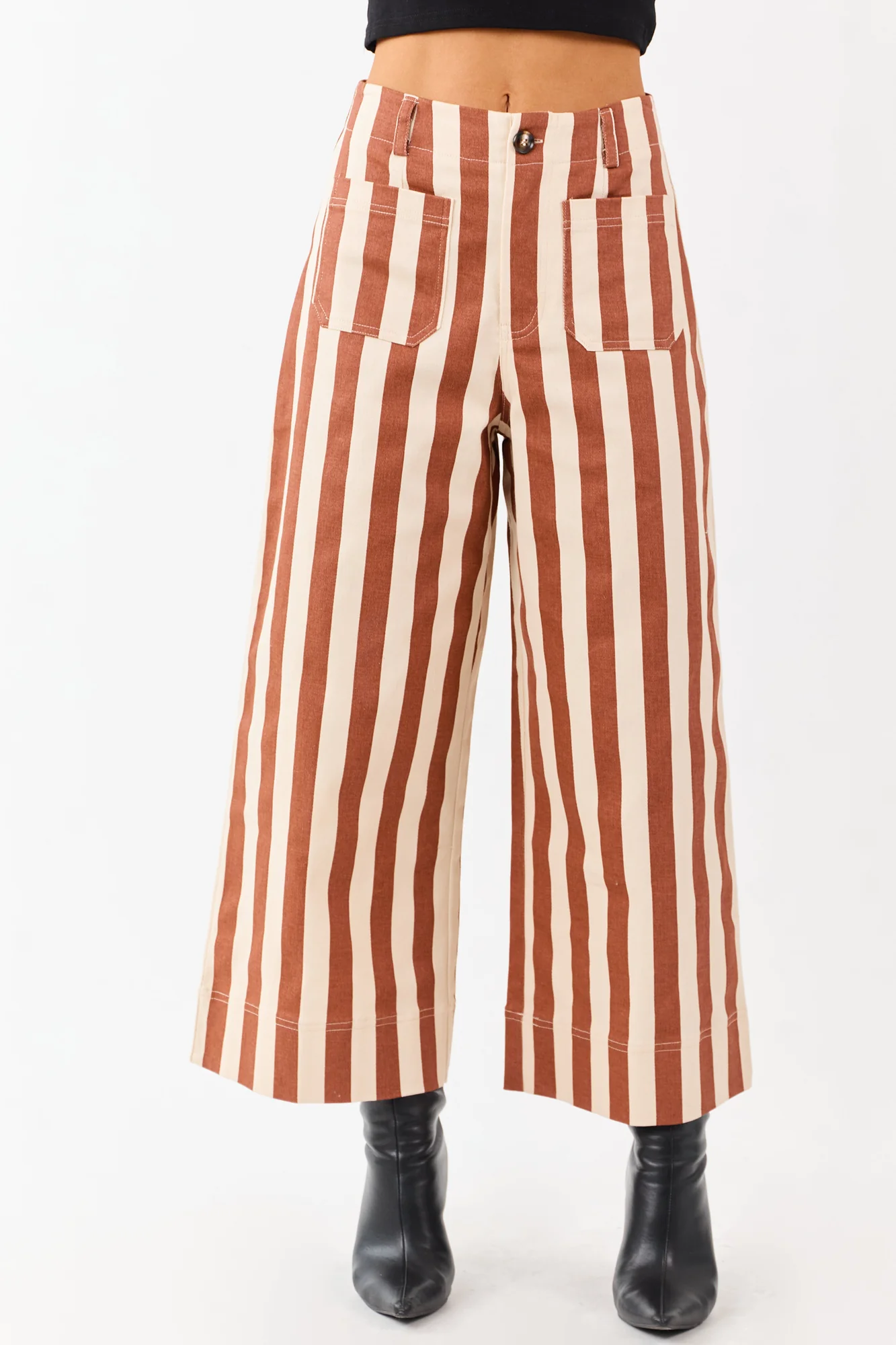 Embrace style and comfort with our Cinnamon Striped Wide Leg Crop Denim Pants. Featuring playful stripes, patch pockets, and a relaxed wide-leg silhouette, these denim cropped pants are a must-have statement piece. Made of stretchy denim for a flexible fit. High rise design with zipper fly, button closure, belt loops, and four pockets. Inseam length of 25 inches. Available in sizes XS to XL. Ideal for casual outings and everyday wear.