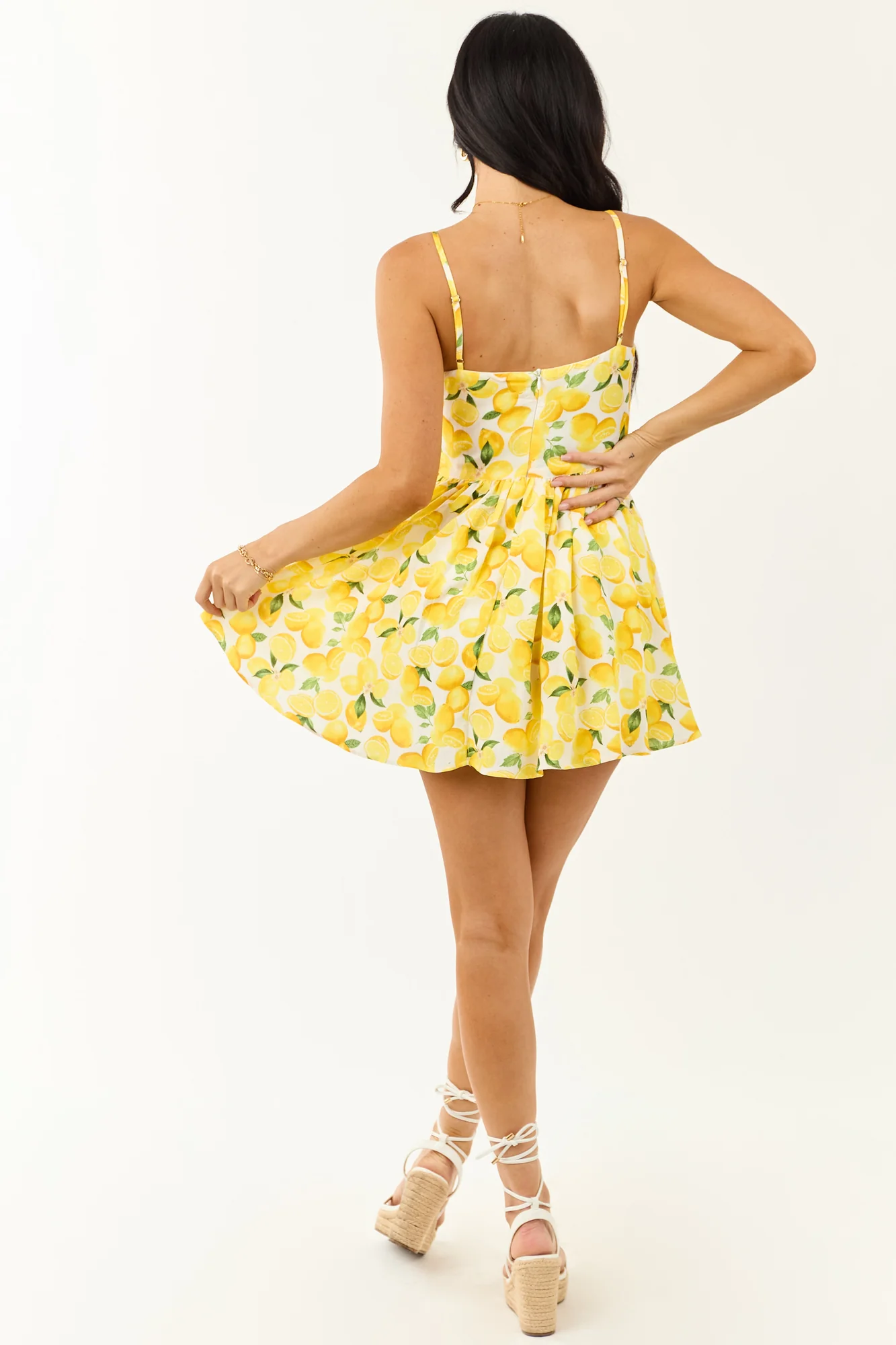 Embrace sunny days in style with this citrus print mini dress. Perfect for picnics and patio hangouts, it features a built-in bra for comfort, adjustable spaghetti straps, side pockets, and a hidden back zipper. Made of 75% Rayon and 25% Nylon, lined with 100% Polyester. Available in shades of Sunshine, Marigold, Dusty Blush, Hunter Green, and Off White. Note: each piece may vary slightly due to the cutting and sewing process.