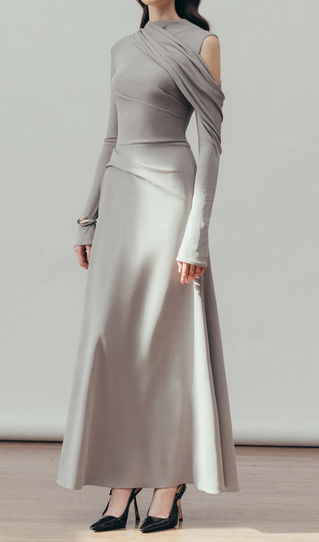 Elevate your formal look with our Cloudy Gray Jacquard Knit Maxi Dress. This elegant midi dress features a sophisticated high neckline and asymmetrical draped sleeves that exude grace and style. The 3D draping at the waist creates a fluid silhouette, accentuating your curves beautifully. Highlight your shoulders with the asymmetrical cut and flatter your figure with the mermaid silhouette. Crafted from high-quality Jacquard knit fabric, this dress is 141 cm in length with a sleeve length of 64.5 cm. Our dress sizing is true to our size chart, ensuring a perfect fit. Please consult our size chart for the best size selection. Embrace elegance with this timeless piece.