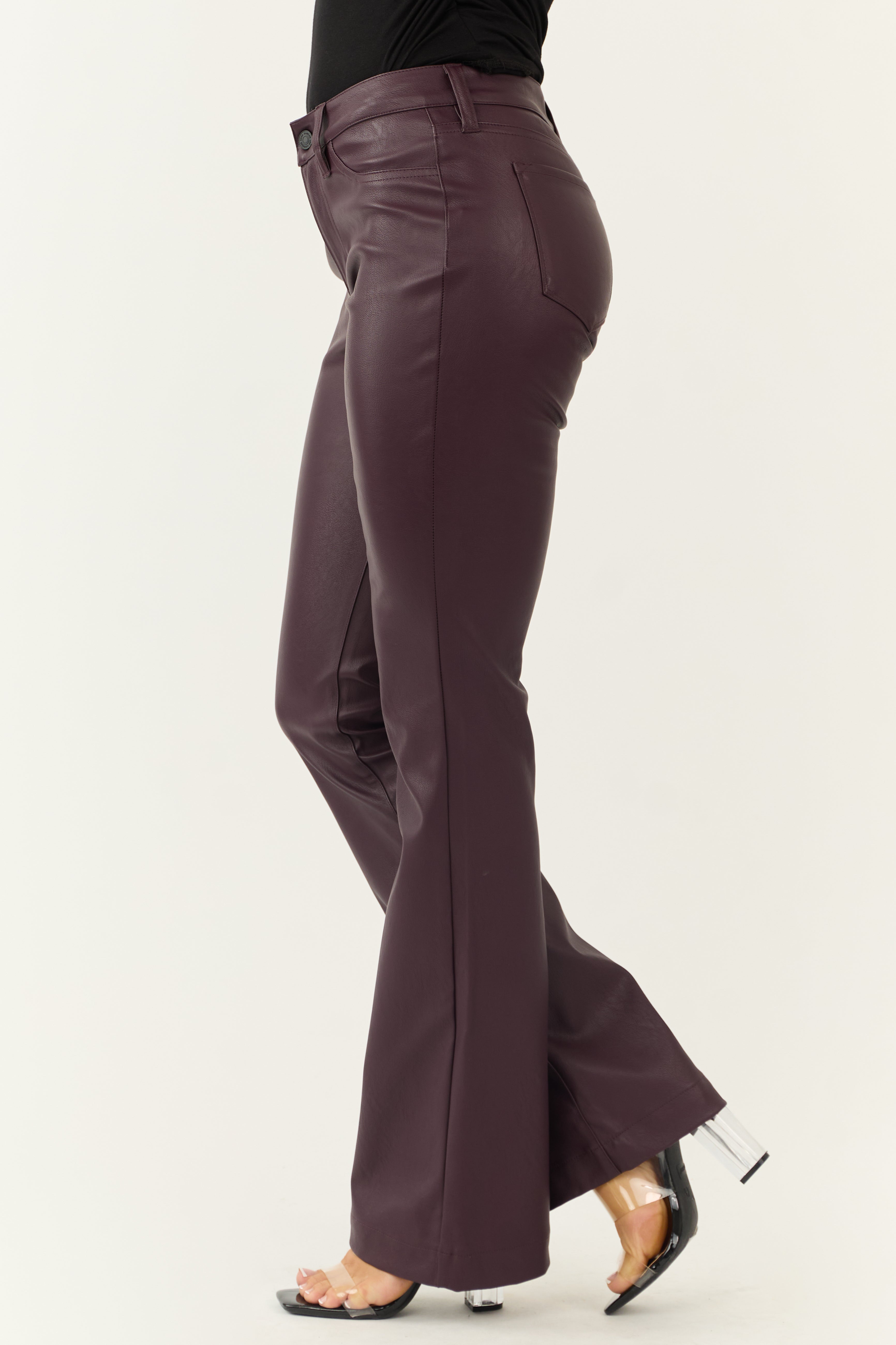 Elevate your wardrobe with these chic wine red faux leather bootcut pants . Crafted with semi-stretchy faux leather, these mid-rise pants offer a comfortable fit and a tall-length silhouette. Featuring functional back pockets, zipper fly with button closure, and belt loops, these pants are perfect for a stylish day-to-night transition. The waistband provides 1-3 inches of extra space and fits true to size. The coating is made of 100% Polyurethane with a backing of 100% Polyester. Imported.