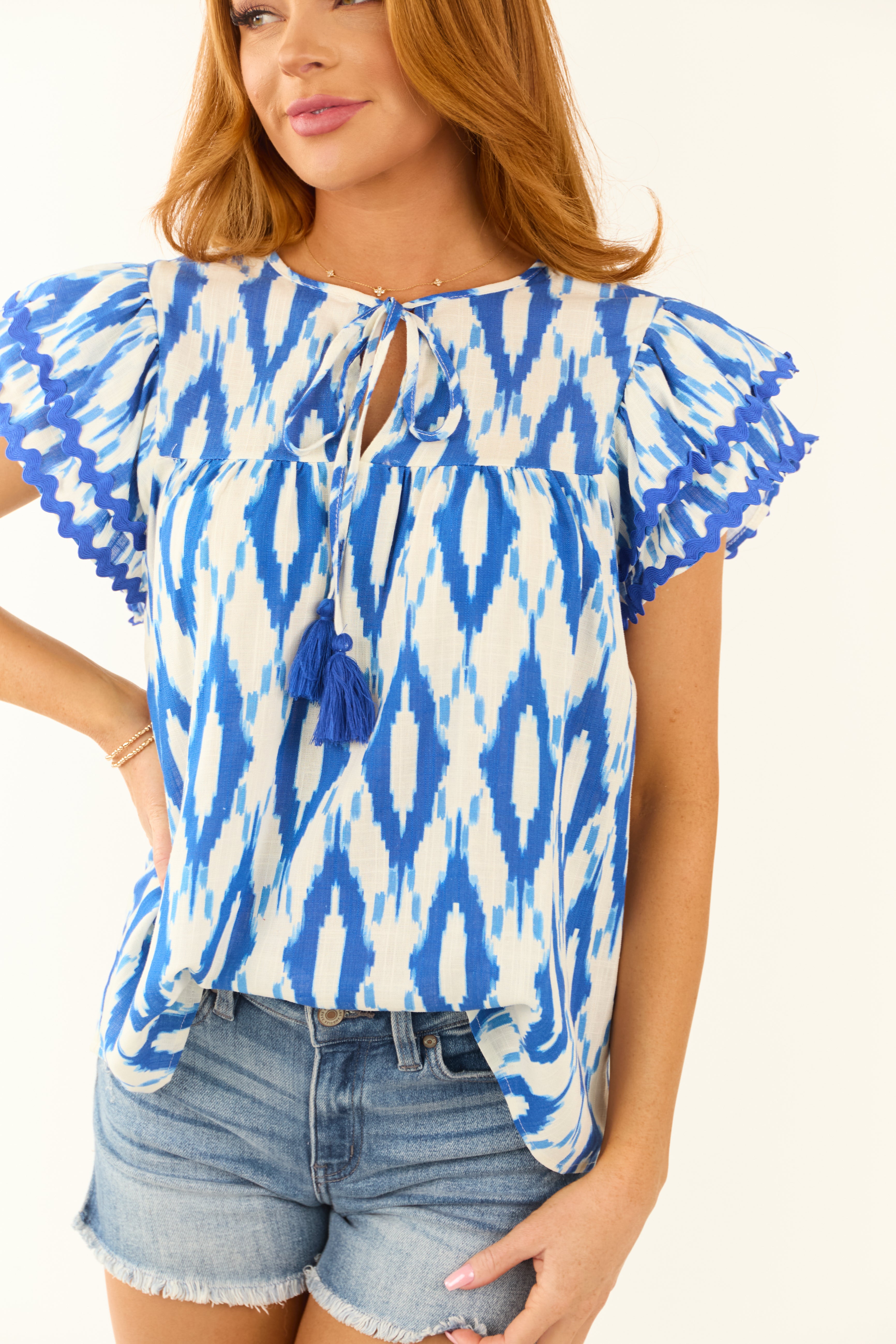 Stay fashionable in this Cobalt Abstract Ruffle Sleeve Blouse . Available in sizes S, M, L with a loose fit, notched v neckline, and front tassel tie. Made of 30% Linen and 70% Rayon. Perfect for Spring and Summer occasions, this blouse offers a unique pattern in Cobalt, Sapphire, and Ivory shades. Hand wash cold. Imported.