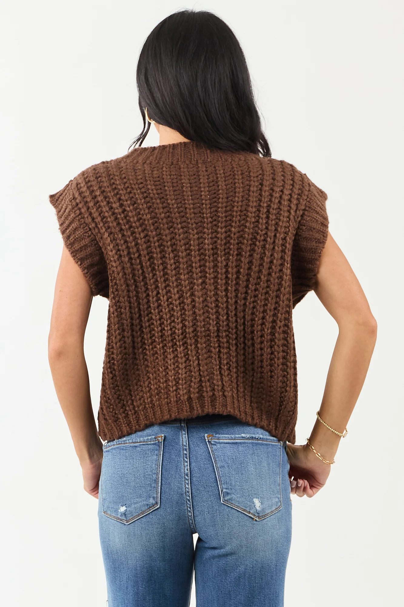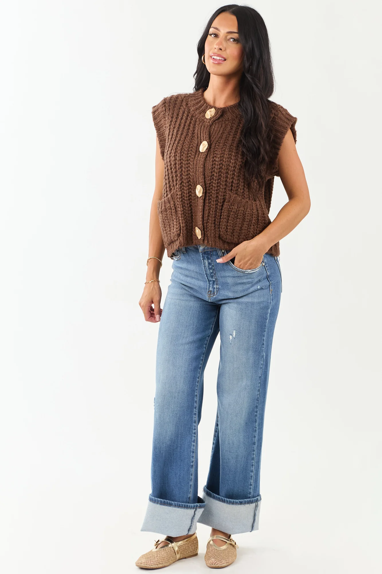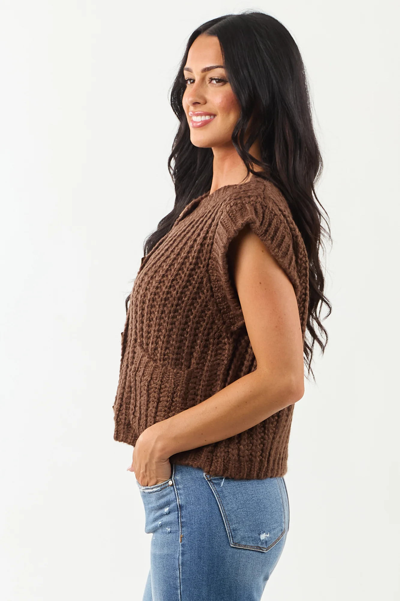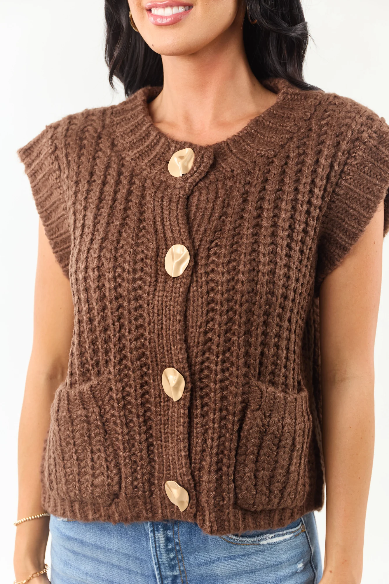 Wrap yourself in warmth with this cozy cocoa knit sweater vest featuring stylish gold buttons. Whether worn alone or layered over a blouse, this thick rib-knit vest offers an oversized fit for a chic cold-weather ensemble. Front pockets and ribbed trim add practicality and flair to this 100% Acrylic garment. Imported for quality, it boasts an elegant design suitable for various occasions. Embrace comfort and style effortlessly with this versatile piece. Available in sizes S, M, and L.
