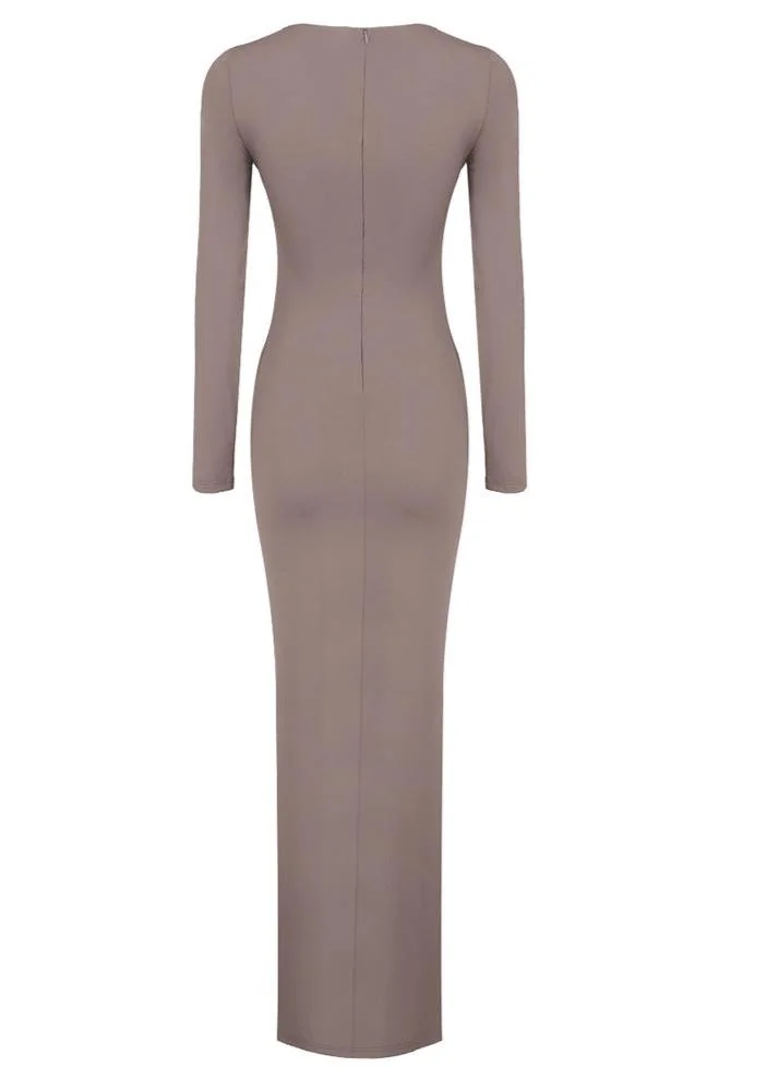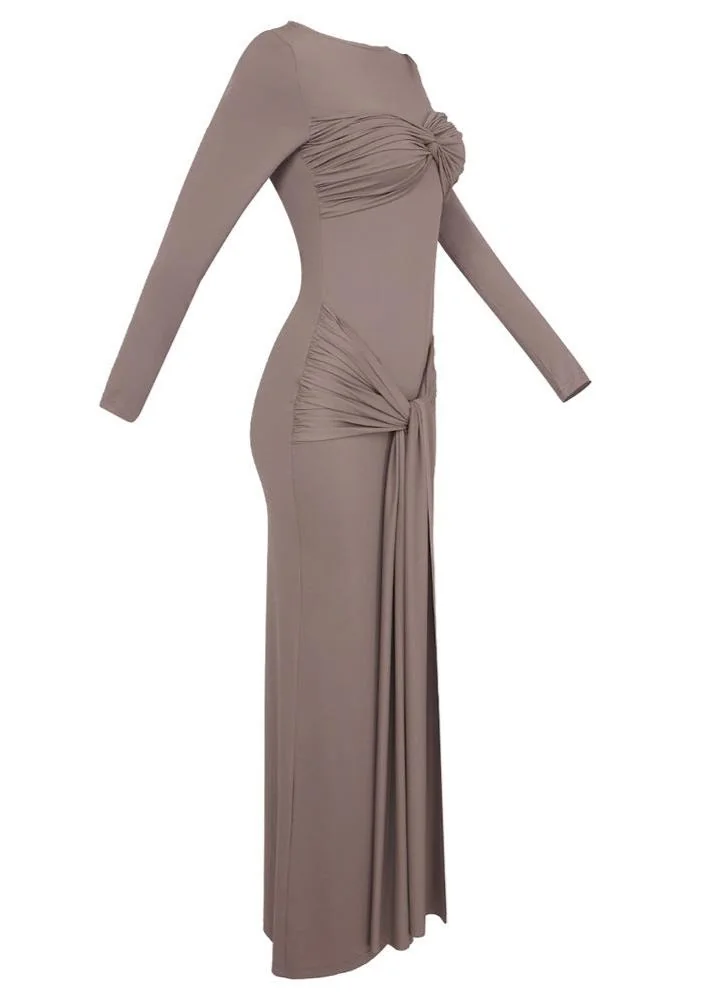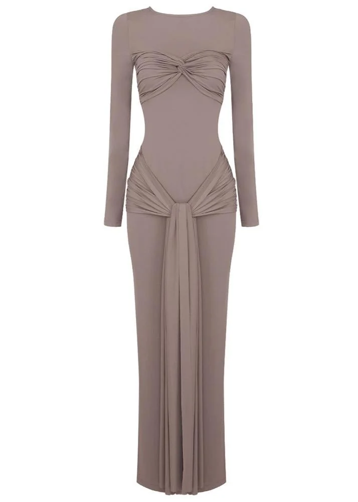 Indulge in the sophisticated charm of our coffee maxi dress, embellished with a chic ribbon knot detail on the round neckline. This 100% polyester attire ensures all-day comfort and a quirky touch to your look. Whether it’s a casual outing or a special event, this dress, designed true to size, promises a perfect fit. Discover effortless chic with this versatile piece in your wardrobe. Dry clean only.
