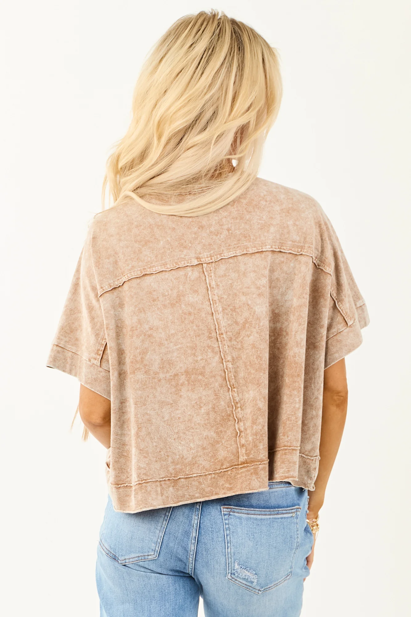 Stay effortlessly stylish with our Coffee Washed Cotton Boxy Oversized Short Sleeve Top . Designed for everyday comfort and chic simplicity, this top features raw seams, a chest pocket, and a wide boxy fit for a relaxed yet fashionable look. Made of stretchy lightweight cotton, it offers both comfort and style. Each piece is unique due to the dying and washing process. Available in S/M and L/XL sizes: S/M Bust 58-64 inches, Length 20.5 inches, Sleeve Length 8.5 inches; L/XL Bust 64 inches, Length 21.5 inches, Sleeve Length 9.5 inches. Imported. Model is wearing a size Small. Model’s Profile: Size 1, Height 57″, Bust 34″, Waist 26″.