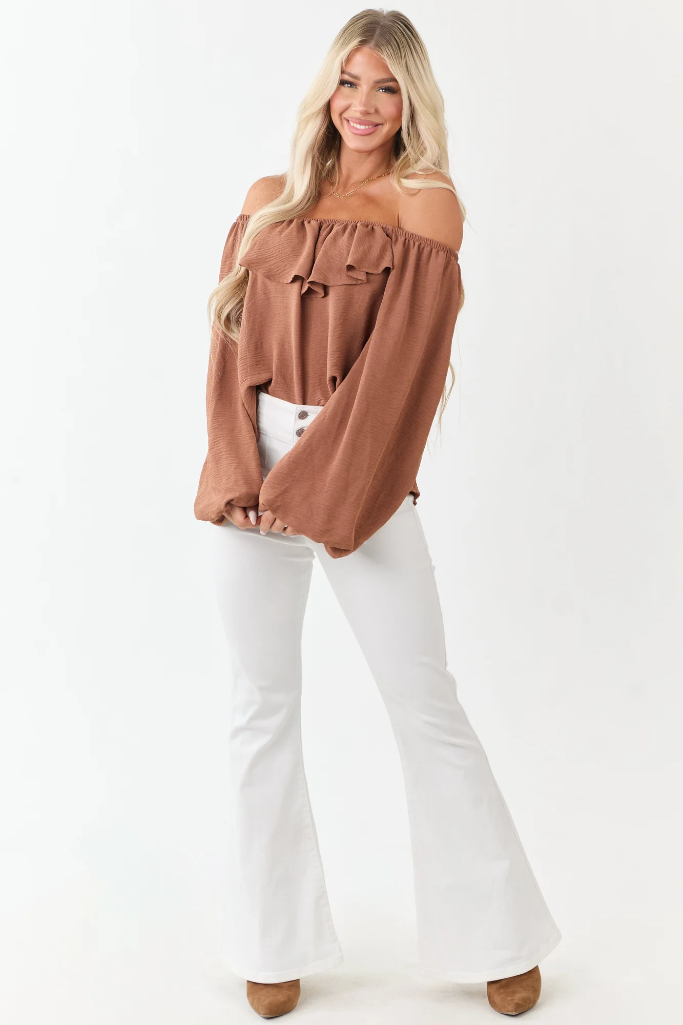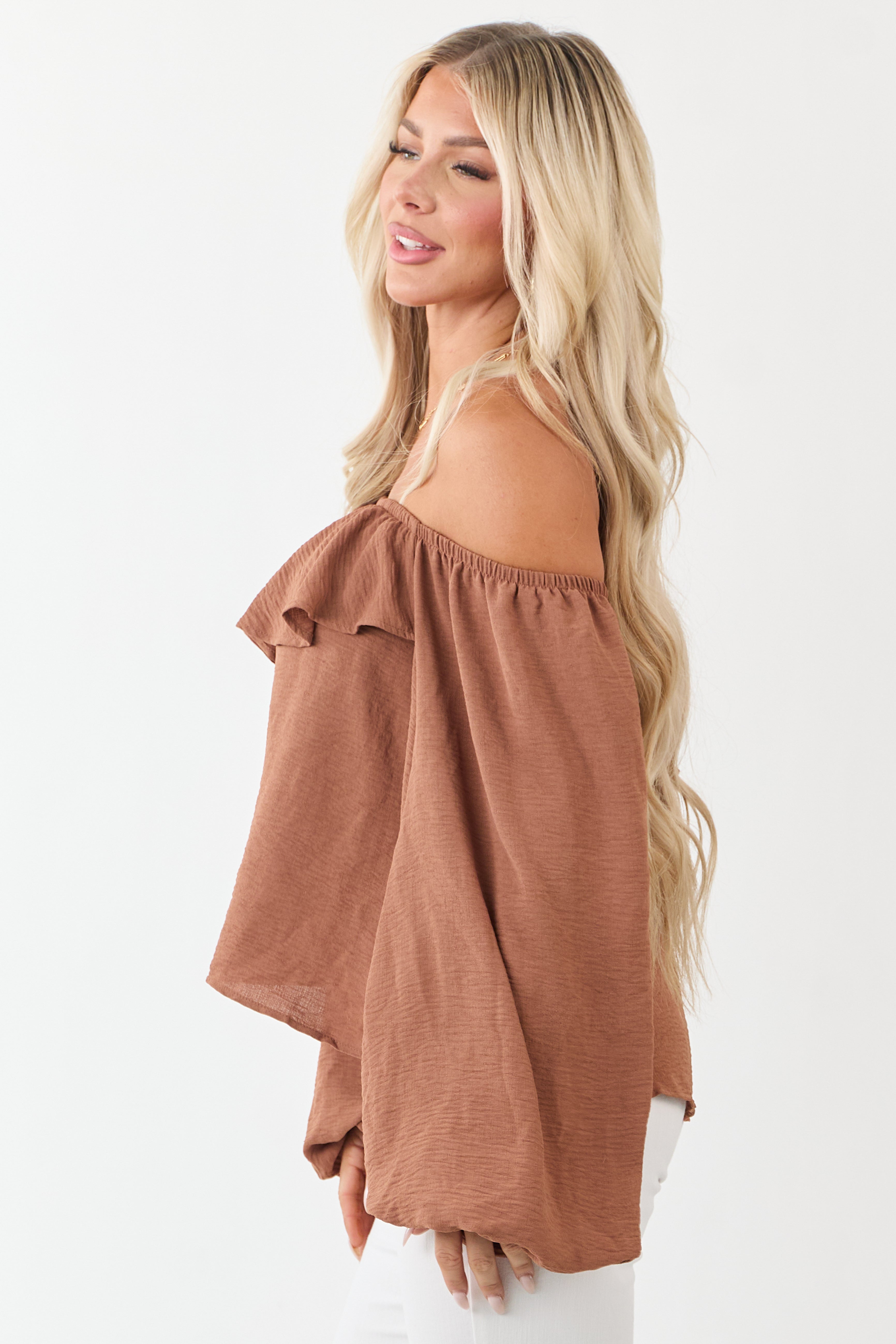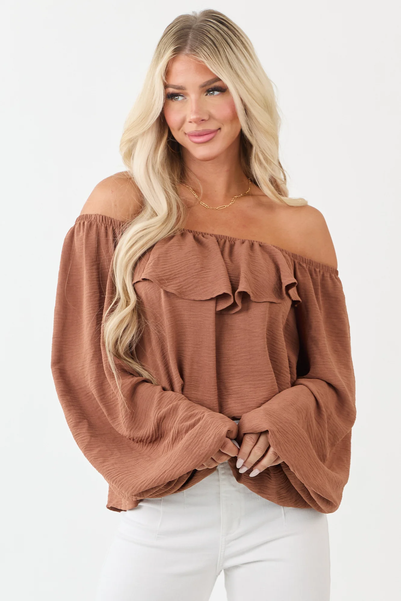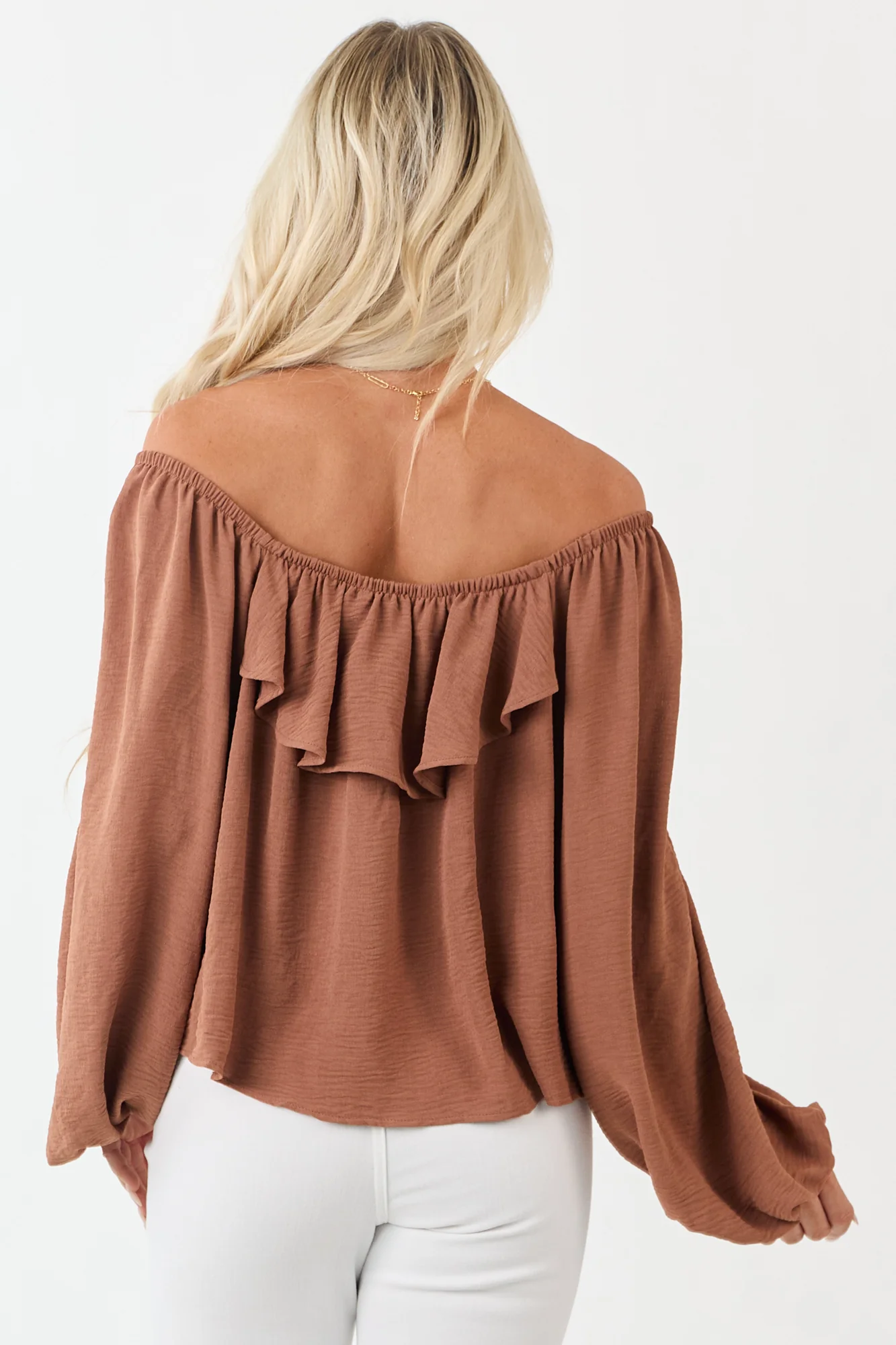 Indulge in the rich charm of this cognac top featuring a boho style with an elastic neckline that can be worn on or off the shoulders. Designed with a relaxed, boxy fit, ruffle yoke detail, and semi-cropped length, this top exudes comfort and fashion. The 100% polyester fabric offers durability and easy care. Elevate your wardrobe with this versatile piece perfect for casual outings or special occasions. Available in sizes S, M, L.