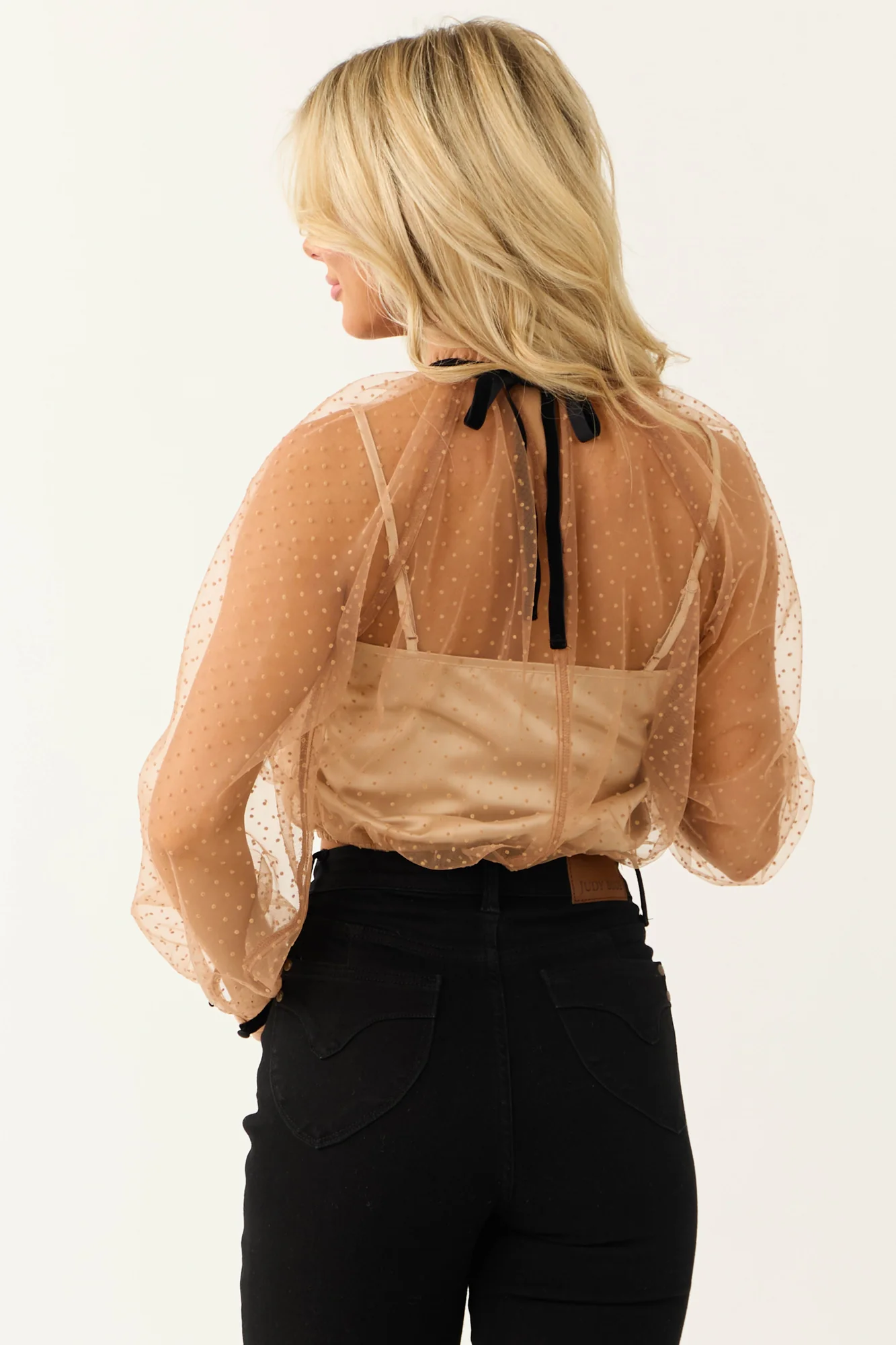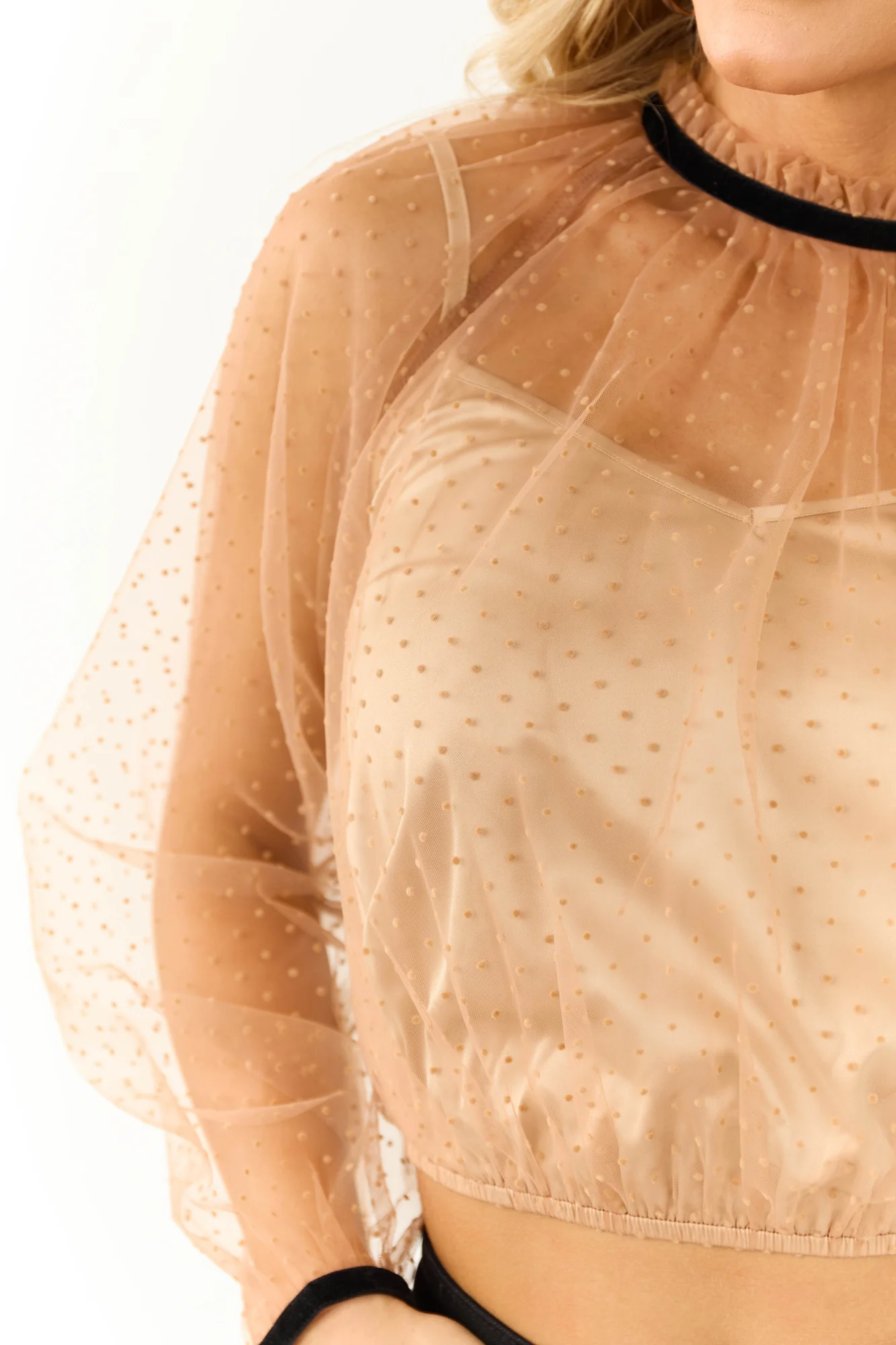 Indulge in the luxurious feel of our Cognac Textured Mesh Long Sleeve Top. Crafted from semi-stretchy mesh with a frill high neck and button cuffs, this top features a back keyhole with tie closure and an attached V neck satin camisole for a stylish touch. Lined for comfort, this top is perfect for a chic night out. Care Instructions: Hand wash cold with like colors, do not bleach, hang to dry.