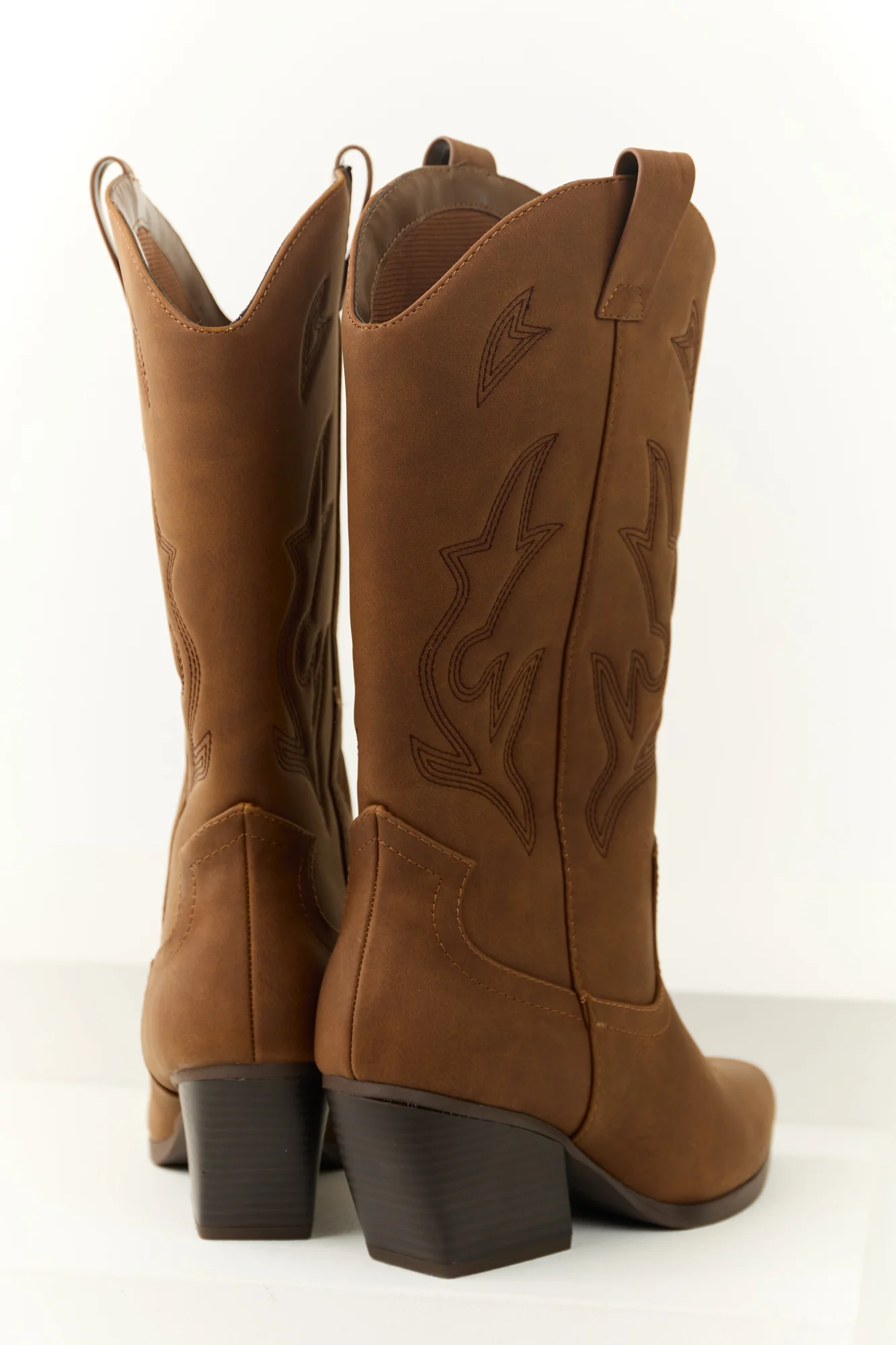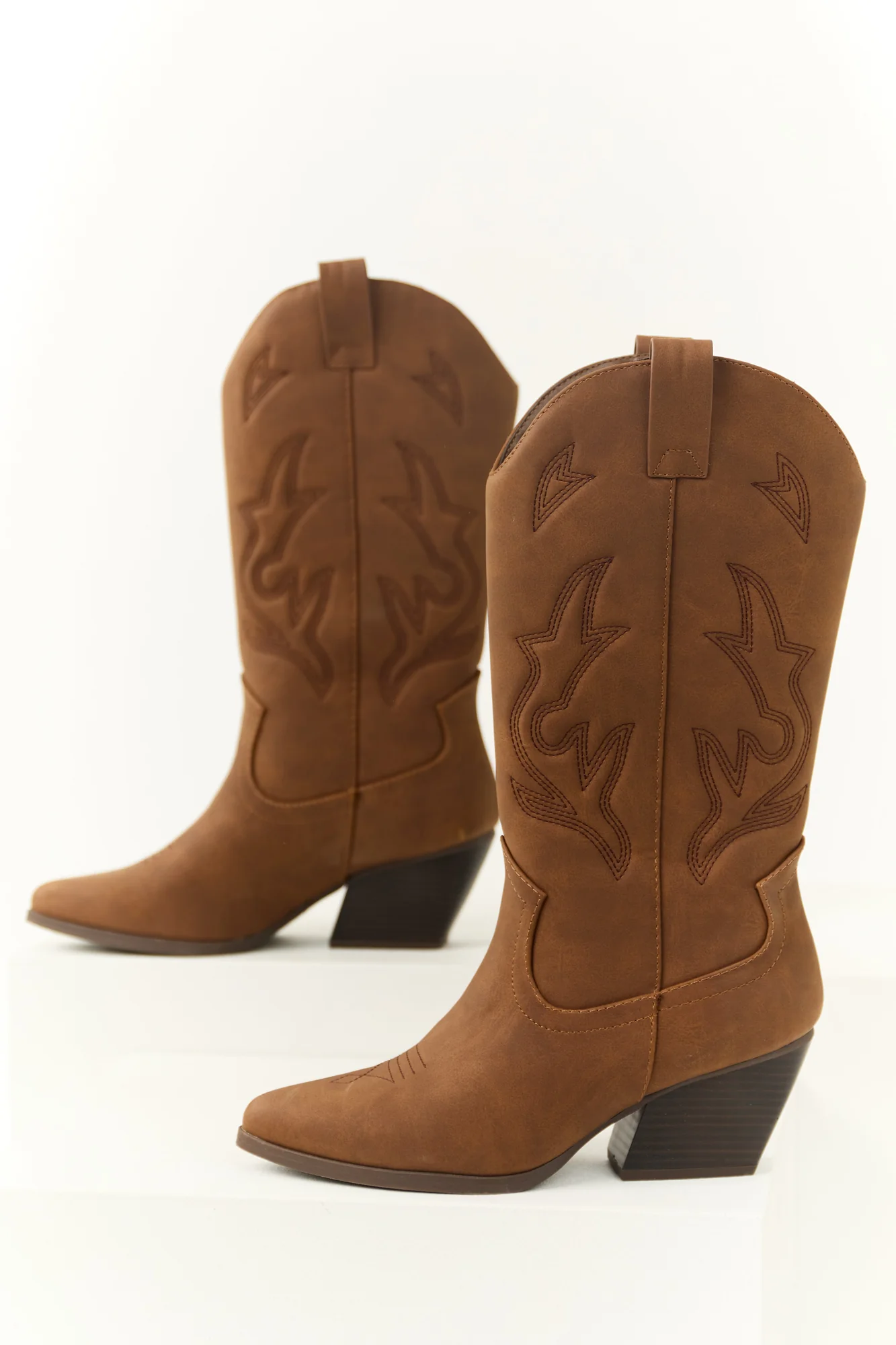 Step out in style with these elegantly designed cognac western boots. Crafted from faux suede with a stacked block heel, curved opening, and pointed toe, these boots also feature pull tabs for easy wear. The 13″ shaft and 18″ circumference provide a comfortable fit, while the 3″ heel adds a touch of sophistication. Imported, available in sizes 5.5 to 11.