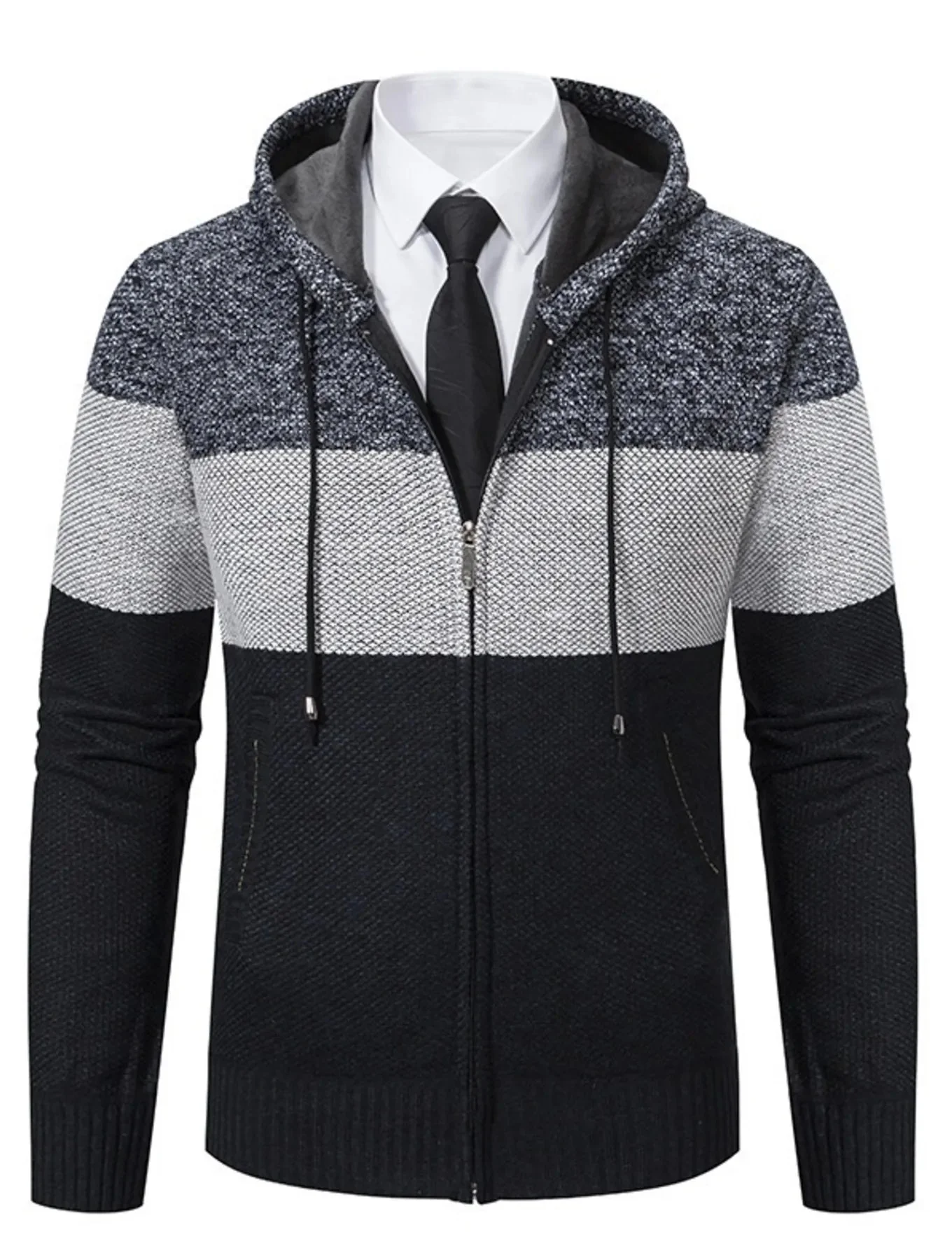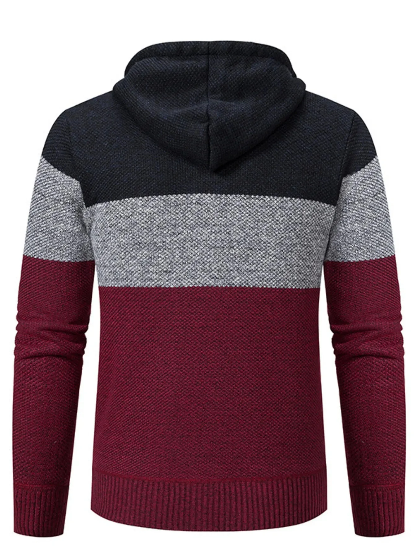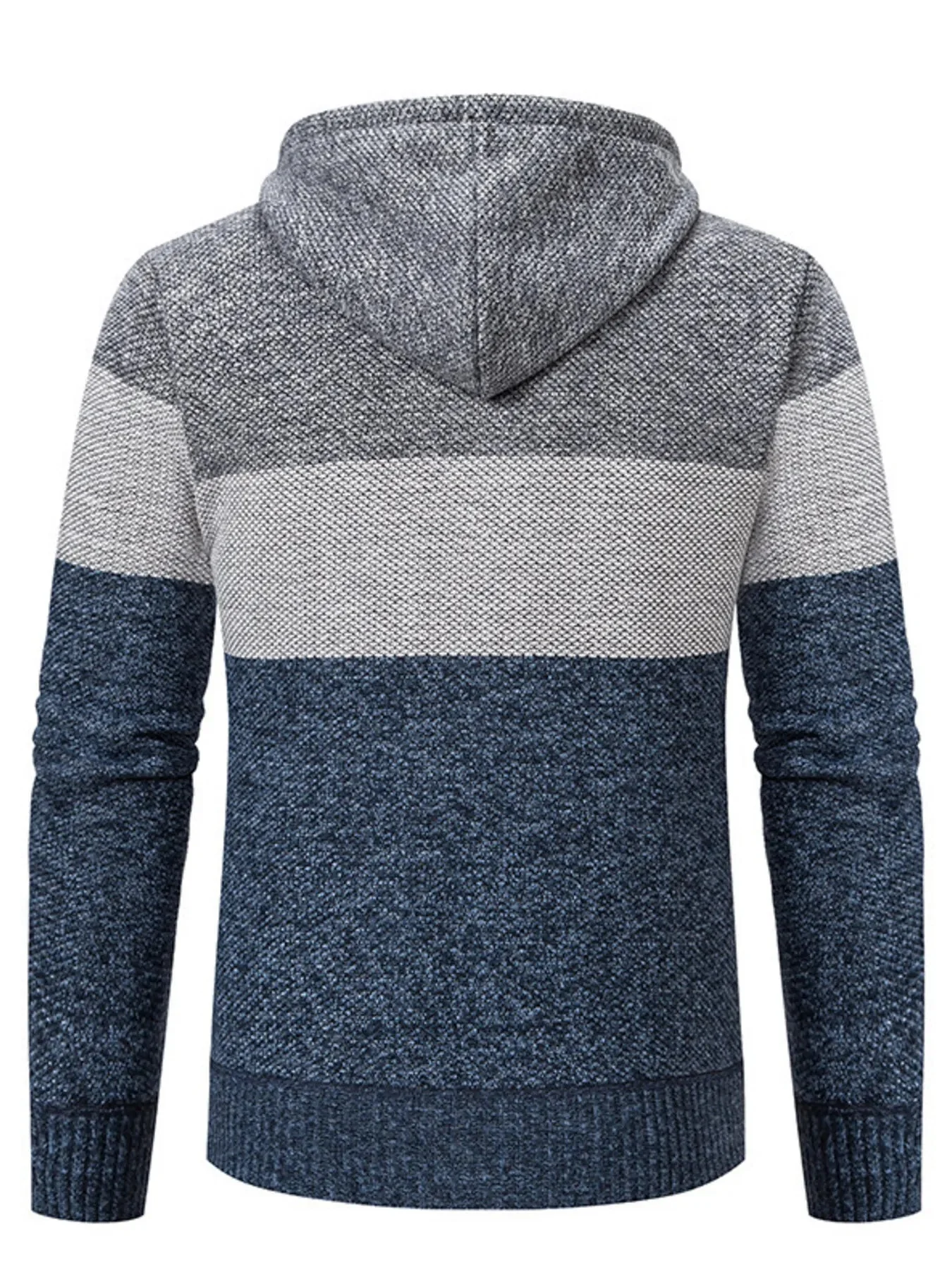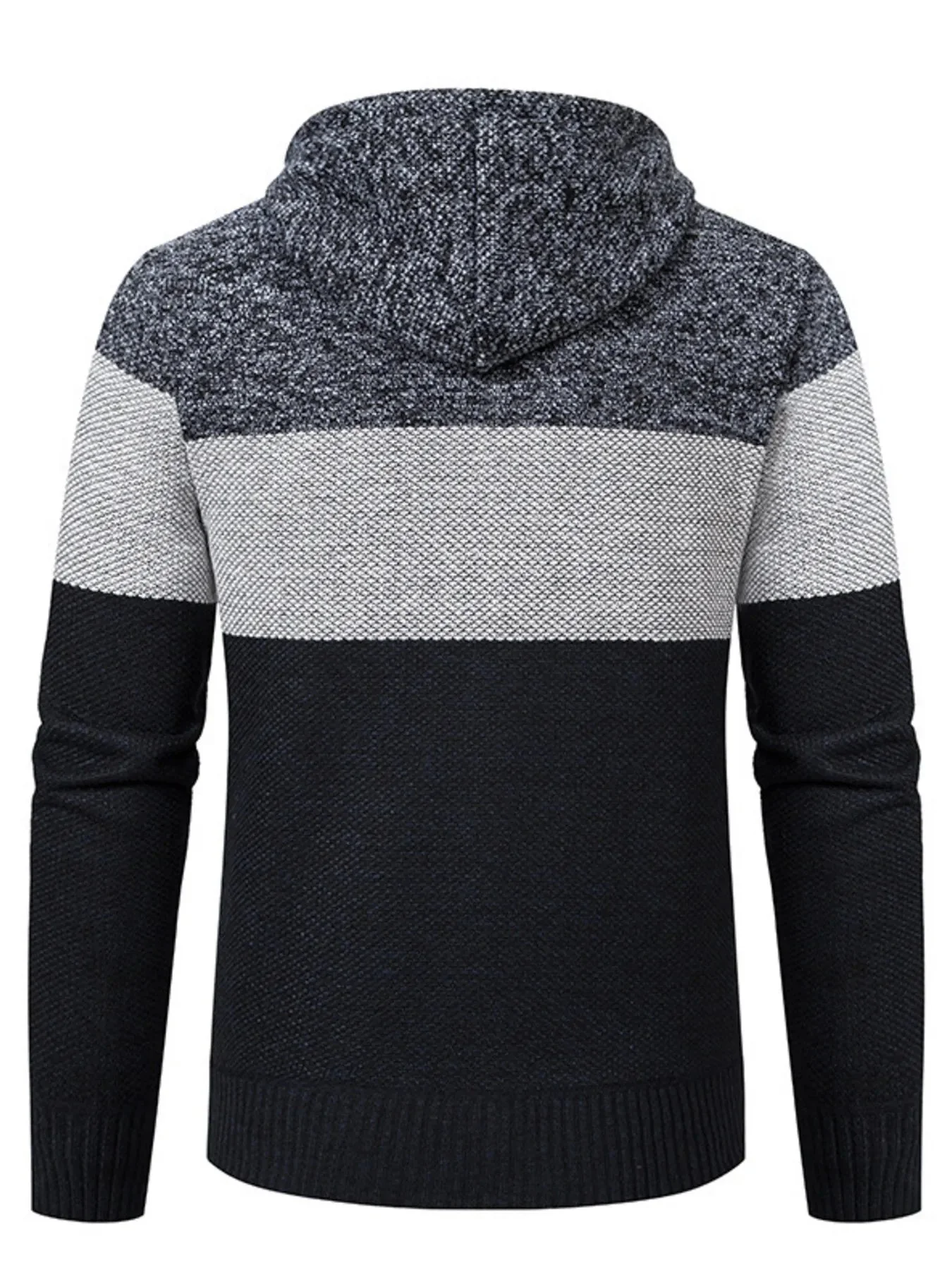 Stay stylish and cozy with our Color Block Hooded Zip-Up Cardigan for men. This cable-knit cardigan features a drawstring and zipper for added flair. Made of 95% polyester and 5% spandex, it offers slight stretch for comfort. This versatile piece is machine washable for easy care. Available in multiple sizes to 4XL.