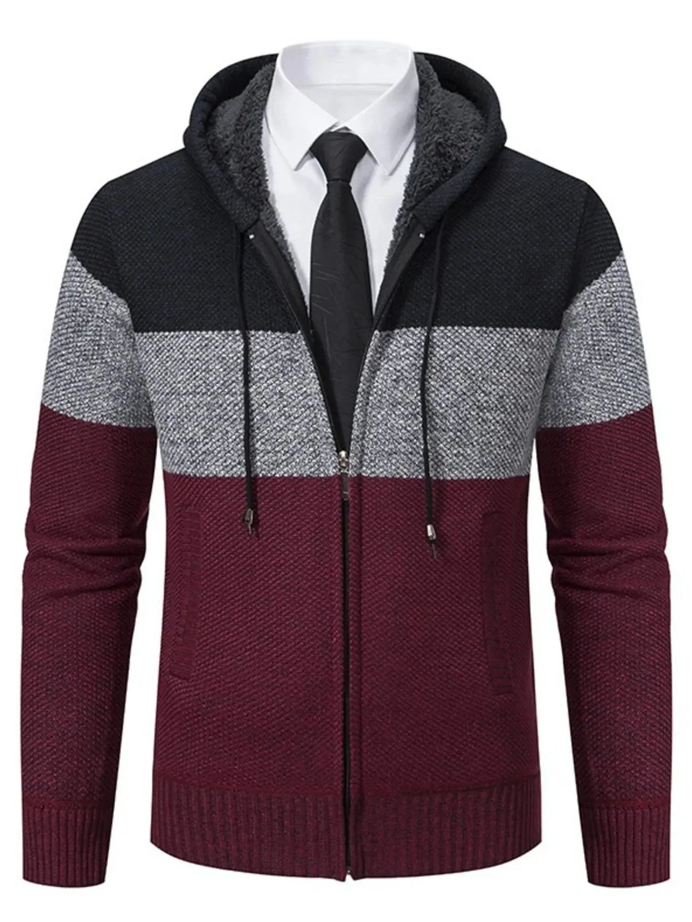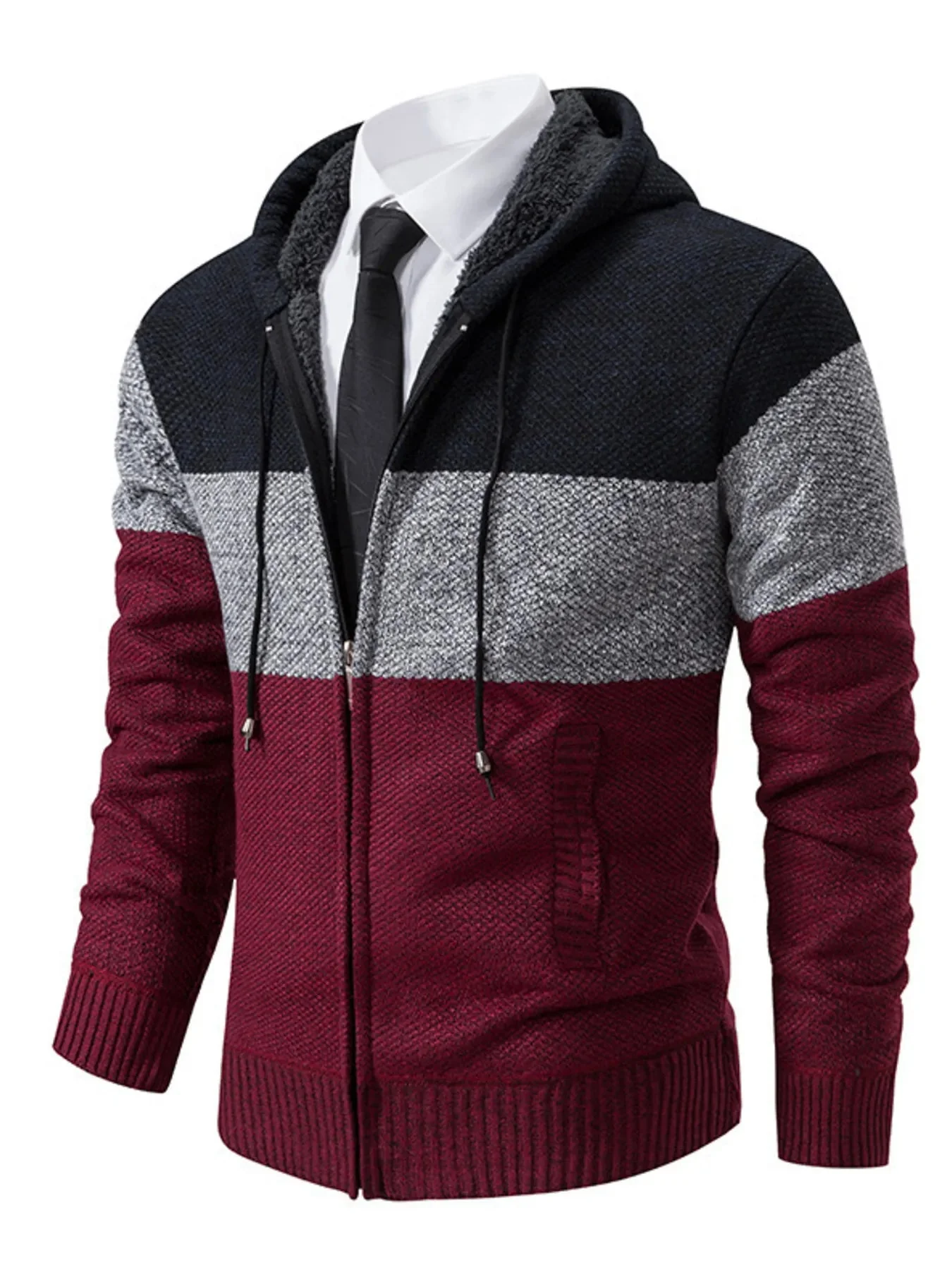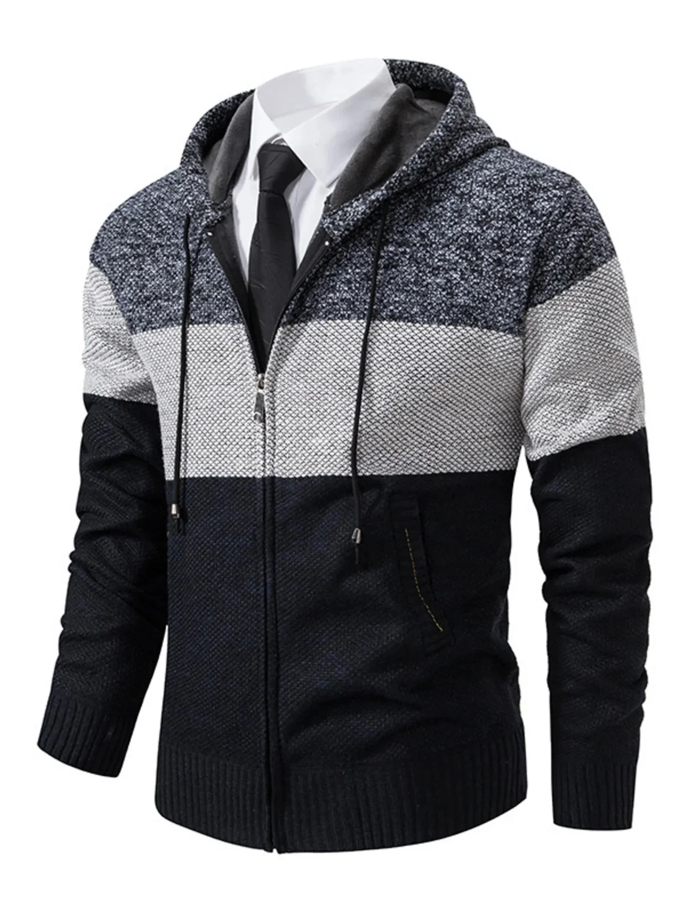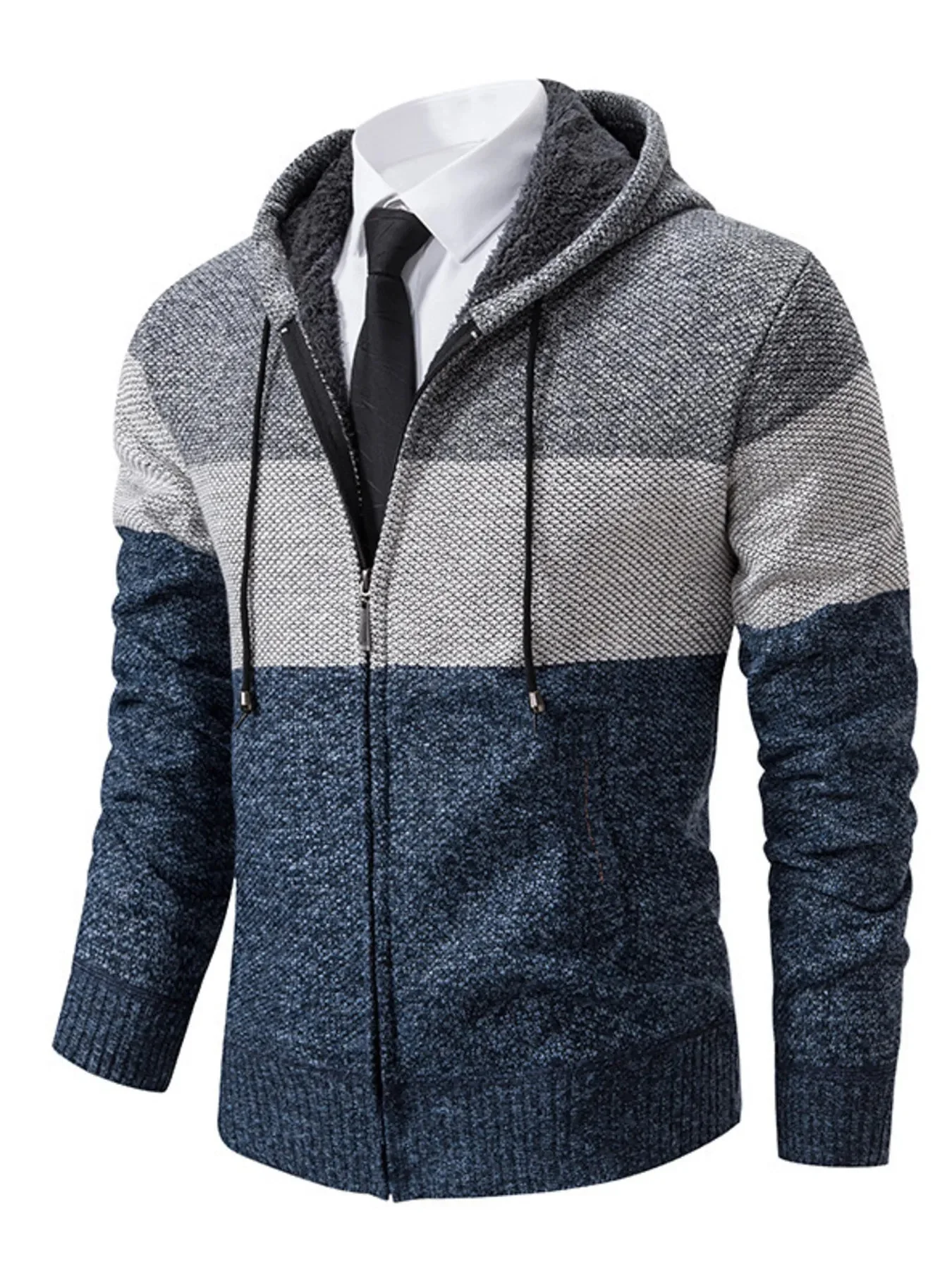 Stay stylish and cozy with our Color Block Hooded Zip-Up Cardigan for men. This cable-knit cardigan features a drawstring and zipper for added flair. Made of 95% polyester and 5% spandex, it offers slight stretch for comfort. This versatile piece is machine washable for easy care. Available in multiple sizes to 4XL.
