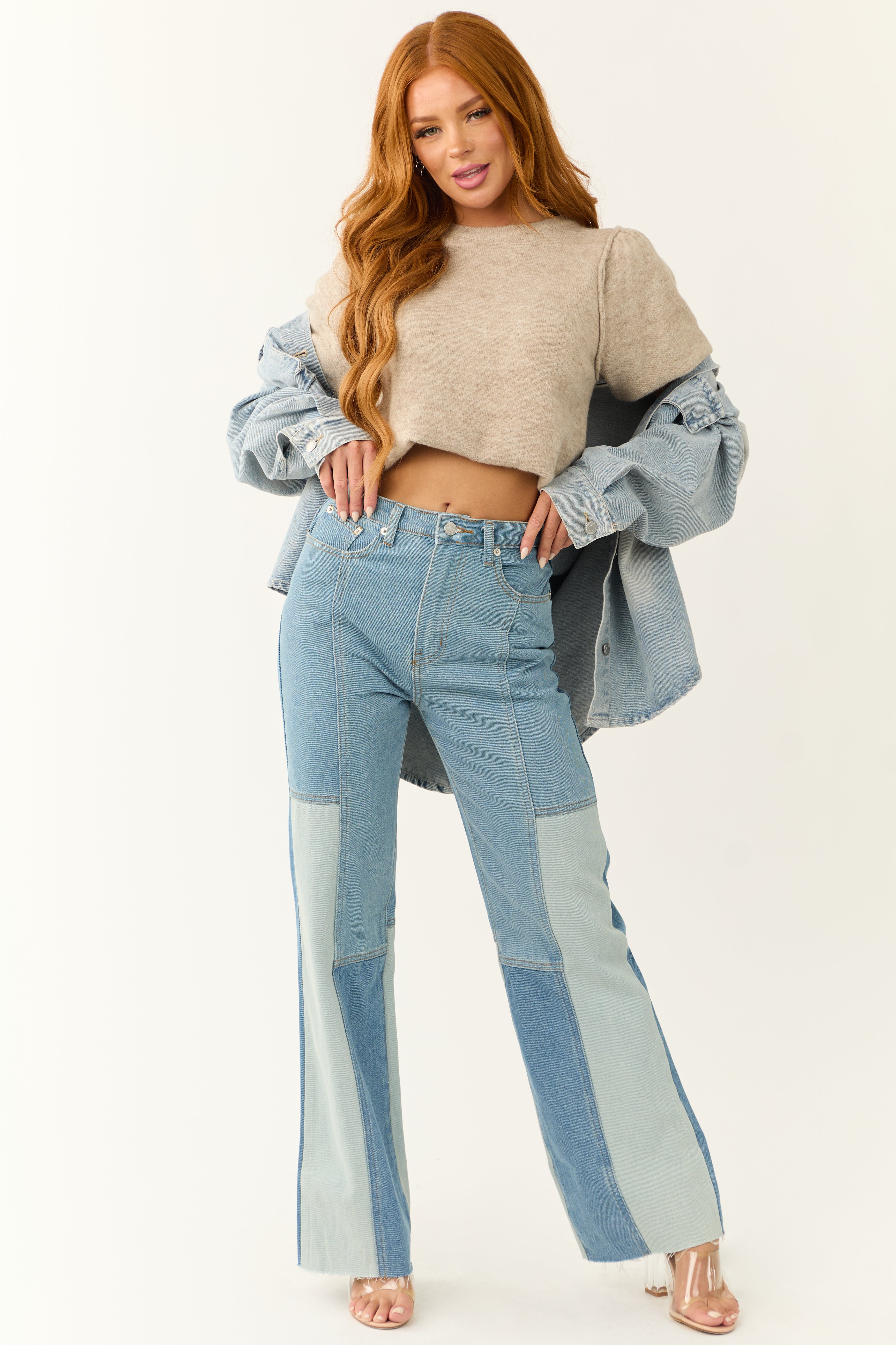 Discover the perfect blend of style and comfort with our Colorblock Wide Leg Jeans. Crafted from 100% cotton denim for a non-stretchy, classic feel. These high-rise jeans feature a raw hem, belt loops, and 5 pockets for practicality and fashion combined. Available in sizes S, M, and L with inseam options ranging from 30″ to 31″, ensuring a true fit for various body types. Bring a touch of vintage charm to your wardrobe with these imported denim pants. Model is wearing a size Small and measures 55″ in height with a bust of 31″ and a waist of 24″.