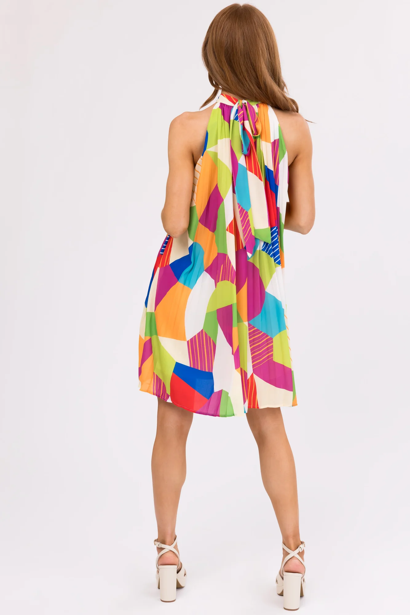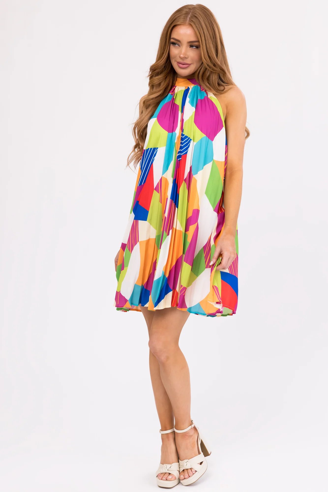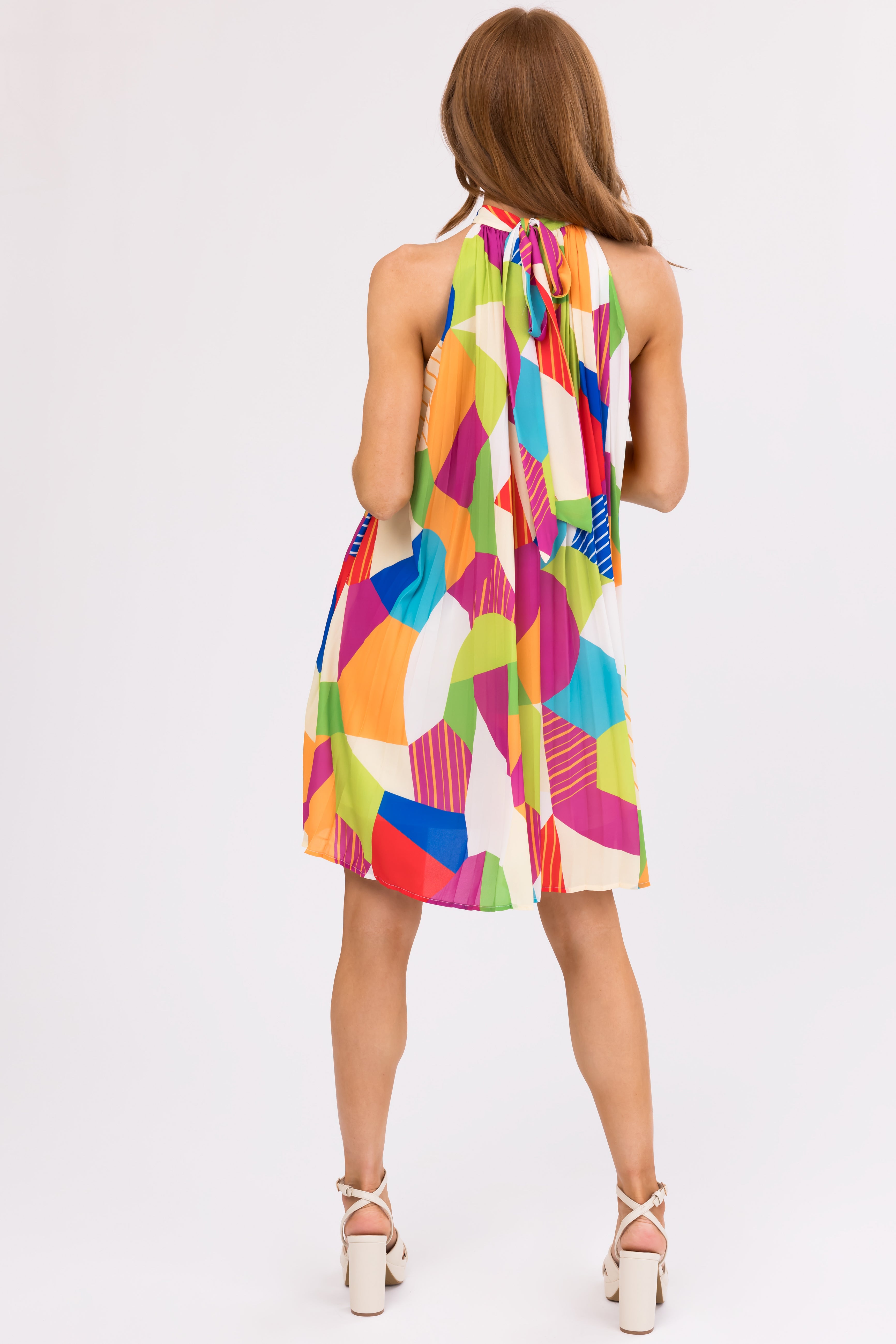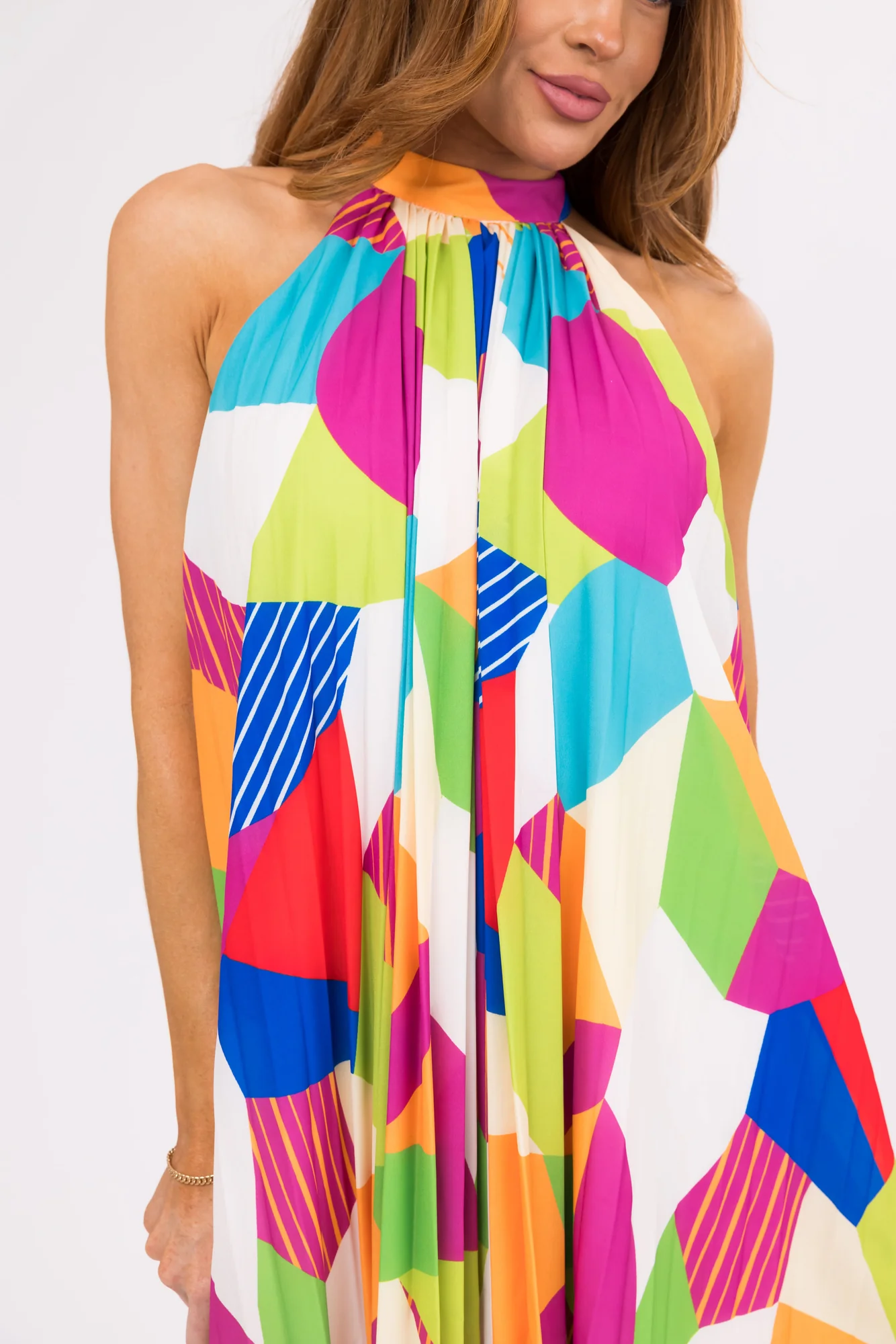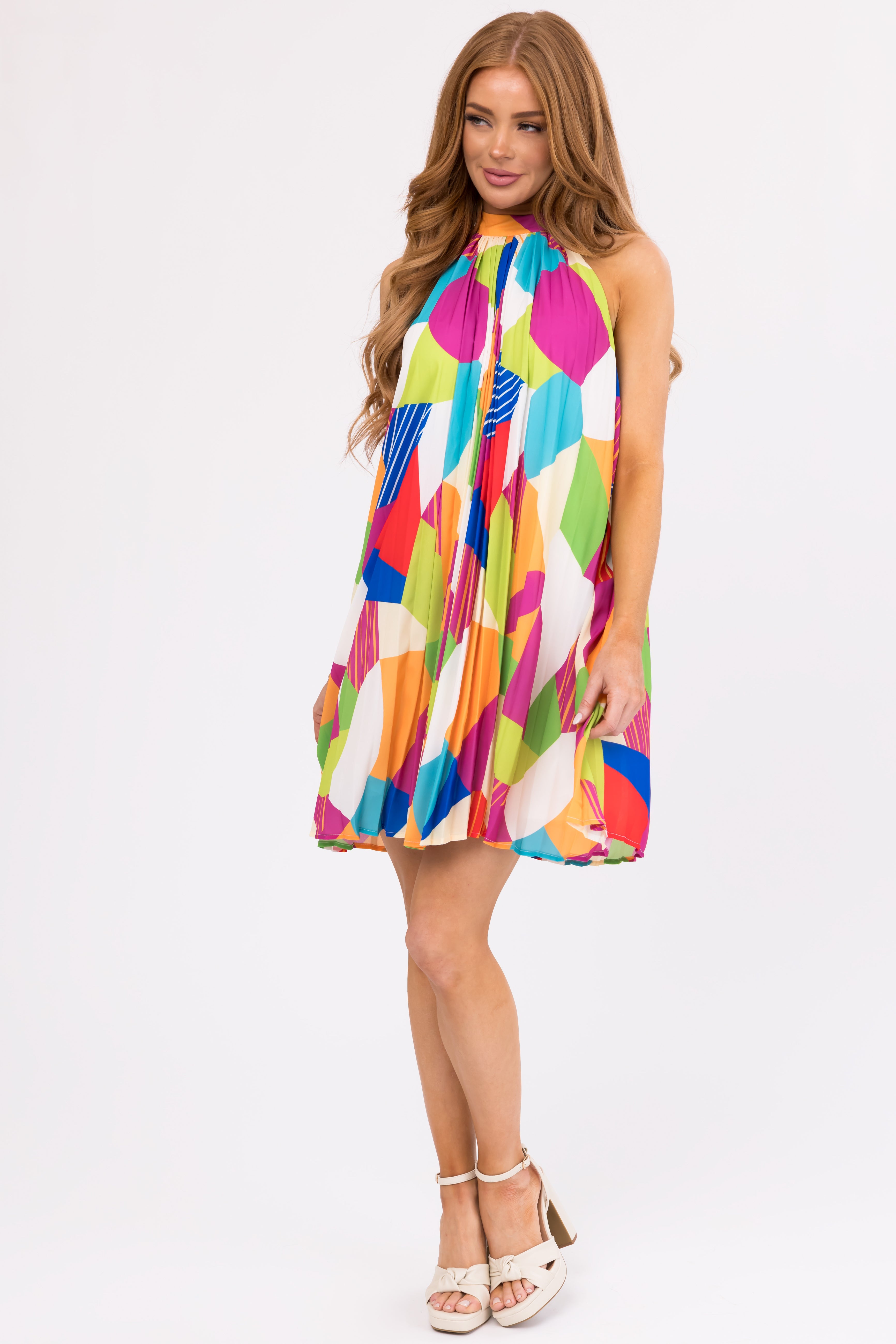 This stunning Geometric Pleated Halter Dress is a must-have for your summer wardrobe. With a loose a-line fit, adjustable tie halter neckline, and vibrant Geo pattern in Lime, Kiwi, Crimson, Royal Blue, and more, this dress is both stylish and comfortable. Made of 100% Polyester, this dress is perfect for daytime or party wear. Available in sizes S, M, and L. Hand wash cold, lay flat to dry. Model is wearing a size Small.