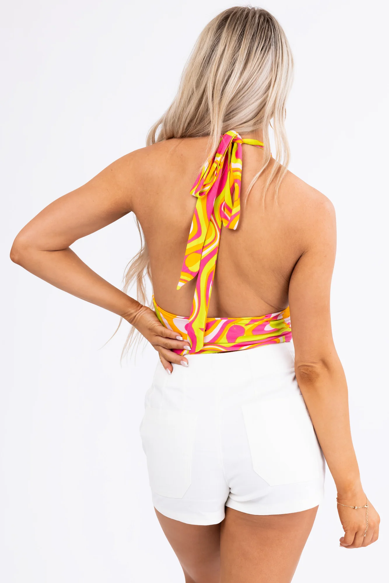 Elevate your wardrobe with our vibrant Colorful Halter Crop Tank Top in Tangerine and Magenta. This stylish piece features stretchy knit fabric, a keyhole front, and an open back for a trendy look. The neck tie closure adds a chic touch. Stay comfortable and chic in this unlined top made of 95% Polyester and 5% Spandex. Perfect for casual outings or special occasions. Available sizes: S, M, L, XL.