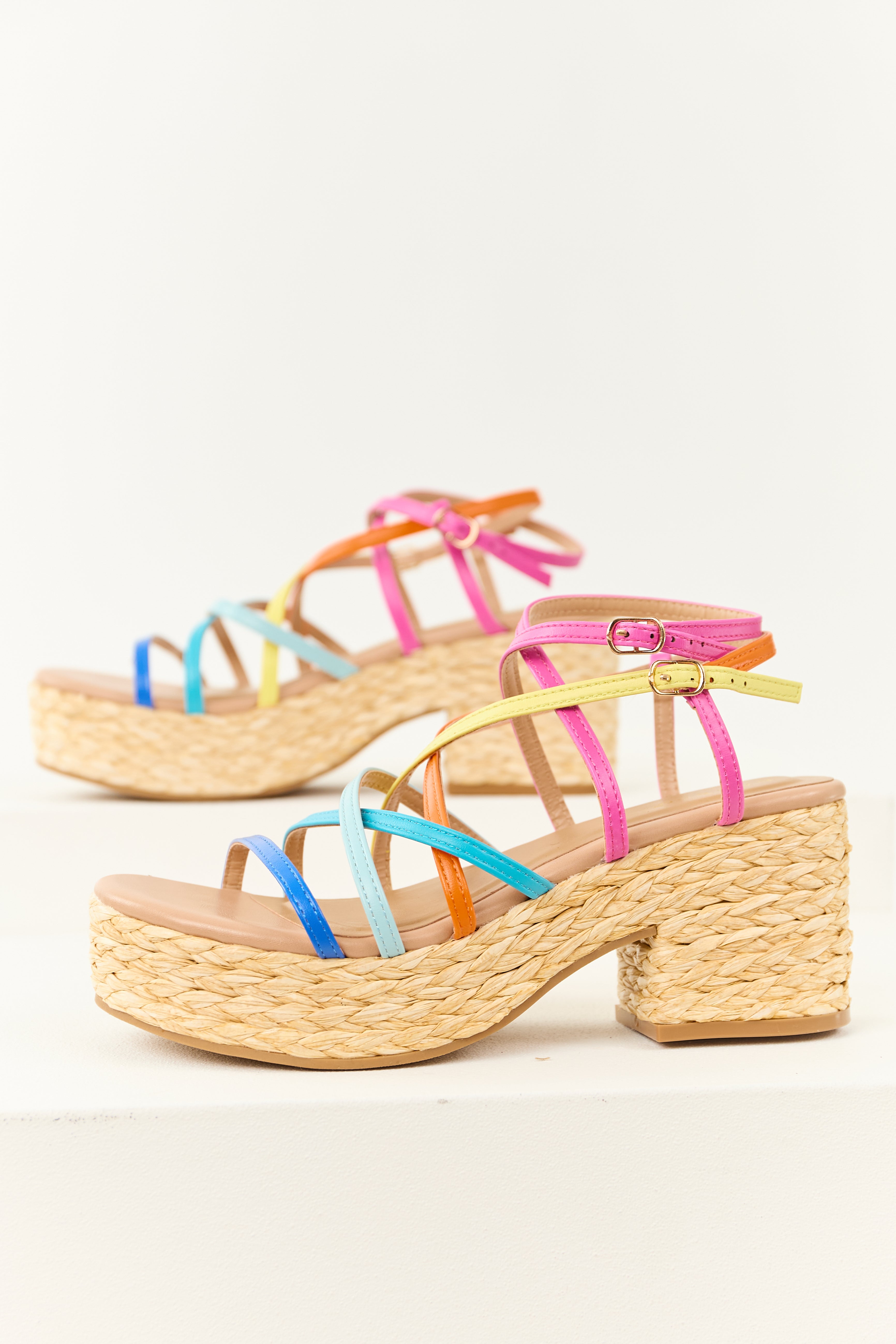 Step into bold style with these colorful raffia platform heels for a vibrant look. Featuring non-stretchy faux leather straps in shades of Magenta, Lemon, Sunset, Azure, Sky Blue, and Royal Blue. Designed with two adjustable buckle ankle straps, block heel, open rounded toe, and lightly cushioned insole. Shaft height: 5″, Heel height: 3″, Platform height: 1.5″, Circumference: 10″. Elevate your outfit with these party-ready heels! Product measured on size 8.