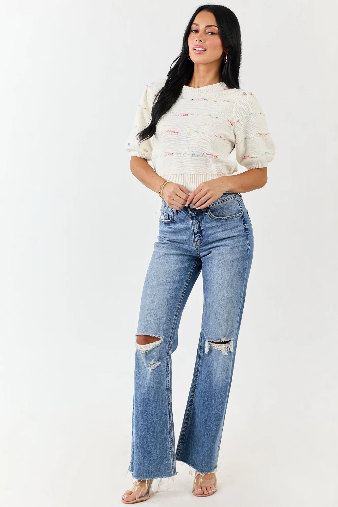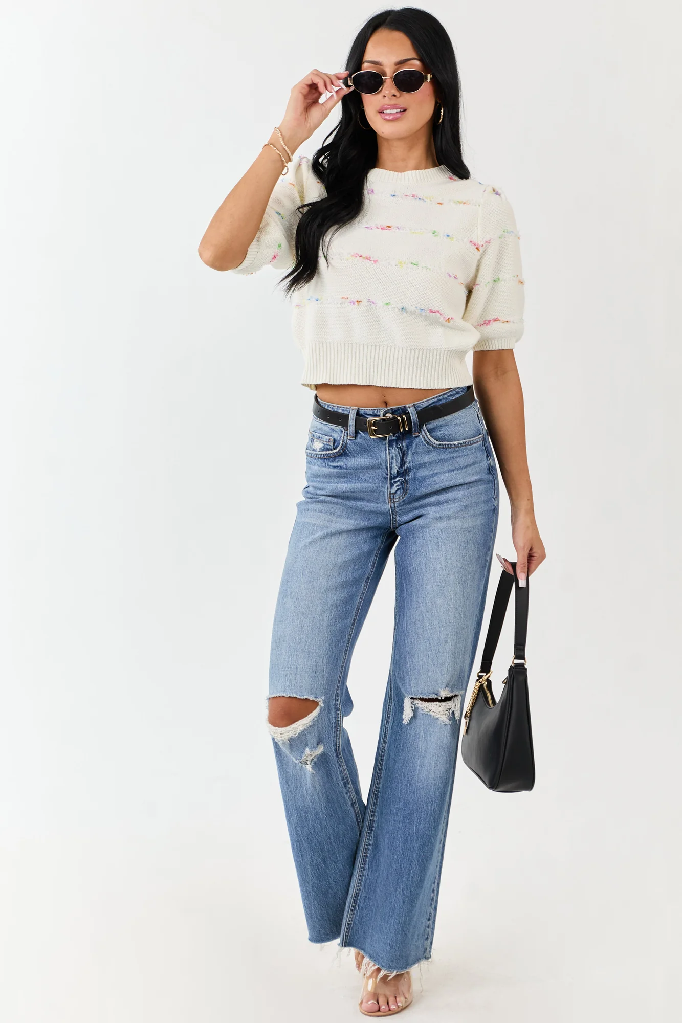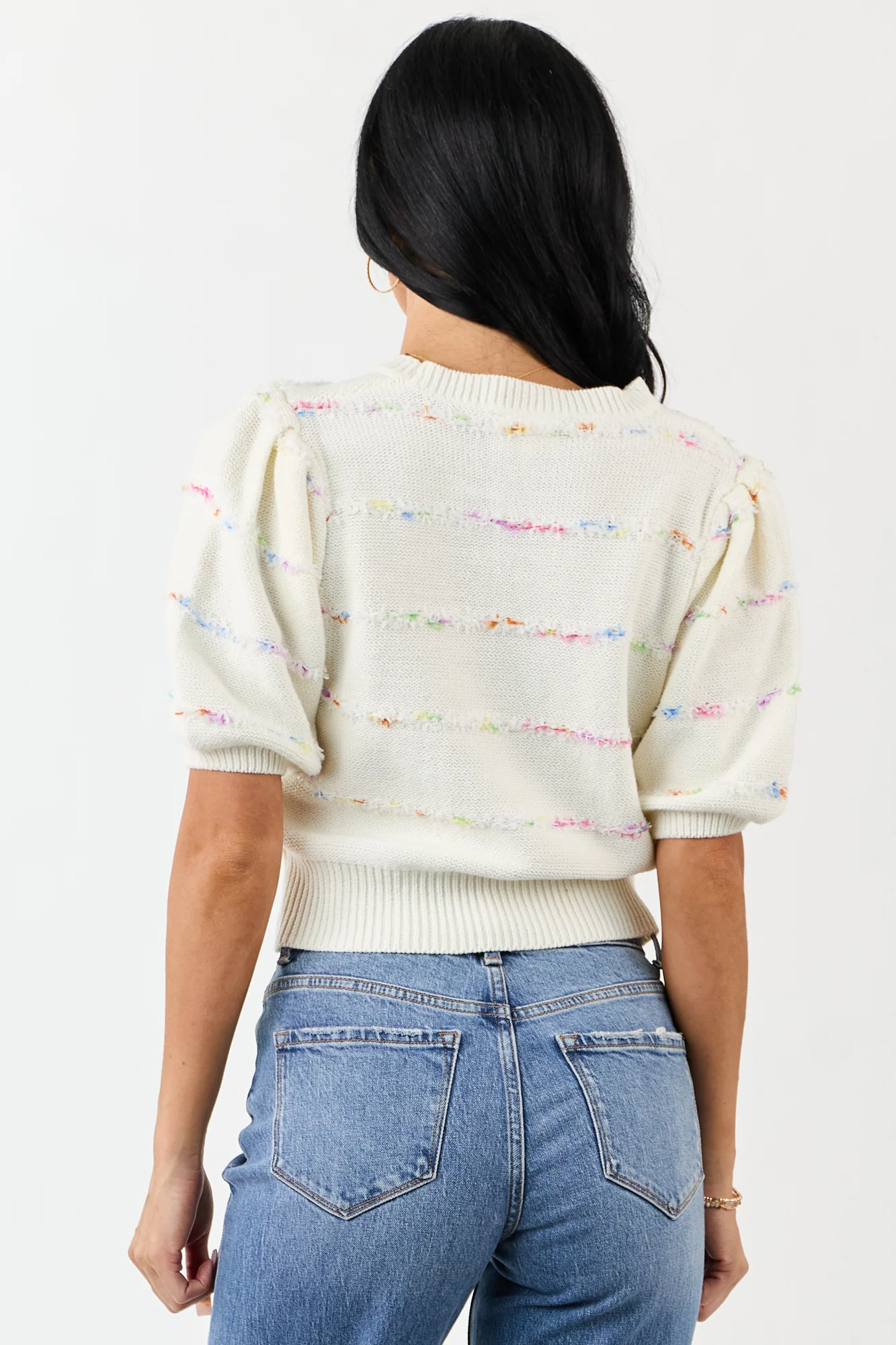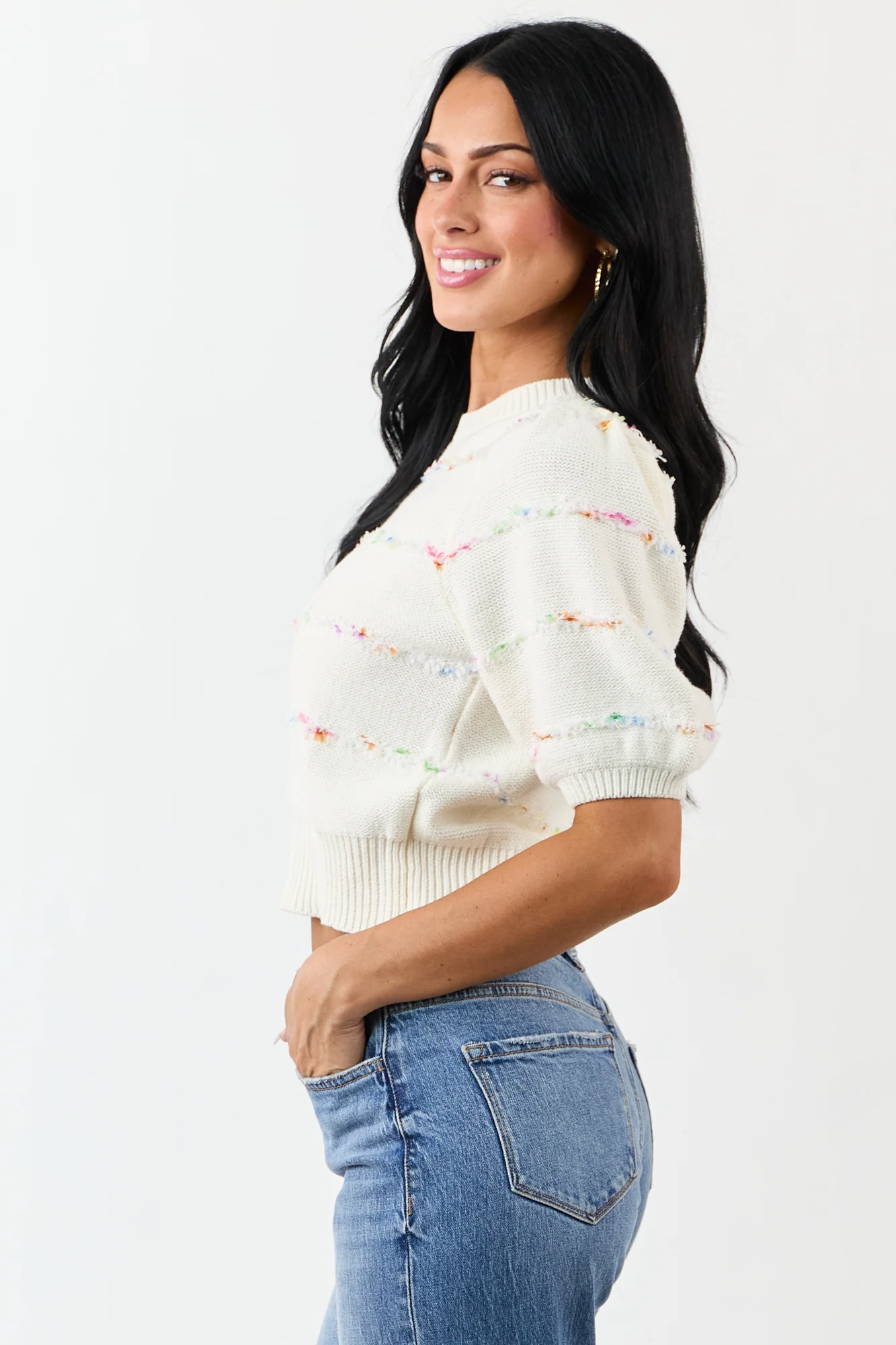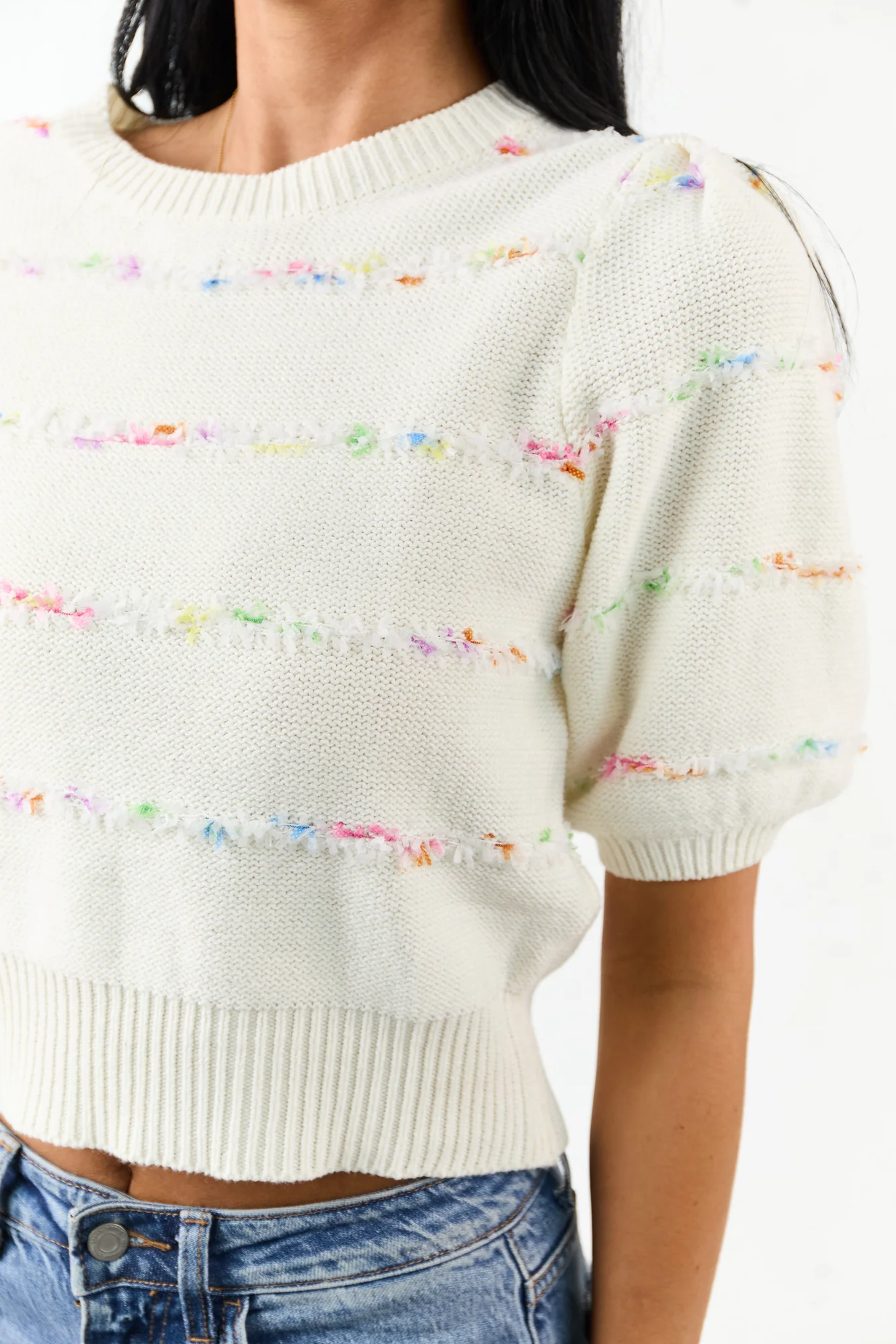 Elevate your wardrobe essentials with our vibrant Colorful Stripe Detail Half Sleeve Knit Sweater Top. Crafted from a blend of 60% cotton and 40% acrylic, this top features a playful raised colorful stitching design and a comfortable half-sleeve silhouette. The sweater boasts striped detailing in Off White, Tangerine, Lemon, Sage, Magenta, and Sapphire colors, accented by ribbed trim for added style. Imported with a contrasting 100% polyester component. Available in sizes S, M, and L. Model is wearing a size Small. Model’s Measurements: Size 1, Height 59″, Bust 34″, Waist 26″.