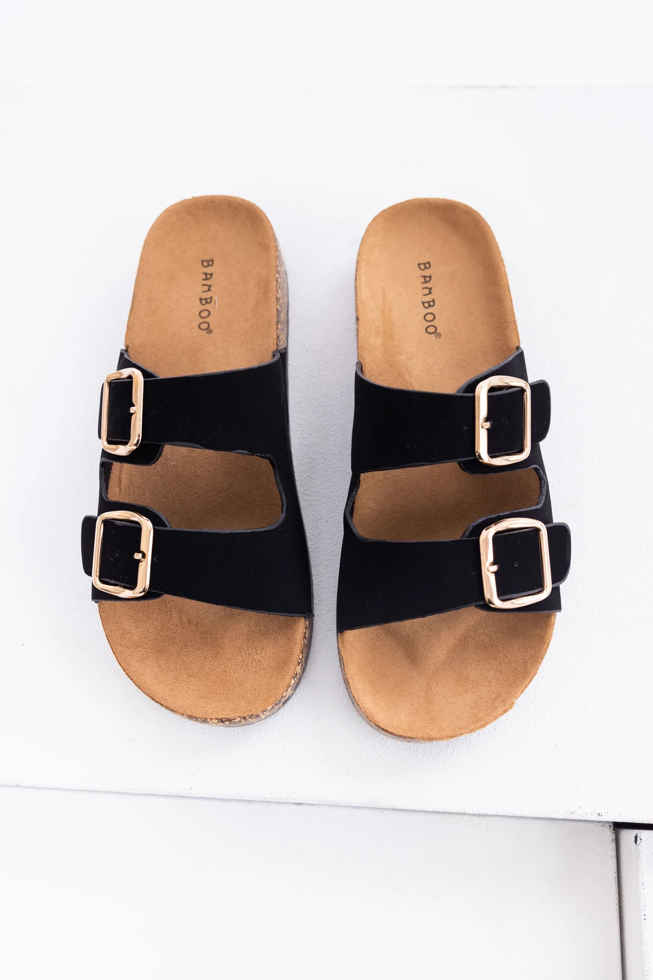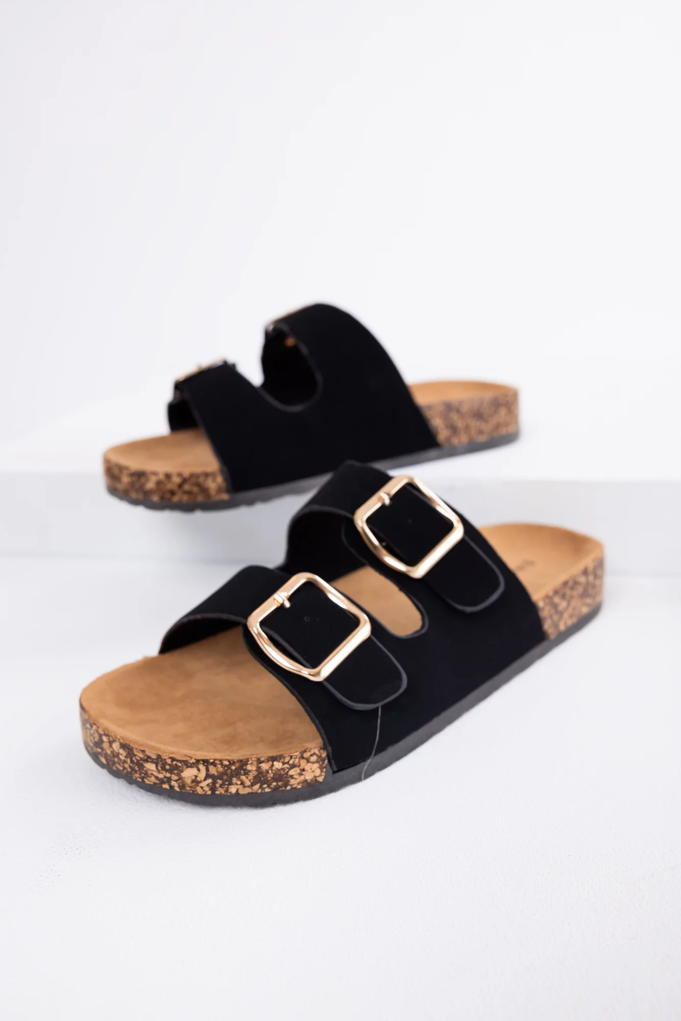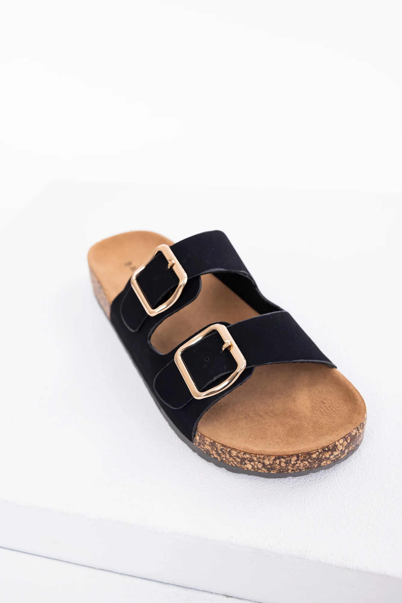 Tags: Black Slide On Platform Sandals, Comfy Suede Footbed, Cork Platform, Double Buckle Straps, Slip-on Style