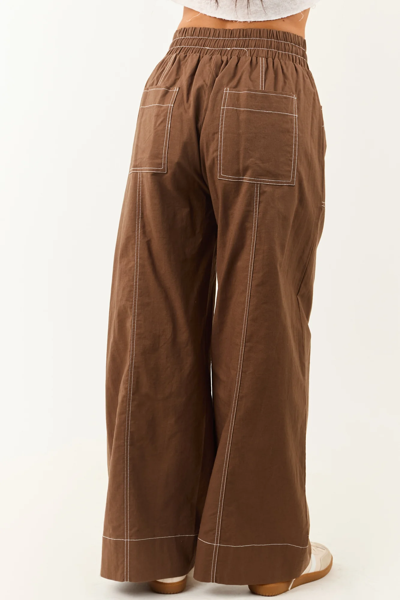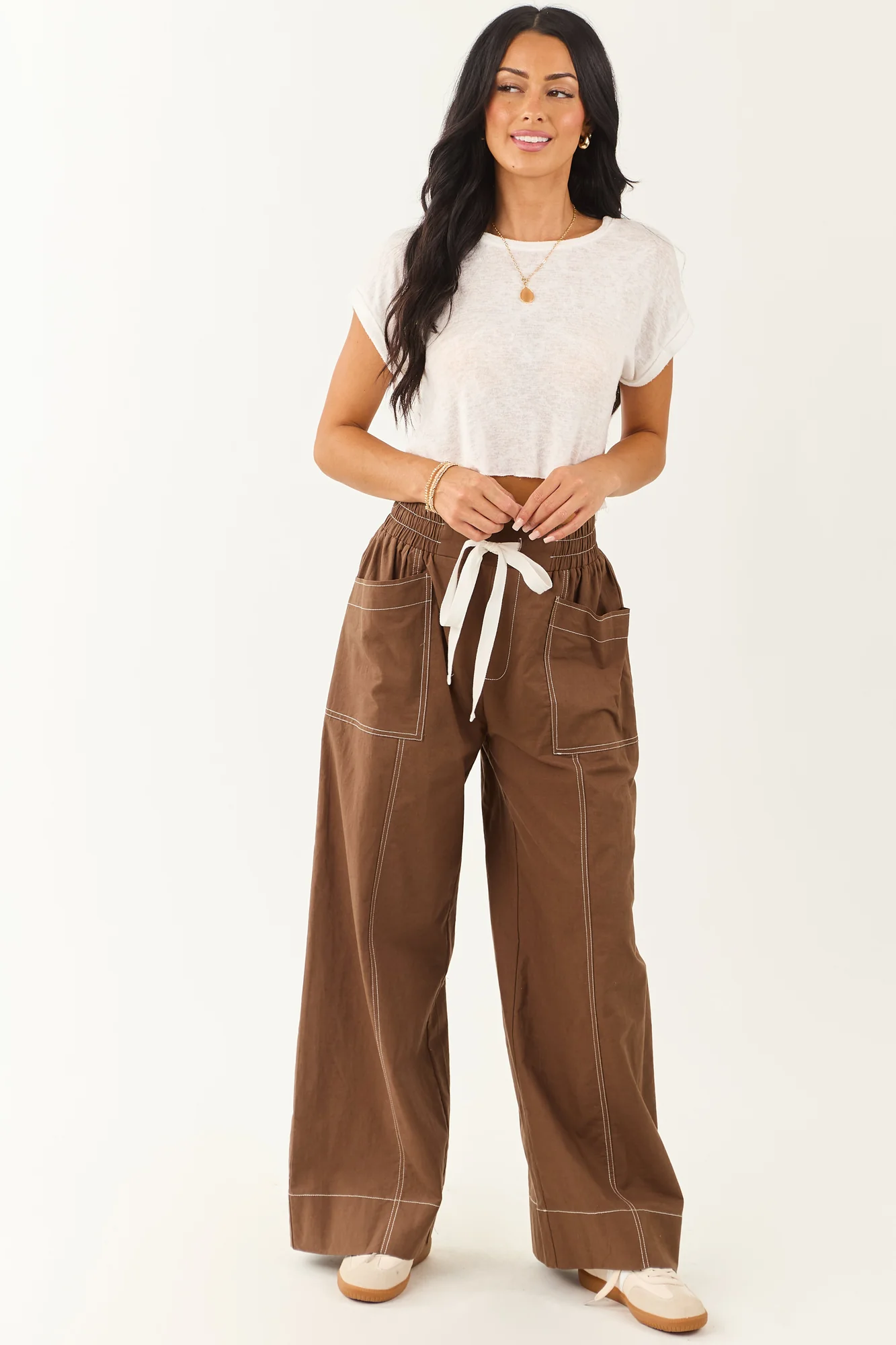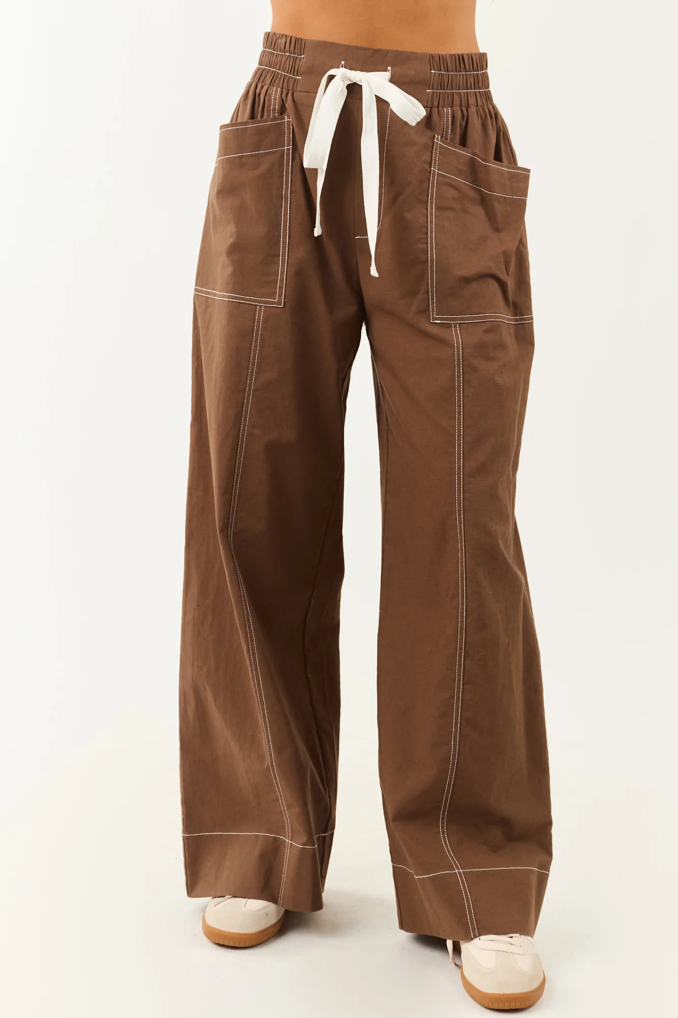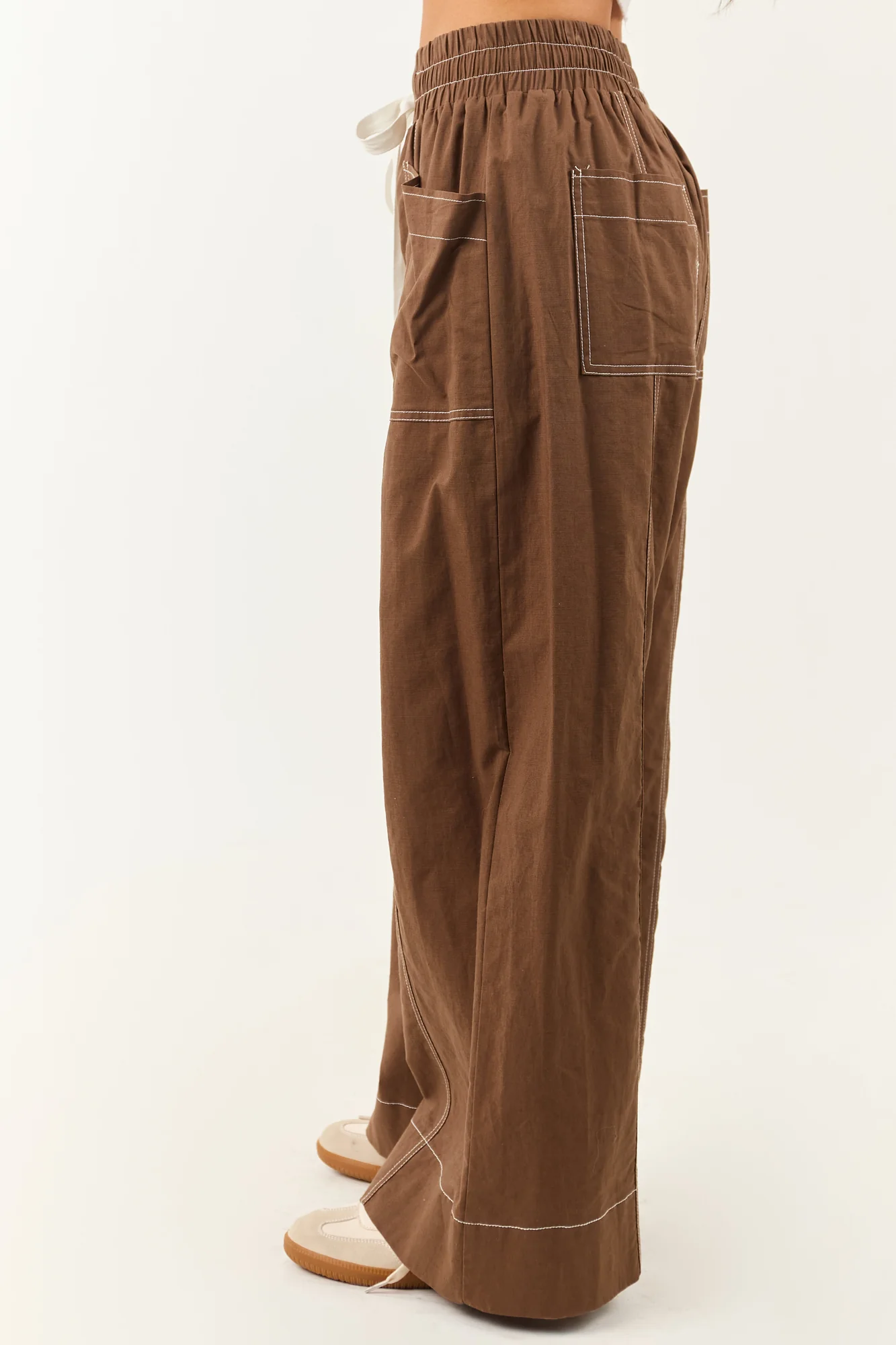 These flowy wide leg pants provide a comfortable all-day fit and neutral tone for mixing and matching. Featuring an adjustable drawstring waist, non-stretchy cotton linen blend, stretchy smocked waistband, 4 pockets, off-white contrast stitching, shorts lining, and a stylish design. Imported. Fits true to size. Ideal for casual or semi-formal occasions. Boost your wardrobe with these versatile pants that offer both style and comfort. Model is wearing size Small.