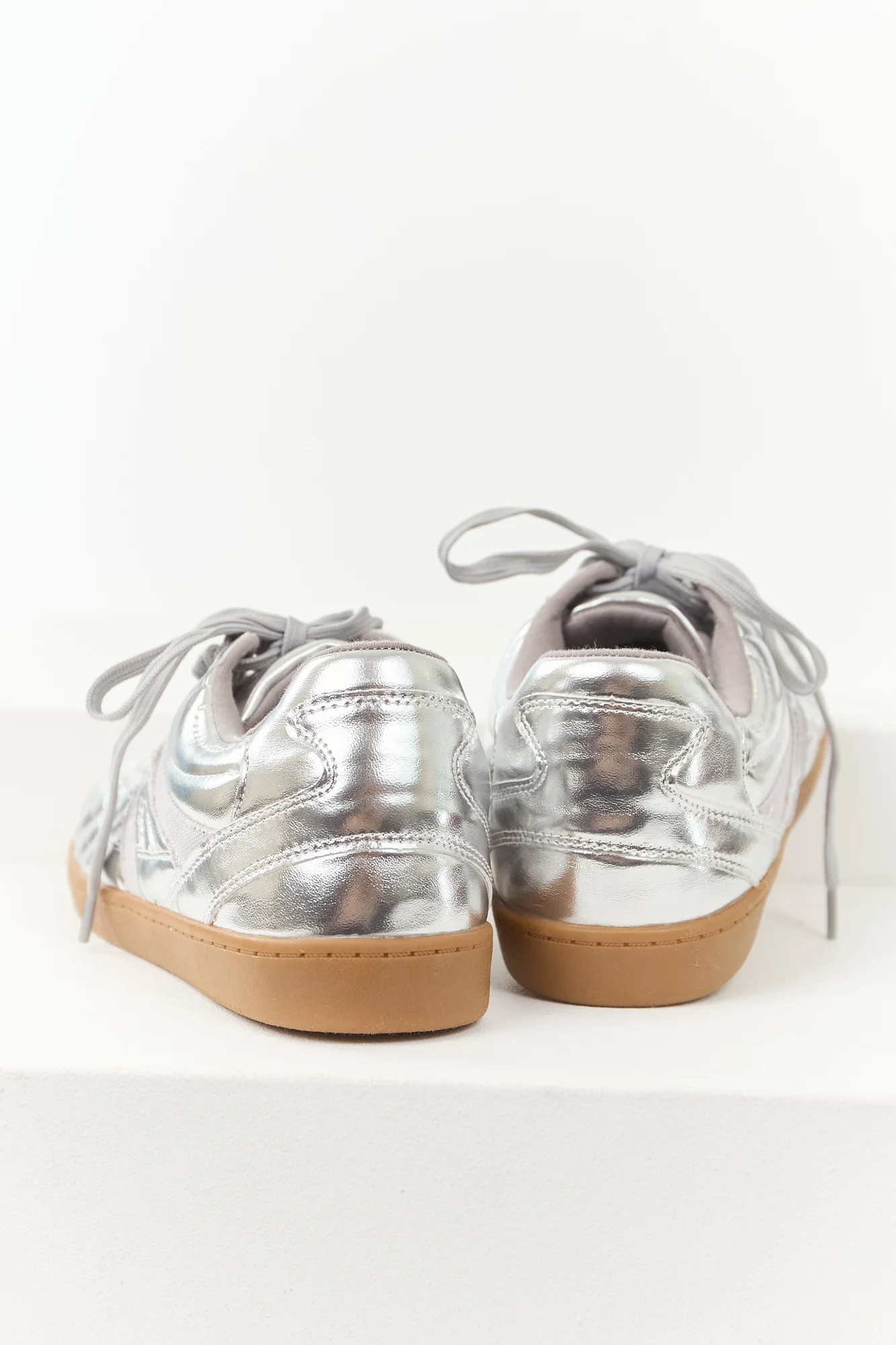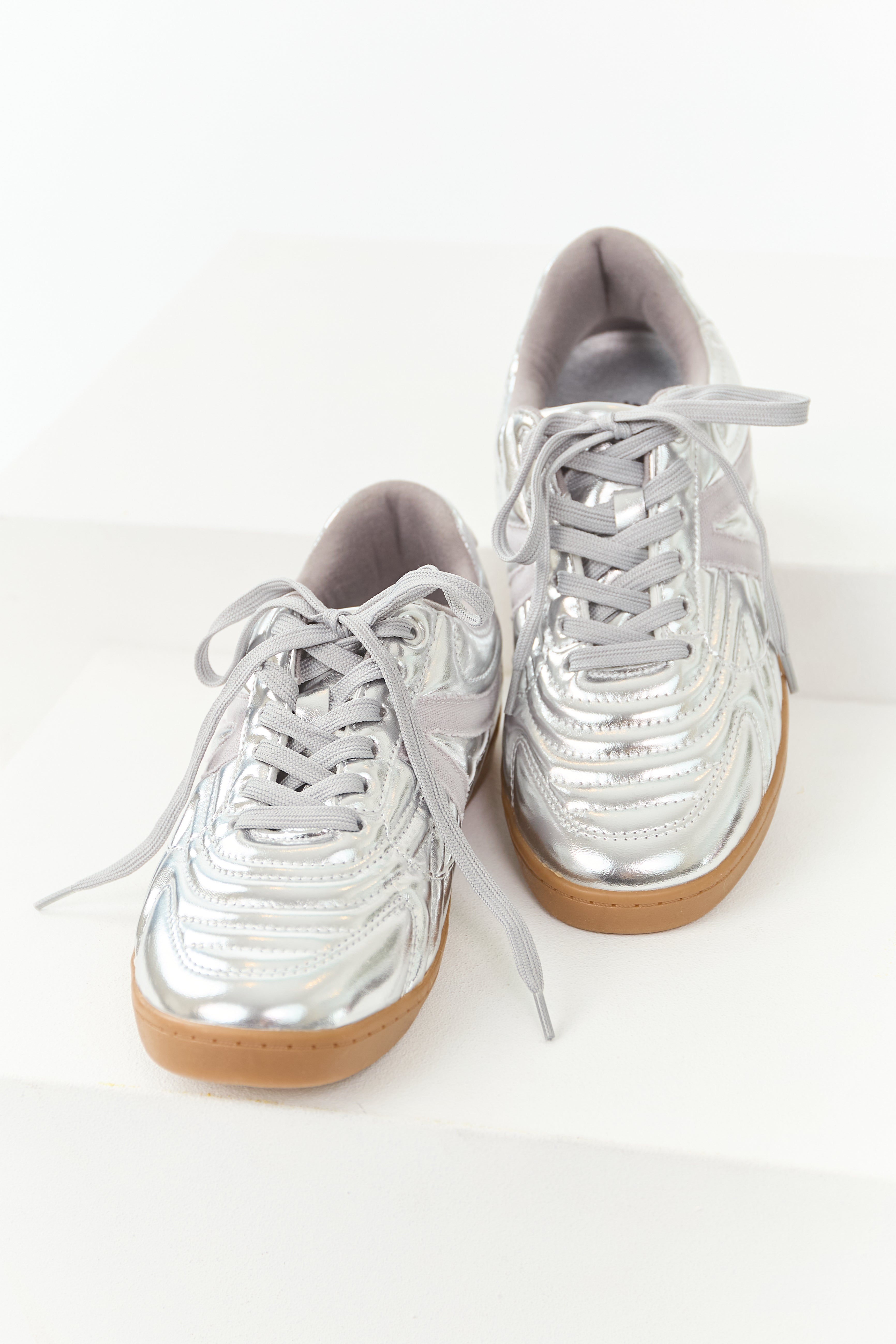 Indulge in comfort and style with these silver faux leather lace-up sneakers. Featuring pewter grey fabric contrast details, a contrast rubber sole, and a lightly cushioned insole for all-day wear. Elevate your look with a 1platform. Circumference measures 11 inches. Imported.