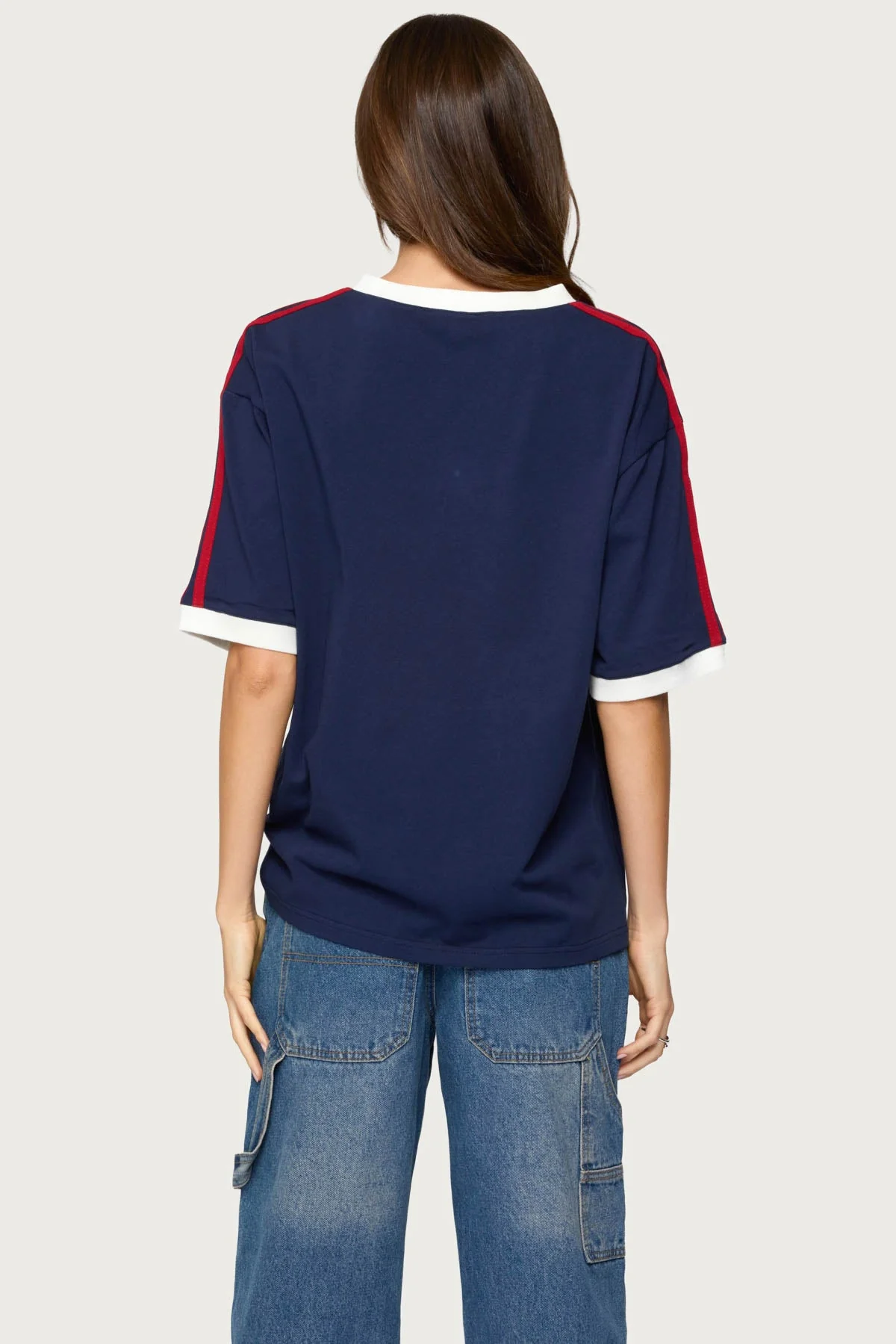 Upgrade your casual wardrobe with our Contrast Australia 96 Oversized T-Shirt featuring a V neckline, side shoulder stripes, and 100% Cotton comfort. Stand out with the Australia 96 graphic for fashionable flair. This tee is machine washable, ensuring easy care and lasting style. Available in five sizes: XS, S, M, L, XL.