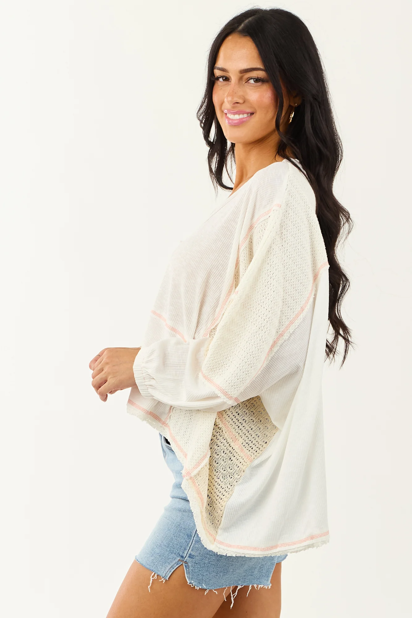 Experience ultimate comfort and style with our Contrast Knit Oversized Top in Cream and Baby Pink. This relaxed fit top features a two-tone texture, cozy stretchy knit, elastic cuffs, chest pocket, and high low hem. Made from 80% Polyester and 20% Cotton with a contrast of 65% Polyester and 35% Cotton for a fashionable look. Perfect for a casual day out or lounging at home. Available in sizes S, M, and L.