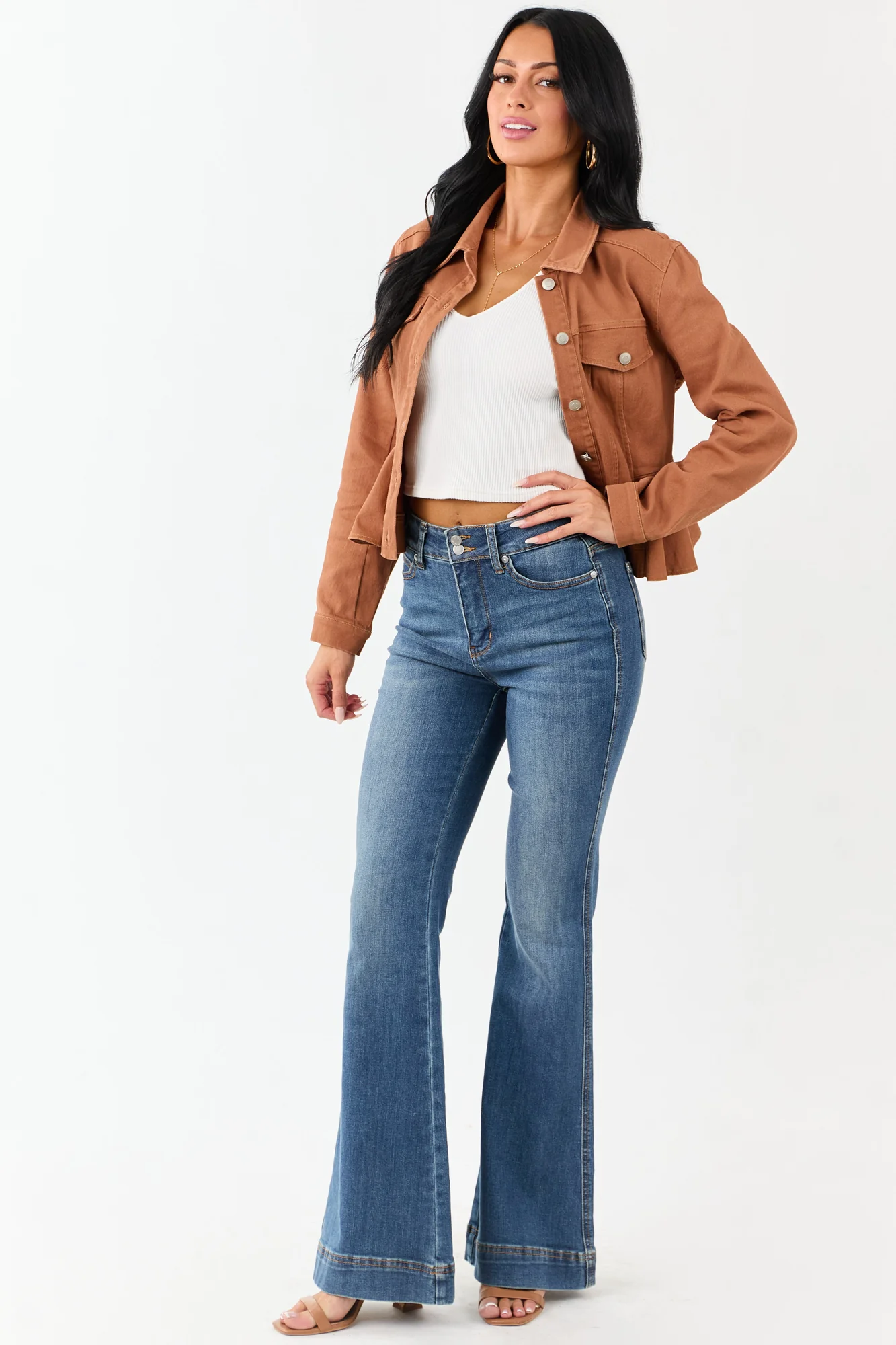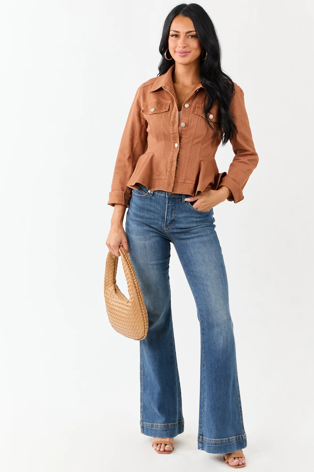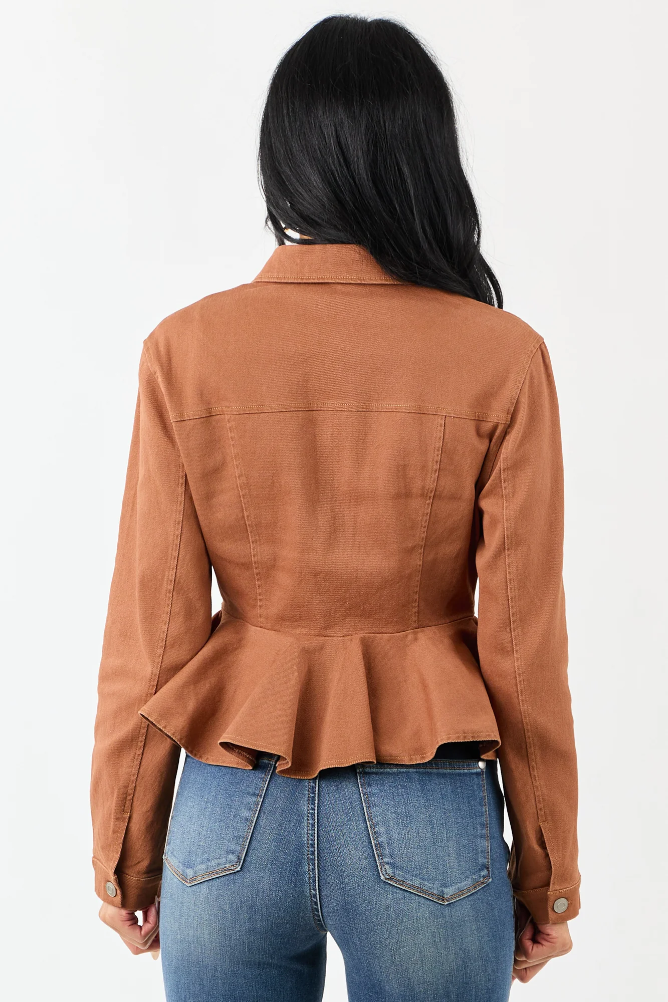 Elevate your style with our Copper Contrast Stitch Denim Peplum Jacket. This jacket boasts a flattering hourglass shape with a peplum flare, faux buttoned chest pockets, and button cuffs. The crisp contrast stitching adds a fresh twist to this classic piece. Made from 97% Rayon and 3% Spandex for comfort and style. Available in sizes S, M, and L. Model is wearing a size Small.