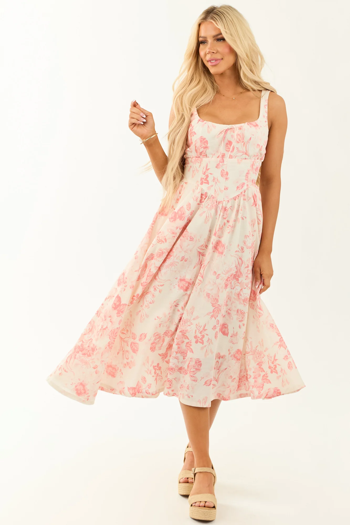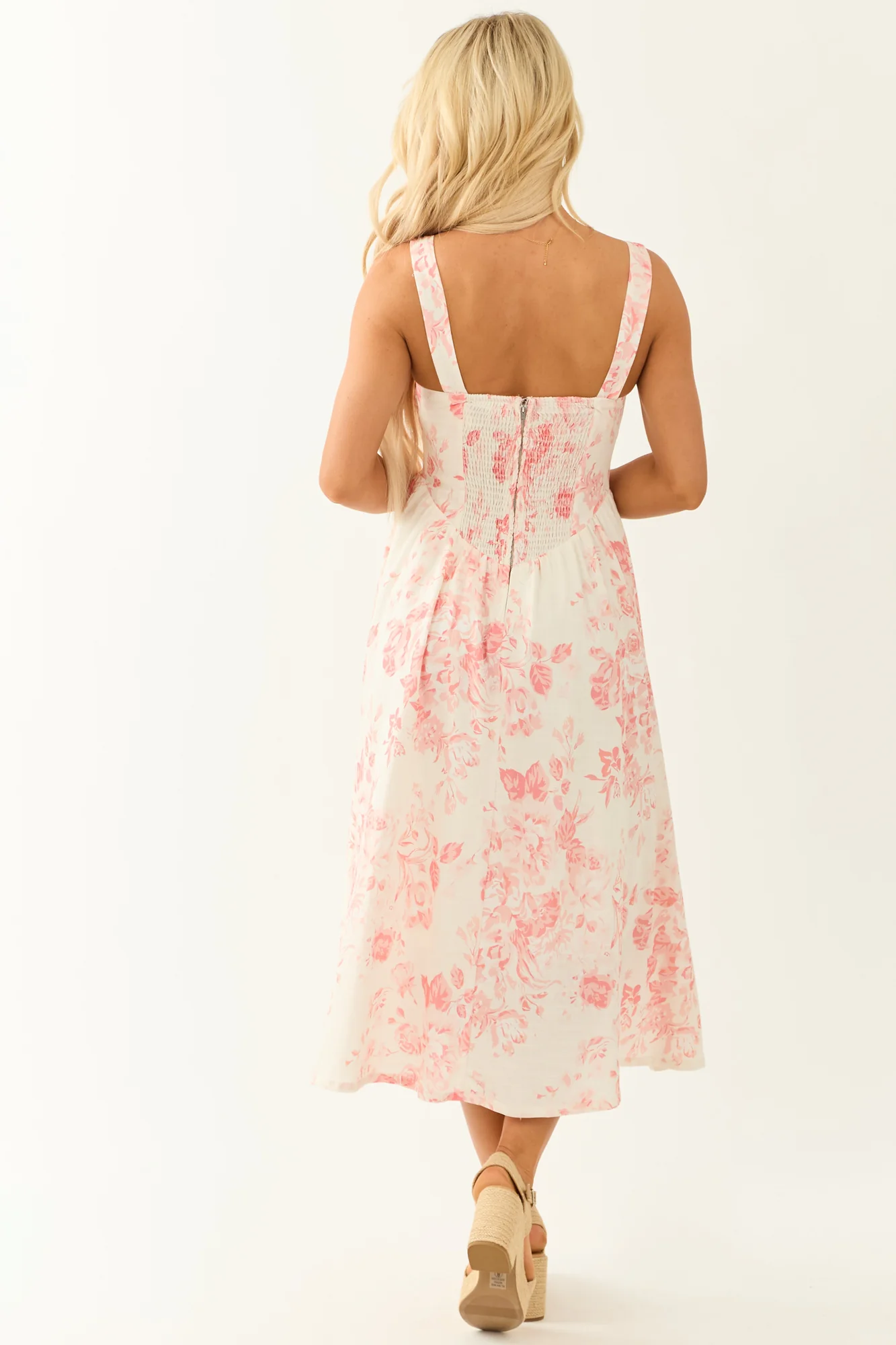 This charming Coral Floral Print Linen Sleeveless Midi Dress comes in S, M, and L sizes. Embrace soft femininity with its forgiving waist, flowy non-stretchy skirt, and breezy linen blend in Blush, Carnation, and Coral tones. Accented with a smocked elastic back, adjustable button straps, and side pockets for practicality. Perfect for any summer occasion! Please note that each piece may vary slightly due to the unique cutting and sewing process. Imported. Self: 70% Viscose, 30% Linen. Lining: 100% Rayon.
