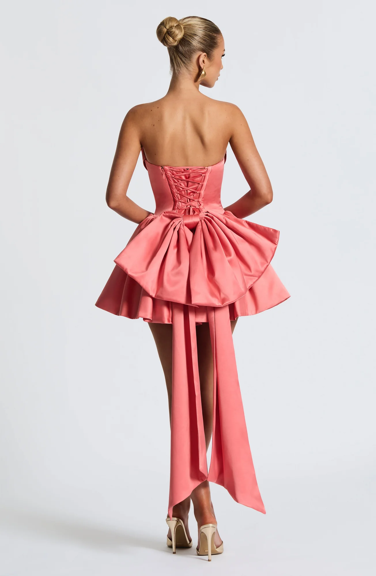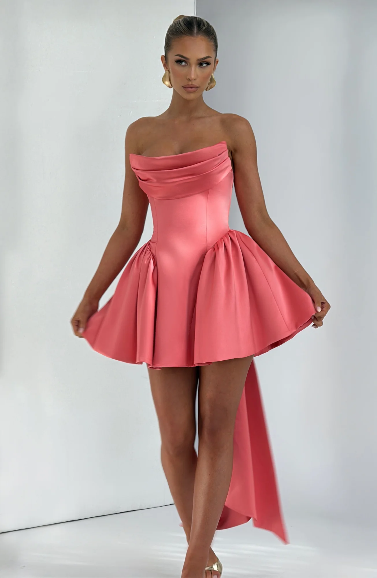 Dress to impress with our Coral Pink Stretch Satin Mini Dress from R.F. This mini length dress features a scooped, strapless neckline with cowl detailing and boning in the bodice for added flair. The full skirt includes pleated godet panels on the hips and tulle attached to the lining for volume. Complete with a lace-up back and detachable bow with long, dramatic tails for a memorable look. Stay comfortable and stylish in this fully lined dress with invisible zipper closure. Perfect for birthdays, brunches, daytime events, evenings, parties, and more.