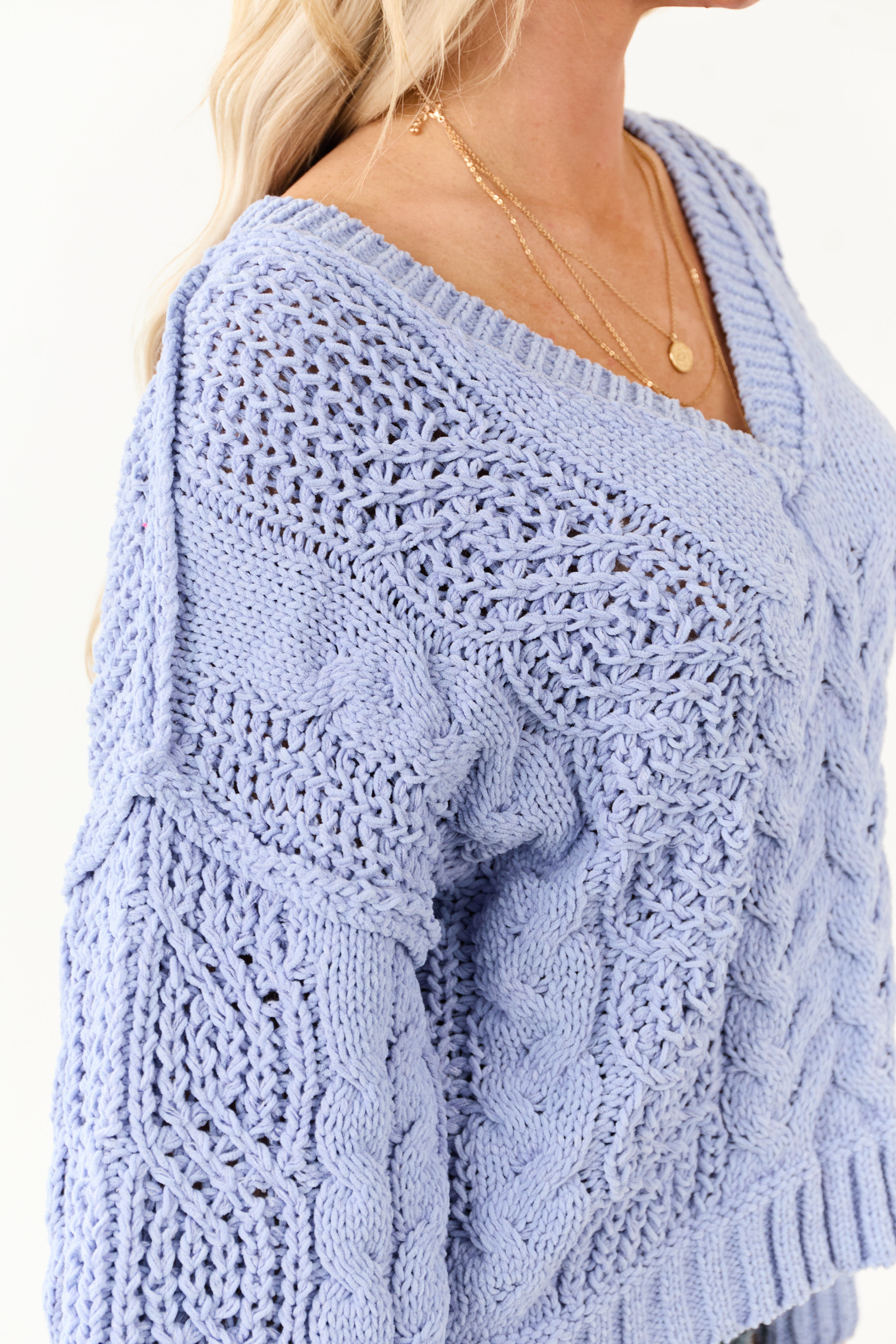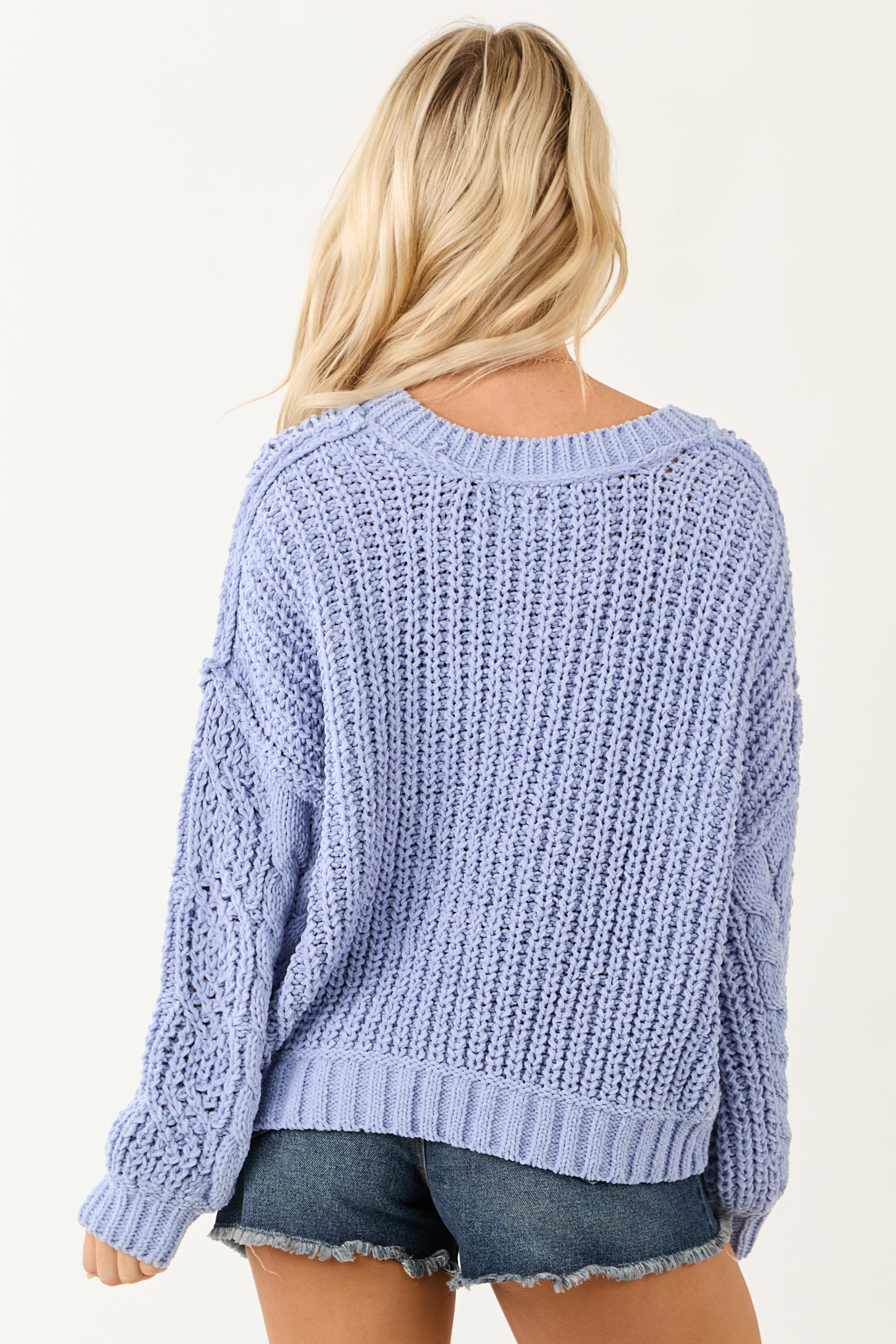 Indulge in cozy luxury with our Cornflower Cable Knit Bubble Sleeve Sweater. Crafted from soft and stretchy cable knit, this oversized sweater with bubble sleeves offers timeless comfort. Designed with a relaxed V-neck and ribbed trim, it exudes effortless style for any occasion. Elevate your wardrobe with this must-have piece for a chic and snug look that never goes out of style. Embrace comfort and fashion with this versatile sweater in three sizes: S, M, and L.